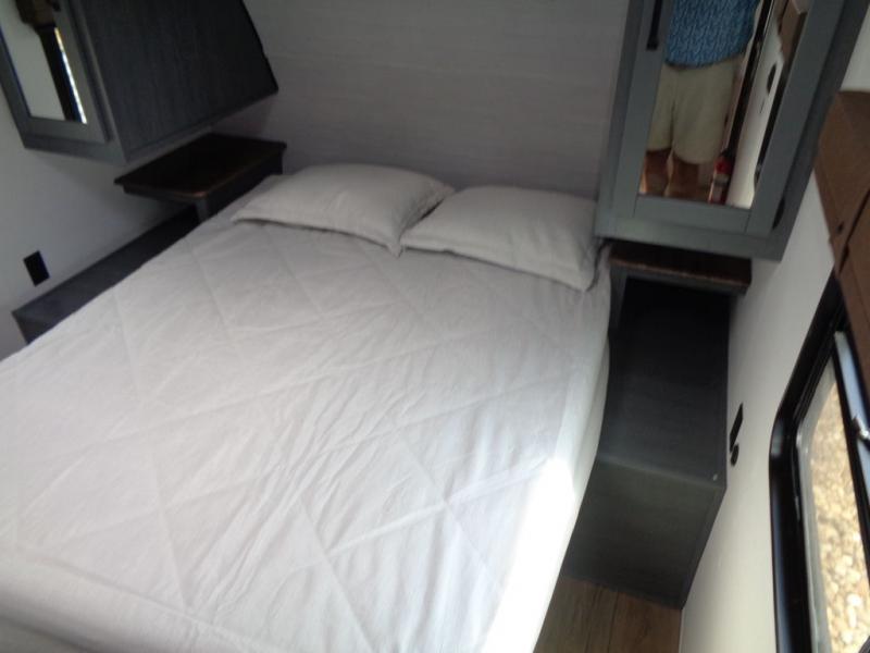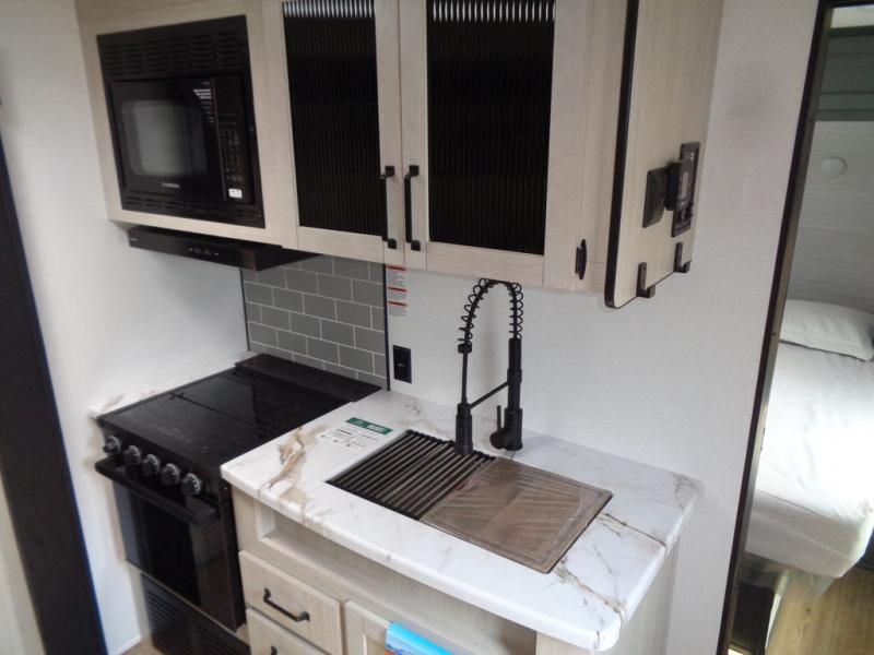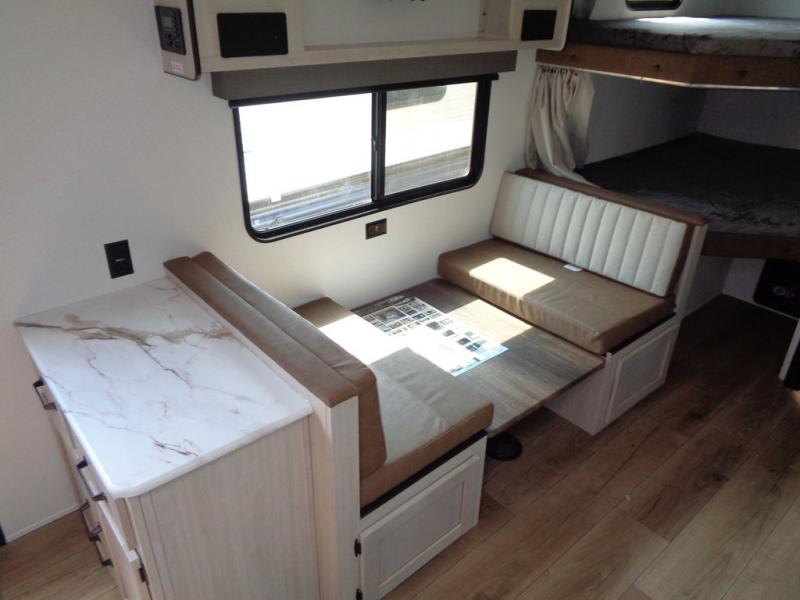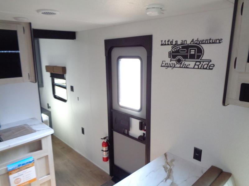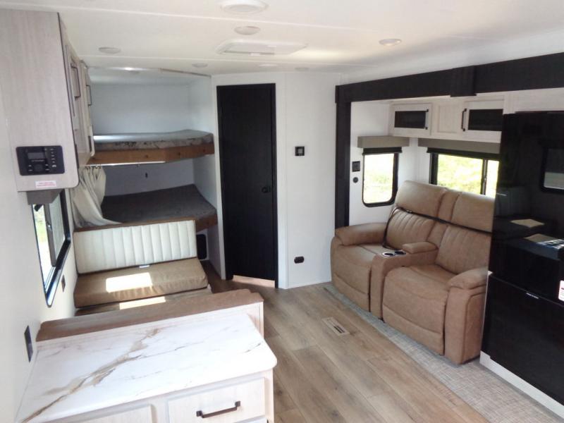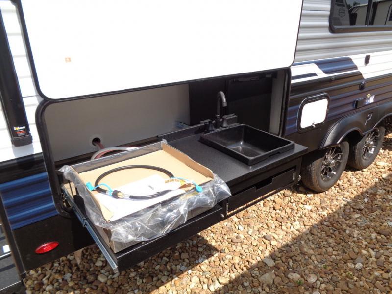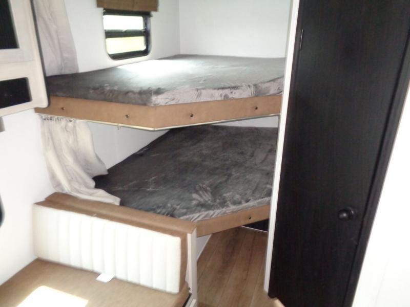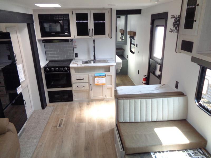 There's room for the whole family in this travel trailer! You will enjoy your own privacy with the front private bedroom which features a 60" x 80" queen bed with shirt closets on either side to hang your clothes, and a shelf above for your books or alarm clock. The kiddos can sleep on the set of 48" x 76" double-size bunk beds. They can even invite a friend or two to join in on the fun and sleep on either the sofa or booth dinette once converted. Everyone can freshen up in the rear corner bathroom with a 32" x 40" shower with a seat, and keep their bellies full with the stainless steel oven and range. You could even choose to add the optional outside mini kitchen if you enjoy cooking outdoors!