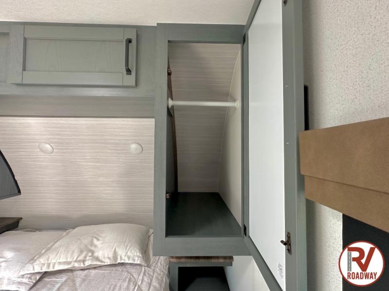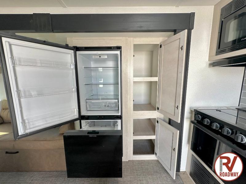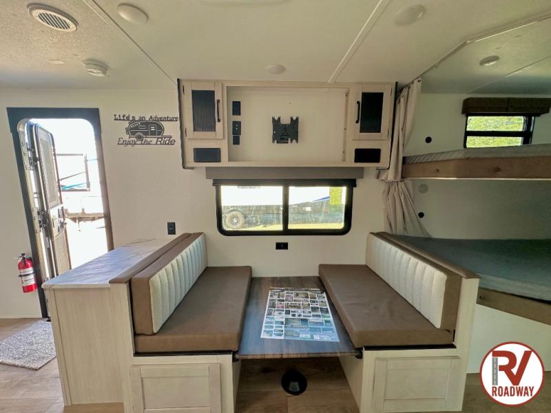 There's room for the whole family in this travel trailer! You will enjoy your own privacy with the front private bedroom which features a 60" x 80" queen bed with shirt closets on either side to hang your clothes, and a shelf above for your books or alarm clock. The kiddos can sleep on the set of 48" x 76" double-size bunk beds. They can even invite a friend or two to join in on the fun and sleep on either the sofa or booth dinette once converted. Everyone can freshen up in the rear corner bathroom with a 32" x 40" shower with a seat and keep their bellies full with the stainless-steel oven and range. You could even choose to add the optional outside mini kitchen if you enjoy cooking outdoors!