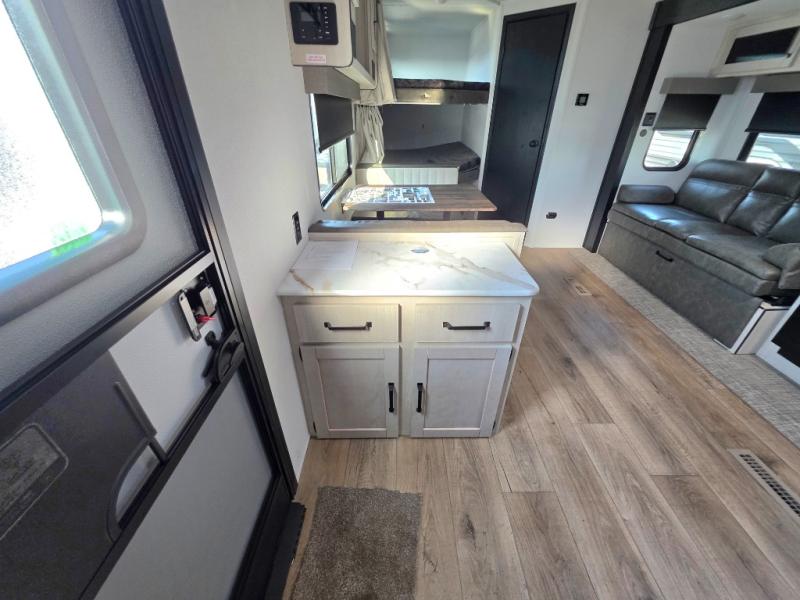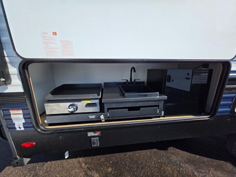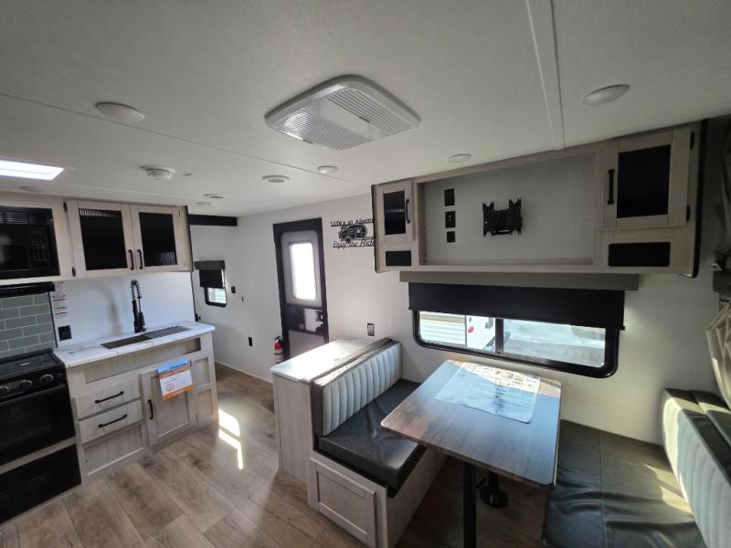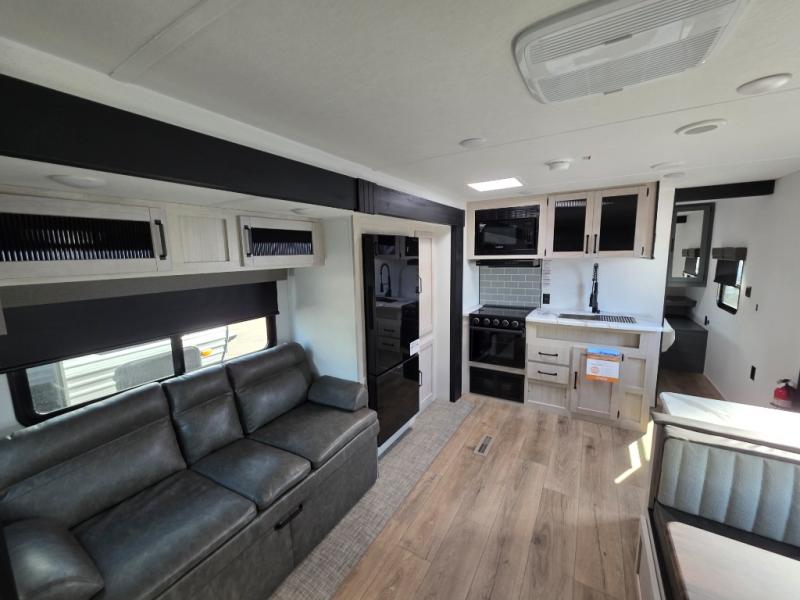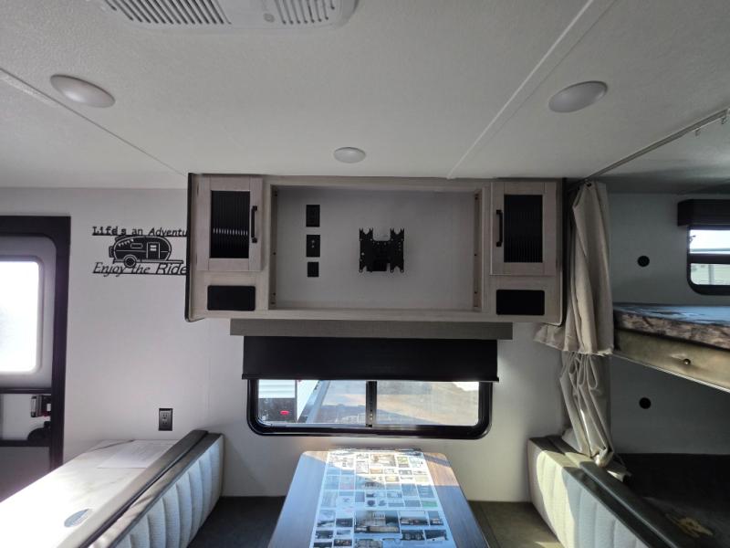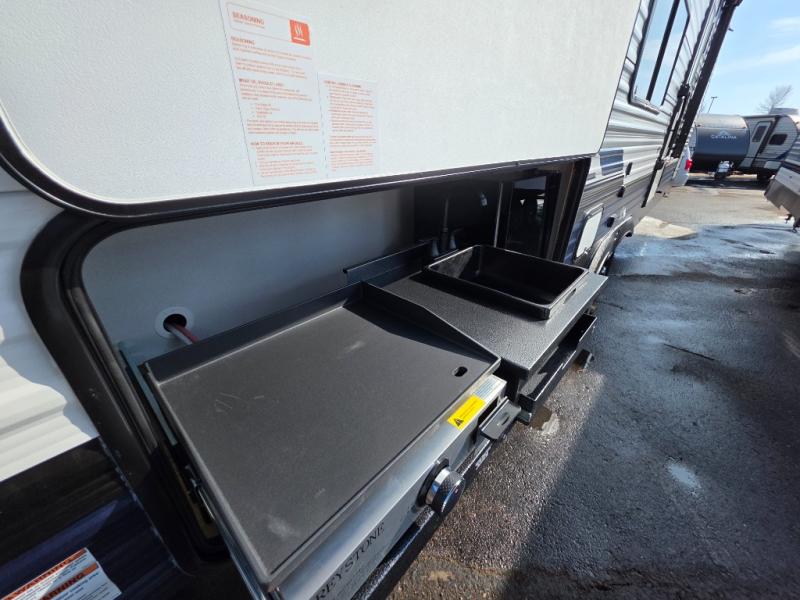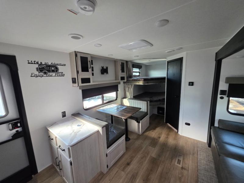There's room for the whole family in this travel trailer! You will enjoy your own privacy with the front private bedroom which features a 60" x 80" queen bed with shirt closets on either side to hang your clothes, and a shelf above for your books or alarm clock. The kiddos can sleep on the set of 48" x 76" double-size bunk beds. They can even invite a friend or two to join in on the fun and sleep on either the sofa or booth dinette once converted. Everyone can freshen up in the rear corner bathroom with a 32" x 40" shower with a seat and keep their bellies full with the stainless-steel oven and range. You could even choose to add the optional outside mini kitchen if you enjoy cooking outdoors!