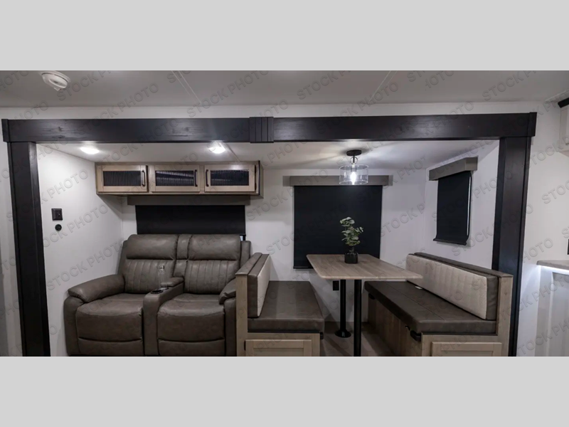 Walk into this travel trailer with one of the dual entry doors for a great camping trip! One entrance enters directly into the rear private bedroom which has a queen bed slide, a walk-in closet with washer and dryer prep, a wardrobe, and even an entrance into the dual entry bathroom. Grab a snack from the walk-in pantry then relax on the sofa while you watch a movie with the entertainment center or play a game at the booth dinette. The front kitchen has everything you will need to prepare your best home cooked meals including lots of countertop space, a stainless steel oven and range, and a stainless steel microwave!