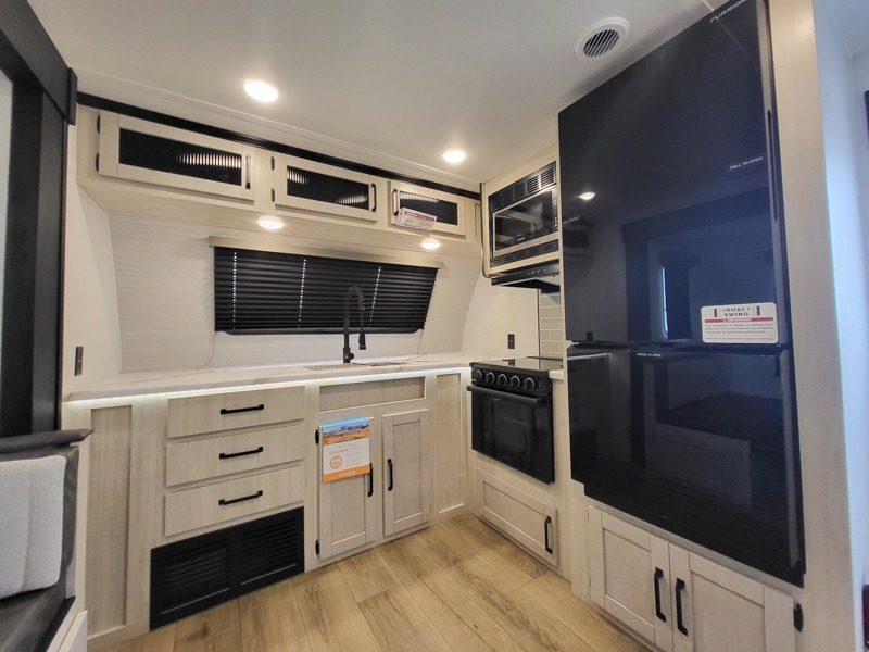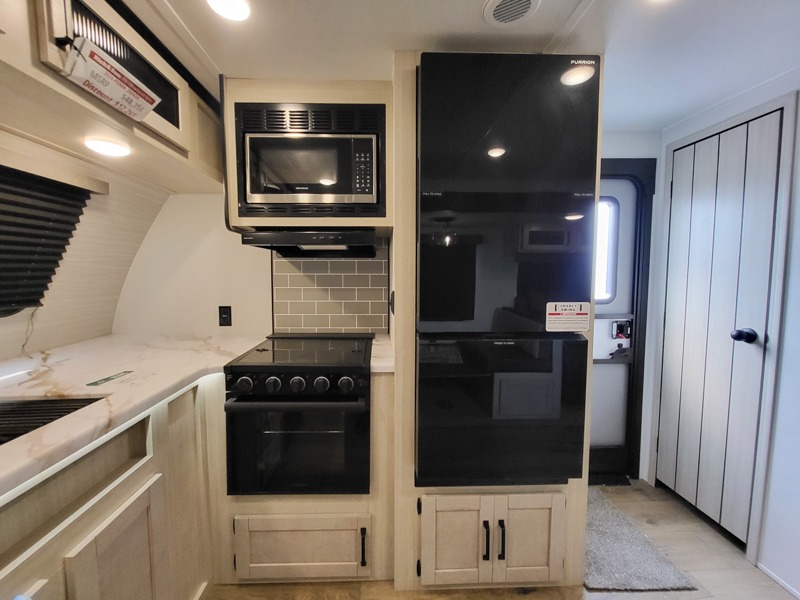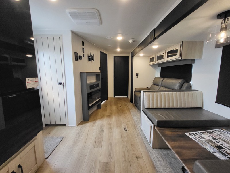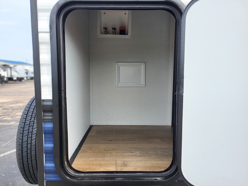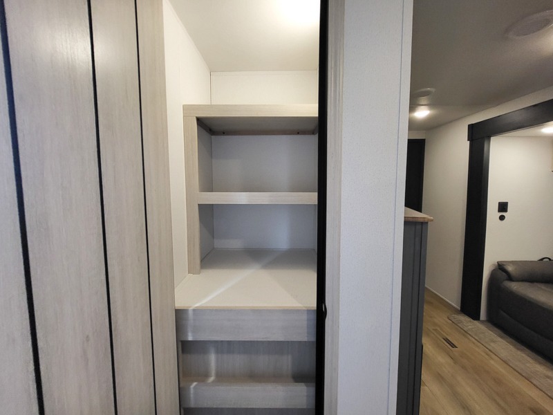 Walk into this travel trailer with one of the dual entry doors for a great camping trip! One entrance enters directly into the rear private bedroom which has a queen bed slide, a walk-in closet with washer and dryer prep, a wardrobe, and even an entrance into the dual entry bathroom. Grab a snack from the walk-in pantry then relax on the sofa while you watch a movie with the entertainment center or play a game at the booth dinette. The front kitchen has everything you will need to prepare your best home cooked meals including lots of countertop space, a stainless steel oven and range, and a stainless steel microwave!