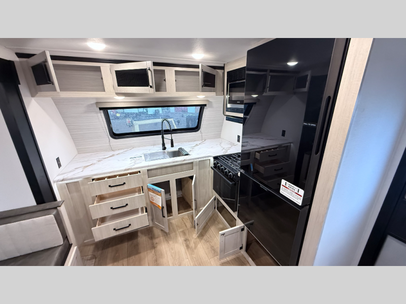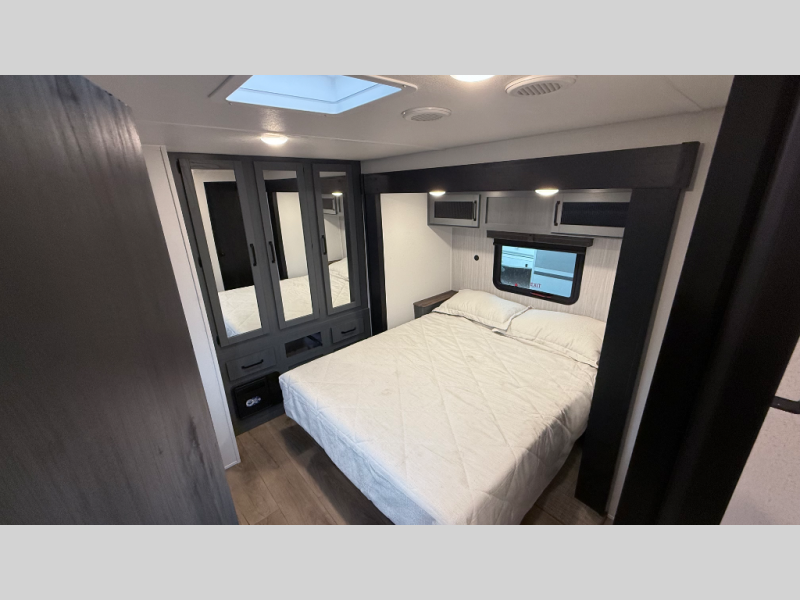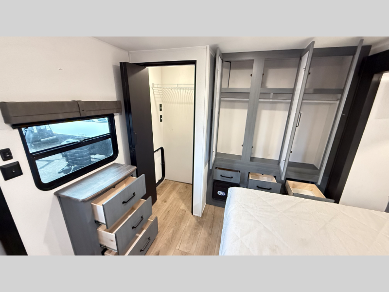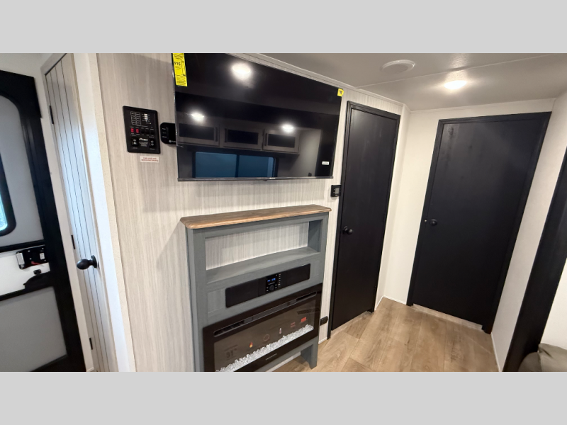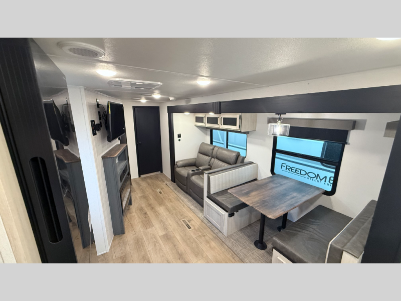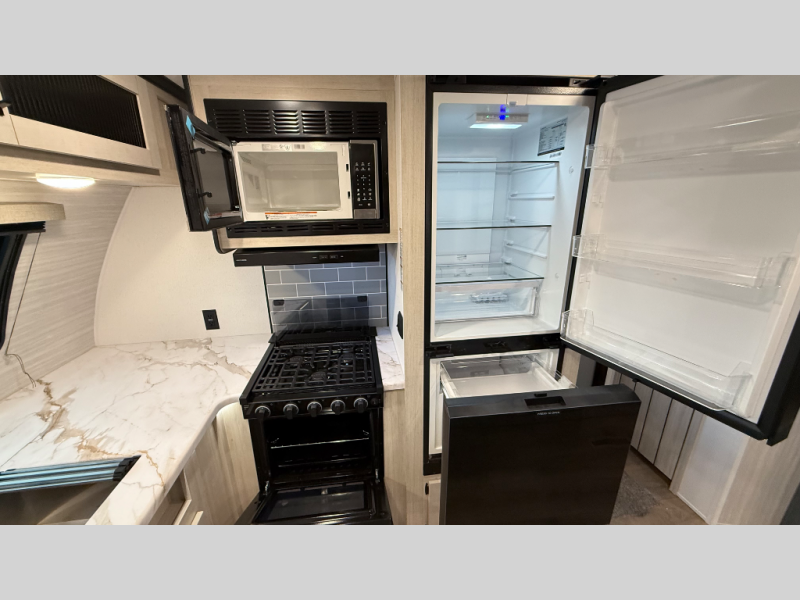 Walk into this travel trailer with one of the dual entry doors for a great camping trip! One entrance enters directly into the rear private bedroom which has a queen bed slide, a walk-in closet with washer and dryer prep, a wardrobe, and even an entrance into the dual entry bathroom. Grab a snack from the walk-in pantry then relax on the sofa while you watch a movie with the entertainment center or play a game at the booth dinette. The front kitchen has everything you will need to prepare your best home cooked meals including lots of countertop space, a stainless steel oven and range, and a stainless steel microwave!