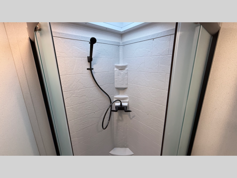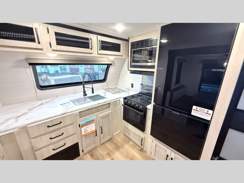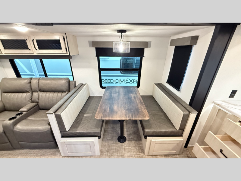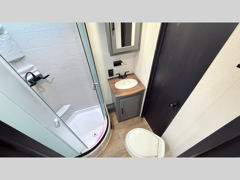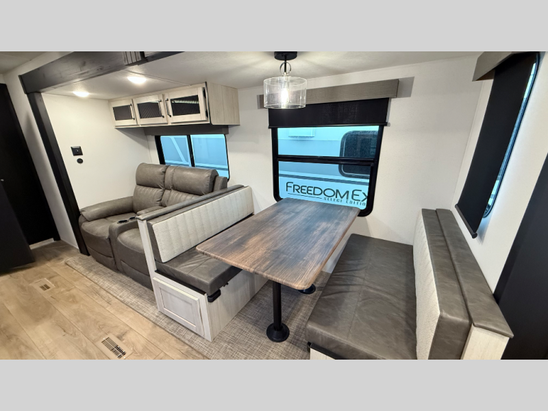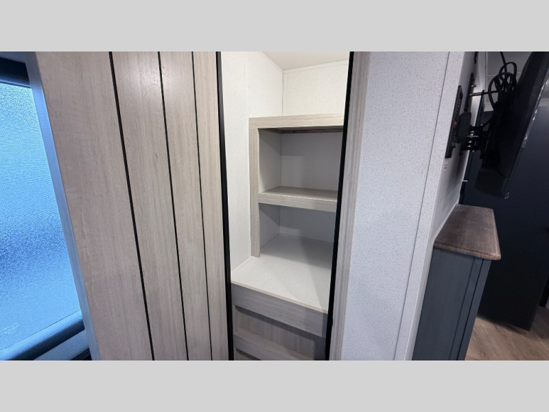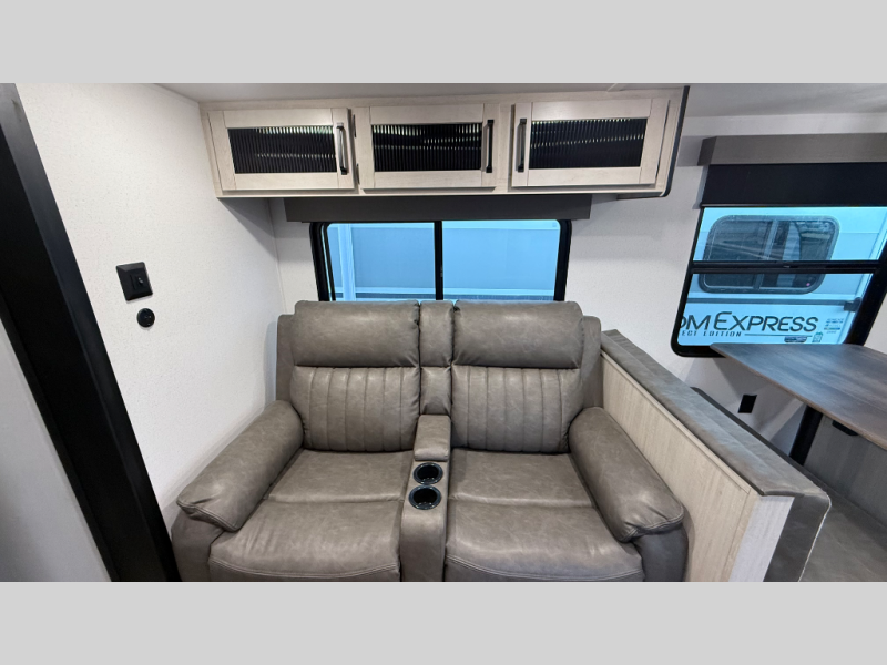 Walk into this travel trailer with one of the dual entry doors for a great camping trip! One entrance enters directly into the rear private bedroom which has a queen bed slide, a walk-in closet with washer and dryer prep, a wardrobe, and even an entrance into the dual entry bathroom. Grab a snack from the walk-in pantry then relax on the sofa while you watch a movie with the entertainment center or play a game at the booth dinette. The front kitchen has everything you will need to prepare your best home cooked meals including lots of countertop space, a stainless steel oven and range, and a stainless steel microwave!