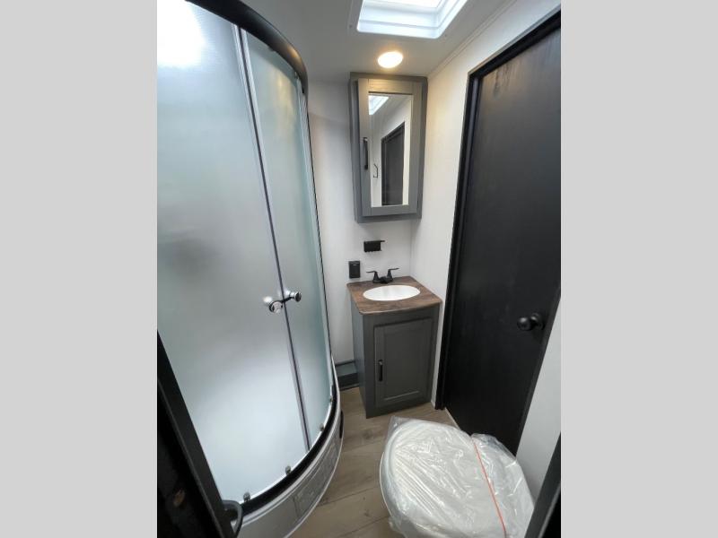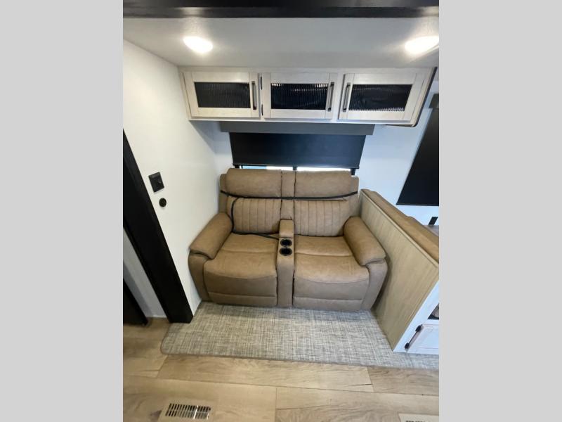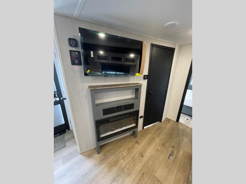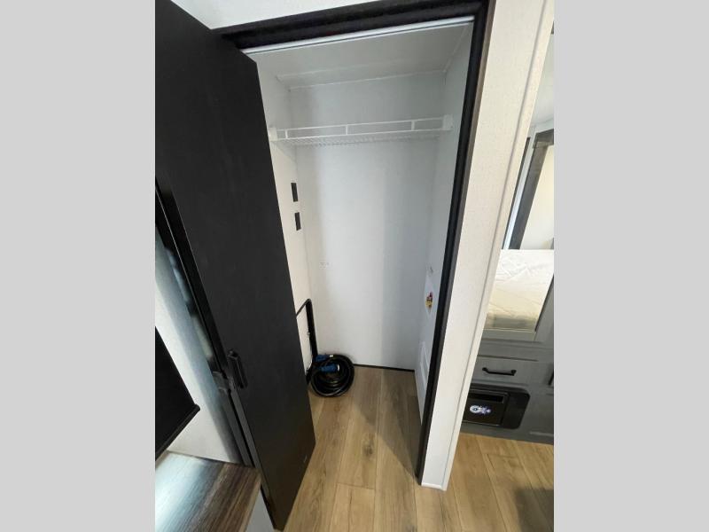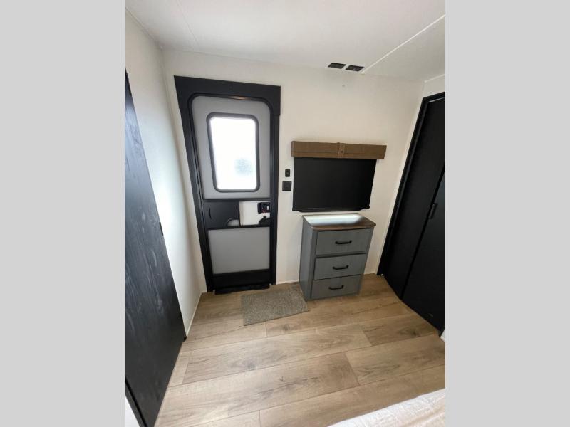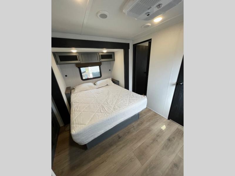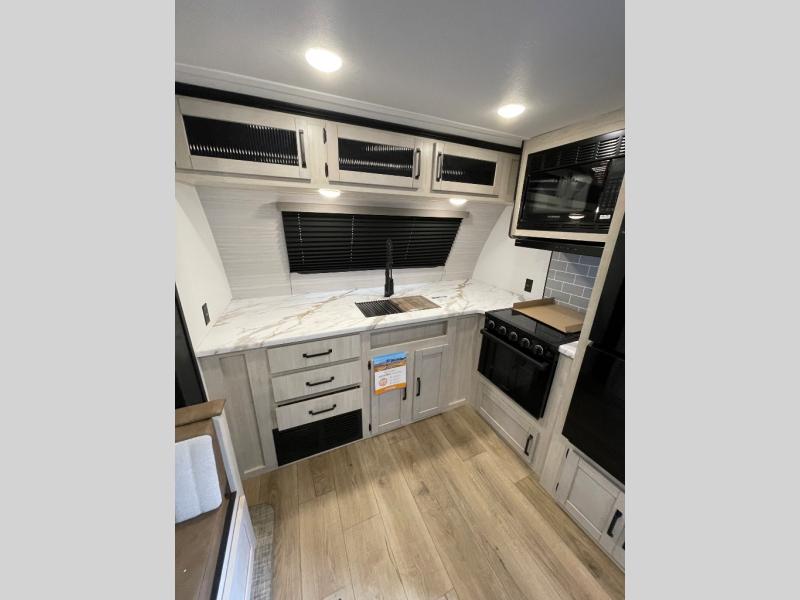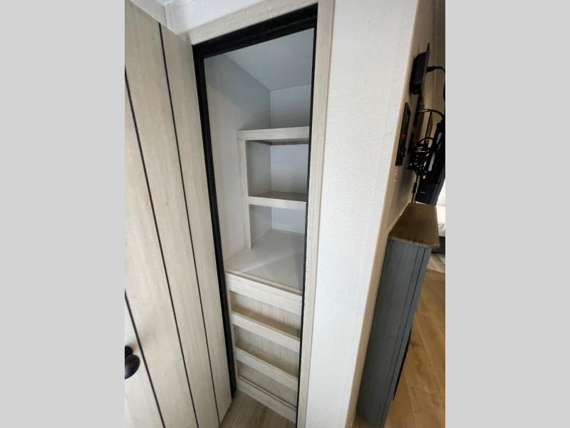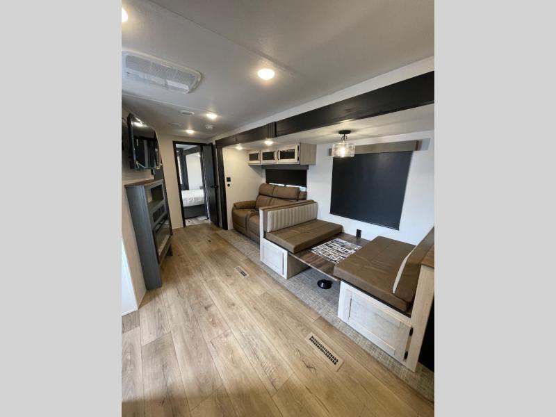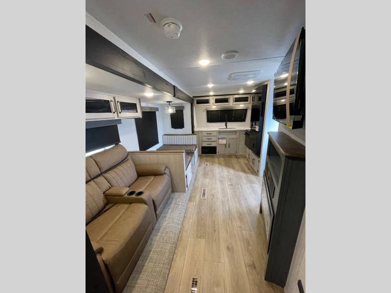 Walk into this travel trailer with one of the dual entry doors for a great camping trip! One entrance enters directly into the rear private bedroom which has a queen bed slide, a walk-in closet with washer and dryer prep, a wardrobe, and even an entrance into the dual entry bathroom. Grab a snack from the walk-in pantry then relax on the sofa while you watch a movie with the entertainment center or play a game at the booth dinette. The front kitchen has everything you will need to prepare your best home cooked meals including lots of countertop space, a stainless-steel oven and range, and a stainless-steel microwave!