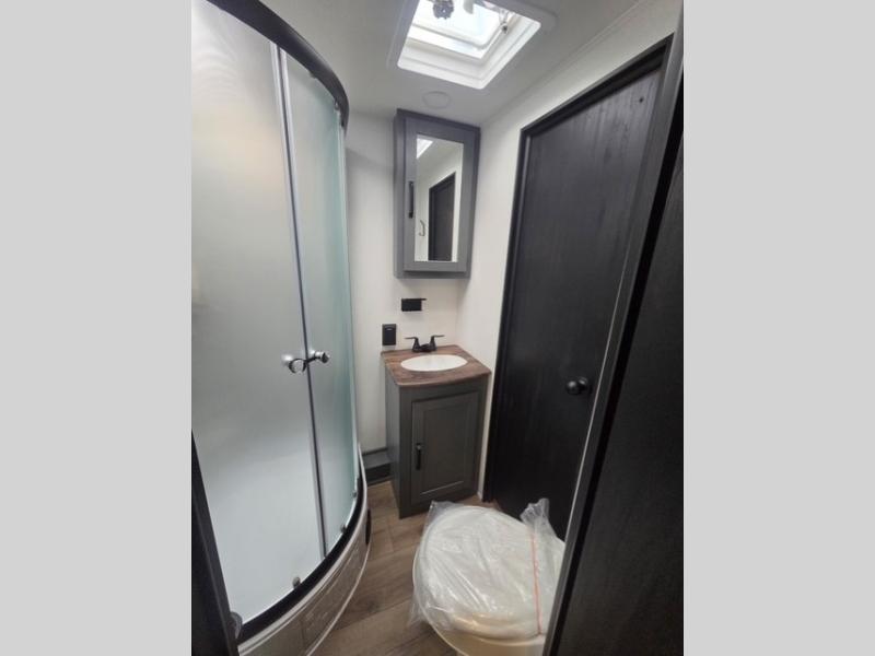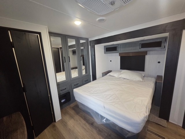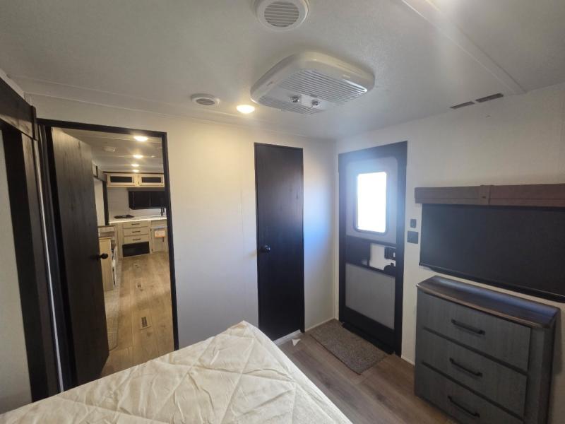 Walk into this travel trailer with one of the dual entry doors for a great camping trip! One entrance enters directly into the rear private bedroom which has a queen bed slide, a walk-in closet with washer and dryer prep, a wardrobe, and even an entrance into the dual entry bathroom. Grab a snack from the walk-in pantry then relax on the sofa while you watch a movie with the entertainment center or play a game at the booth dinette. The front kitchen has everything you will need to prepare your best home cooked meals including lots of countertop space, a stainless-steel oven and range, and a stainless-steel microwave!