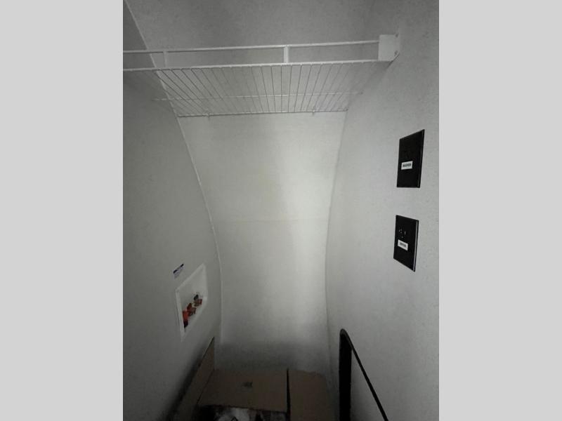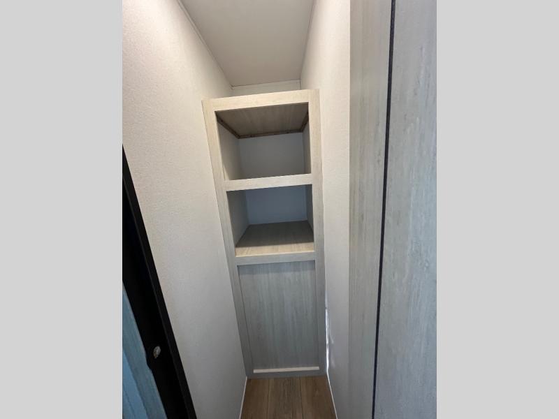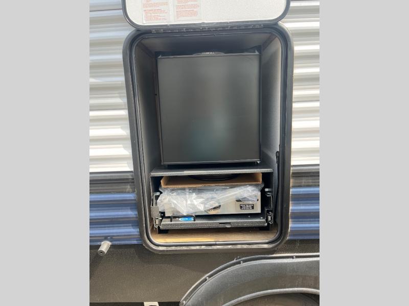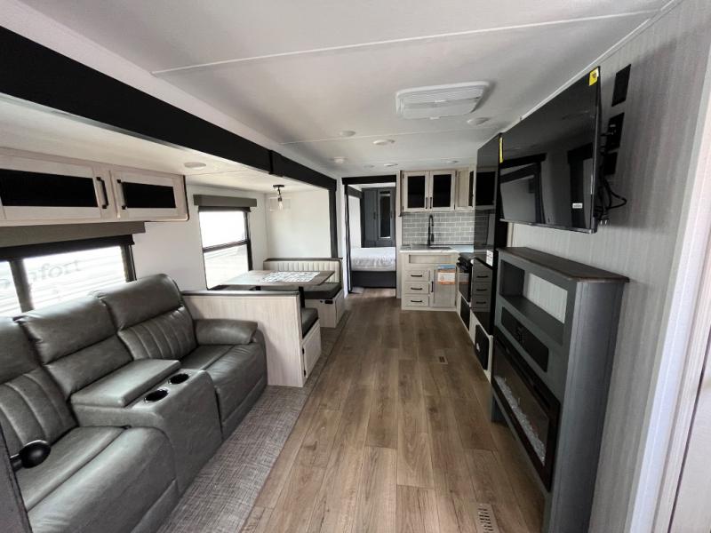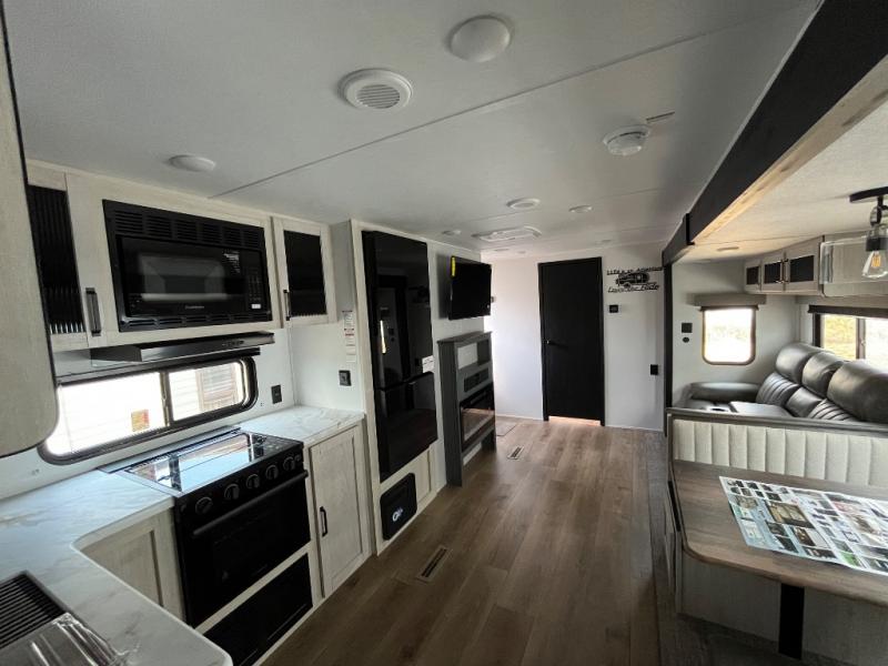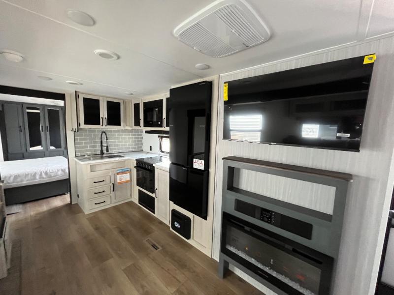 Head to the lake in this double slide out travel trailer that can sleep four to five each night. You will love having the front private bedroom all to yourselves that includes a queen bed slide out, a front wardrobe, a closet with washer and dryer prep, plus your own exterior entry door. Your guests can sleep on the sofa and booth dinette within the second slide out, and the full rear bath is tucked away for privacy. This model also includes an entryway closet/pantry for food storage and jackets, and the fireplace across from the sofa makes your space more cozy. An optional outside micro kitchen is available also if you like to cook outdoors!