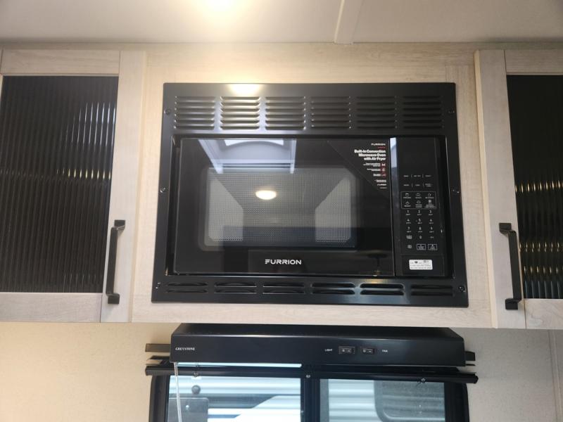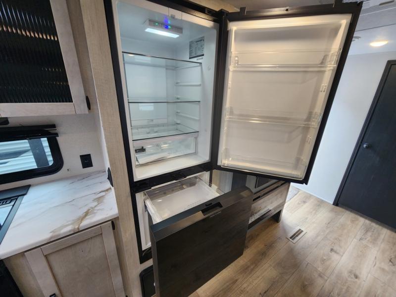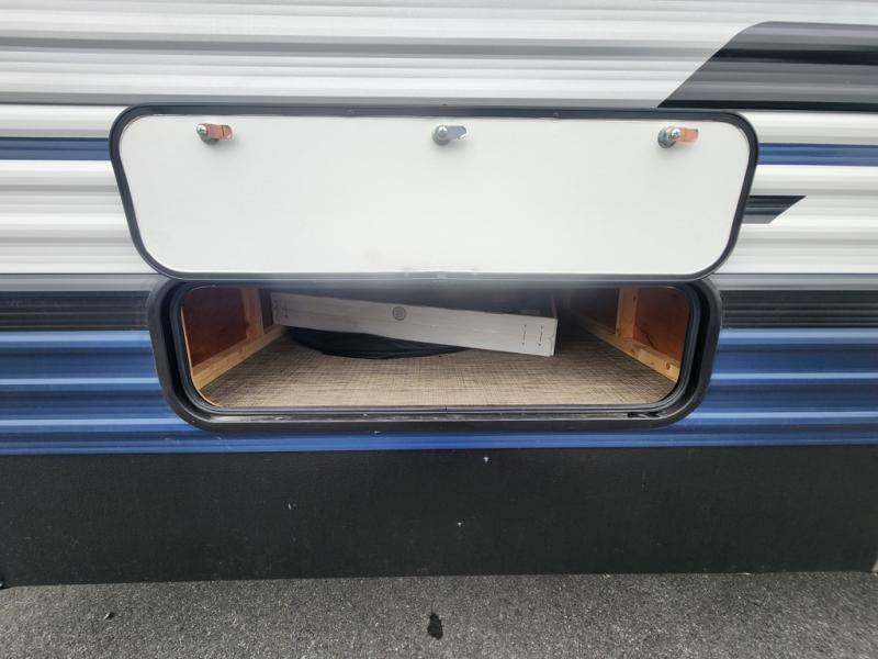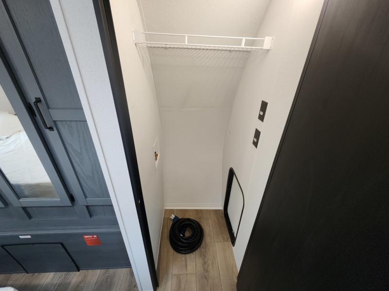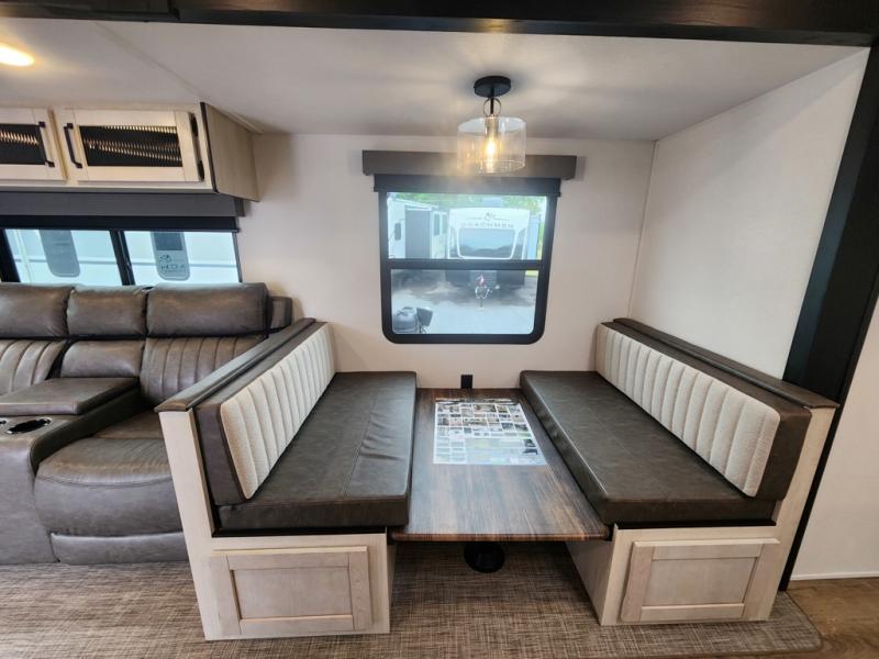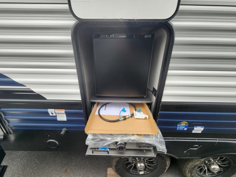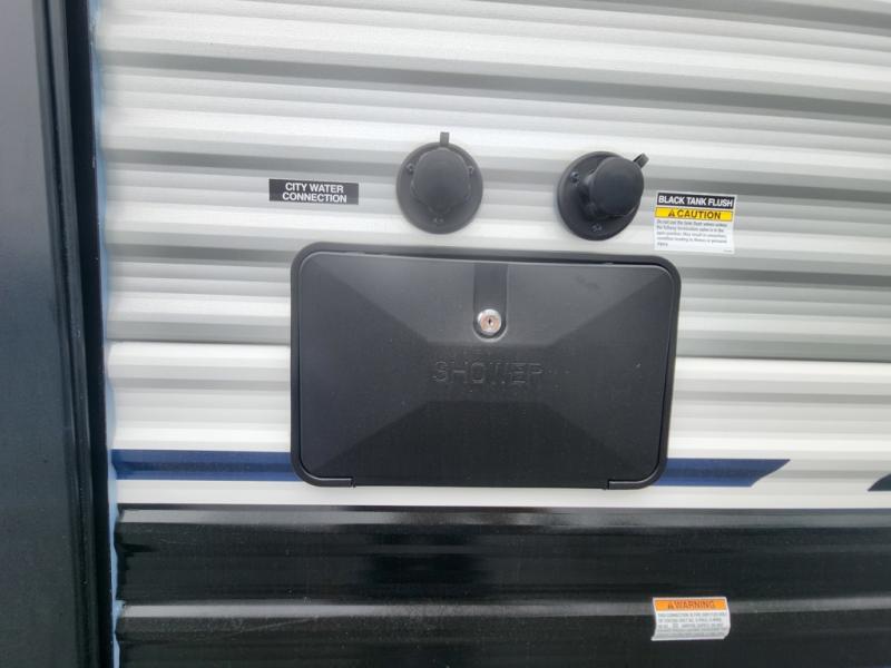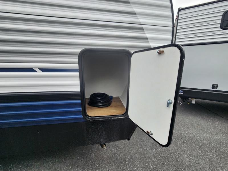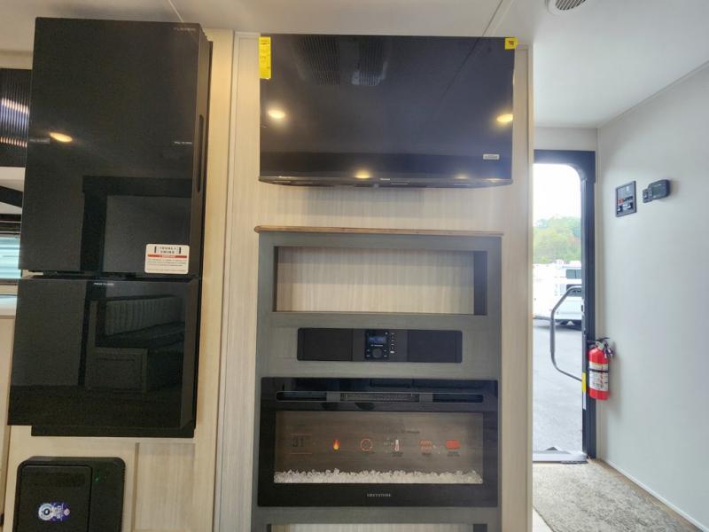 Head to the lake in this double slide out travel trailer that can sleep four to five each night. You will love having the front private bedroom all to yourselves that includes a queen bed slide out, a front wardrobe, a closet with washer and dryer prep, plus your own exterior entry door. Your guests can sleep on the sofa and booth dinette within the second slide out, and the full rear bath is tucked away for privacy. This model also includes an entryway closet/pantry for food storage and jackets, and the fireplace across from the sofa makes your space more cozy. An optional outside micro kitchen is available also if you like to cook outdoors!