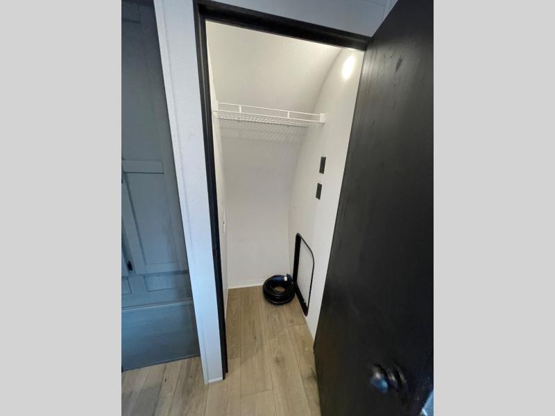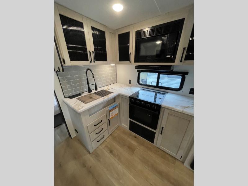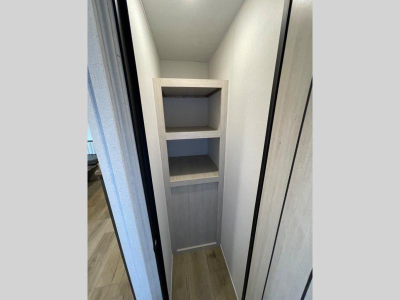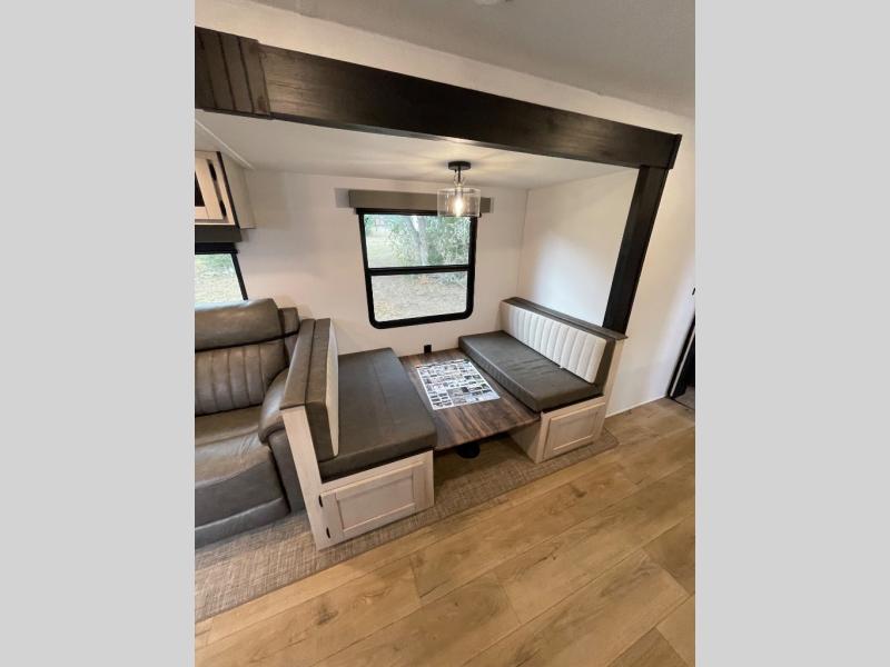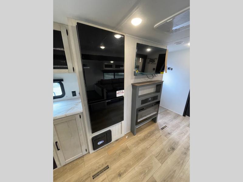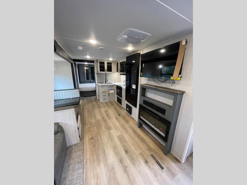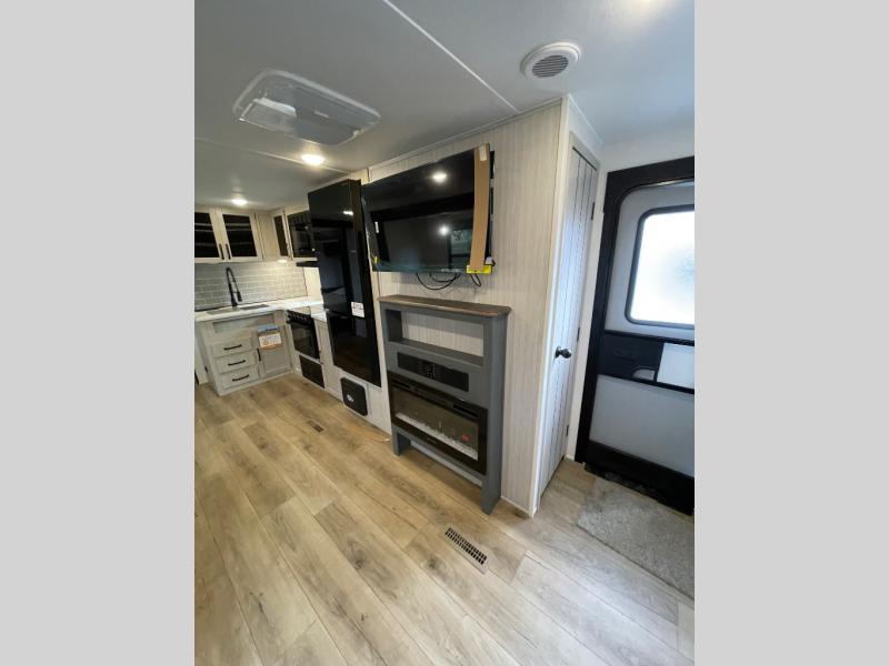 Head to the lake in this double slide out travel trailer that can sleep four to five each night. You will love having the front private bedroom all to yourselves that includes a queen bed slide out, a front wardrobe, a closet with washer and dryer prep, plus your own exterior entry door. Your guests can sleep on the sofa and booth dinette within the second slide out, and the full rear bath is tucked away for privacy. This model also includes an entryway closet/pantry for food storage and jackets, and the fireplace across from the sofa makes your space more cozy. An optional outside micro kitchen is available also if you like to cook outdoors!