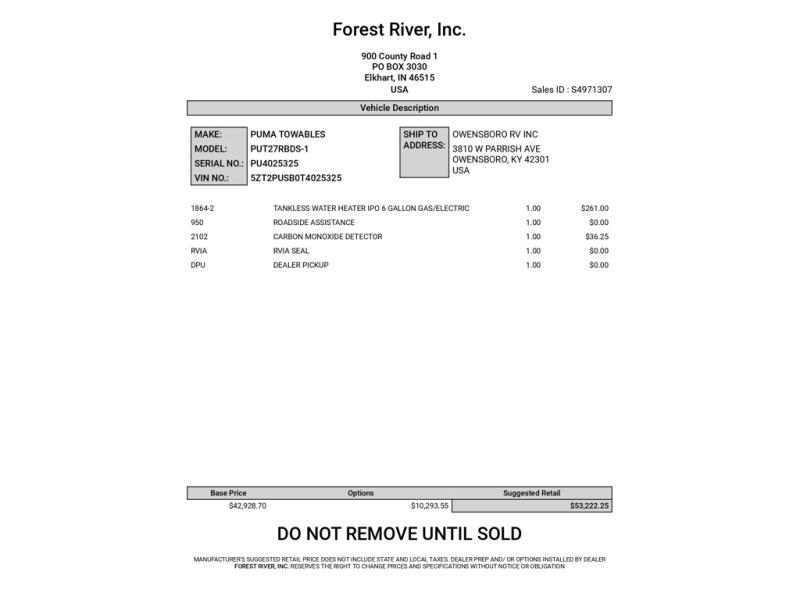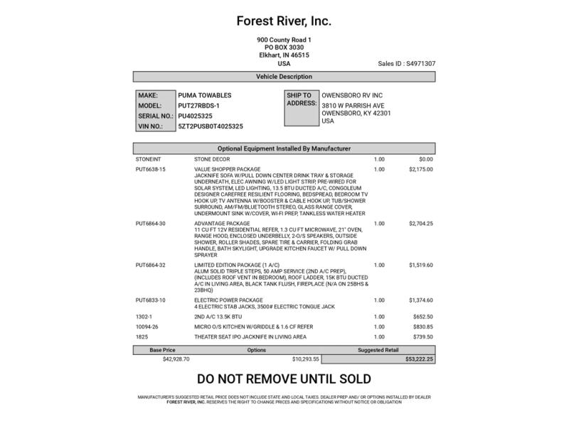 If you're looking for family-fun adventures, then you need one of these Forest River Puma travel trailers! They are built rugged, easy to tow, and jam packed with features. The Darco wrapped underbelly will help protect your unit, and the roof and side mount solar prep gives you the option to add off-grid power. Inside, the Congoleum linoleum will be easy to keep clean, and the night roller shades will provide privacy when it's time to turn in. You'll also enjoy an electric awning with an LED light strip plus an AM/FM/Bluetooth stereo and two outside speakers to keep the party going!