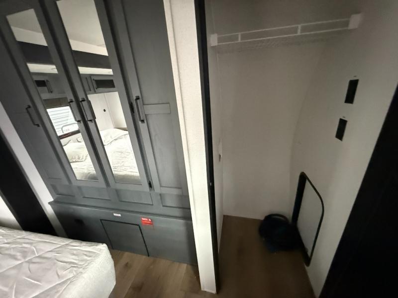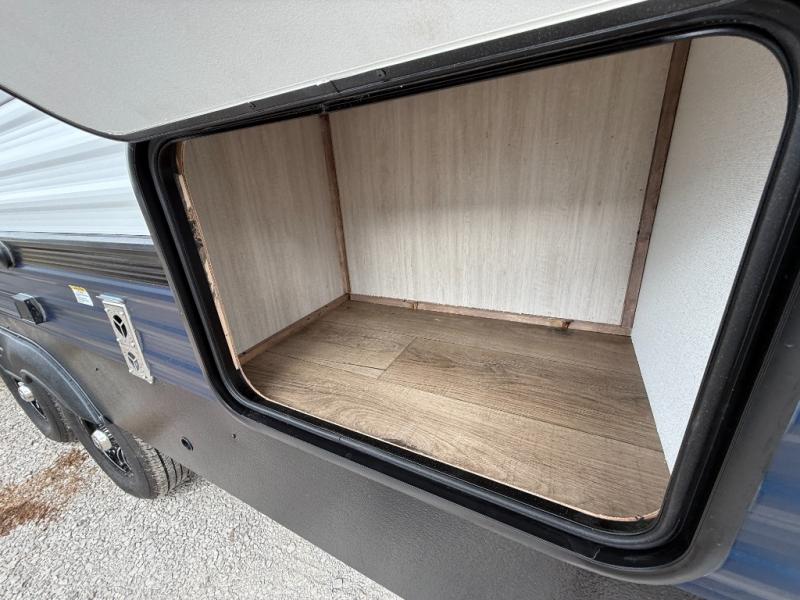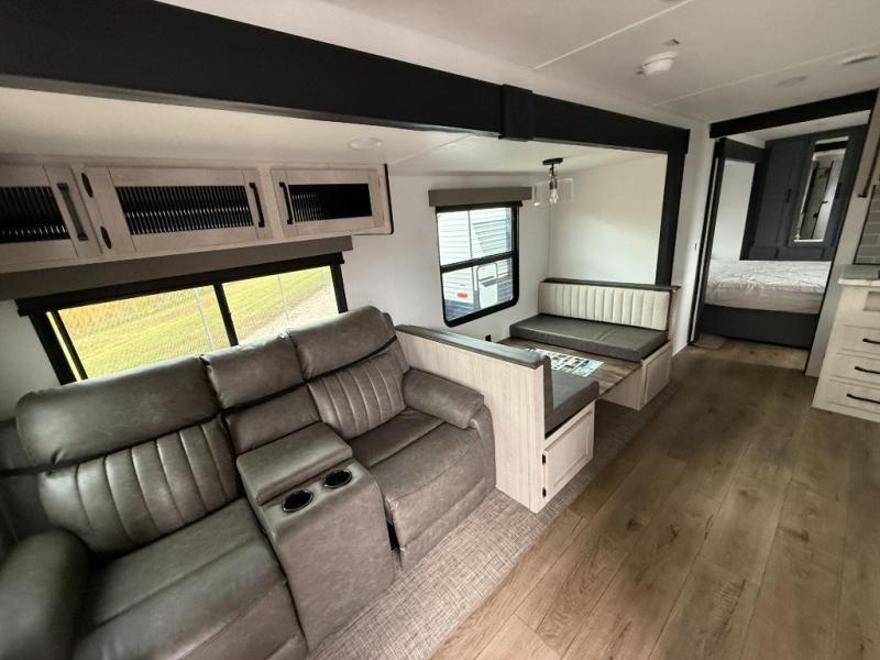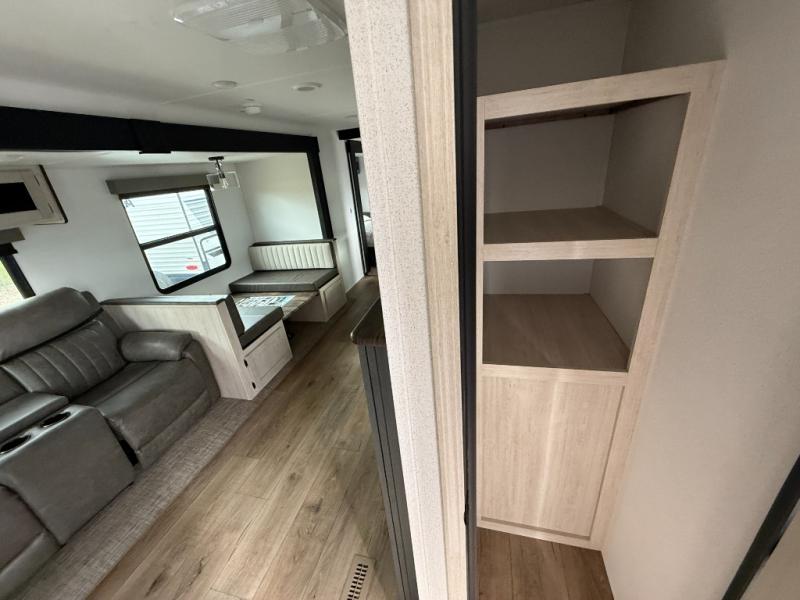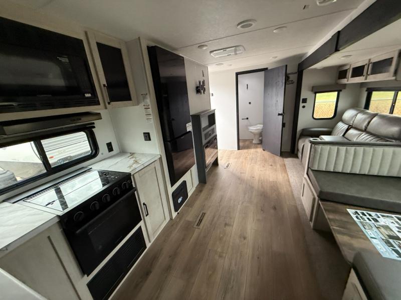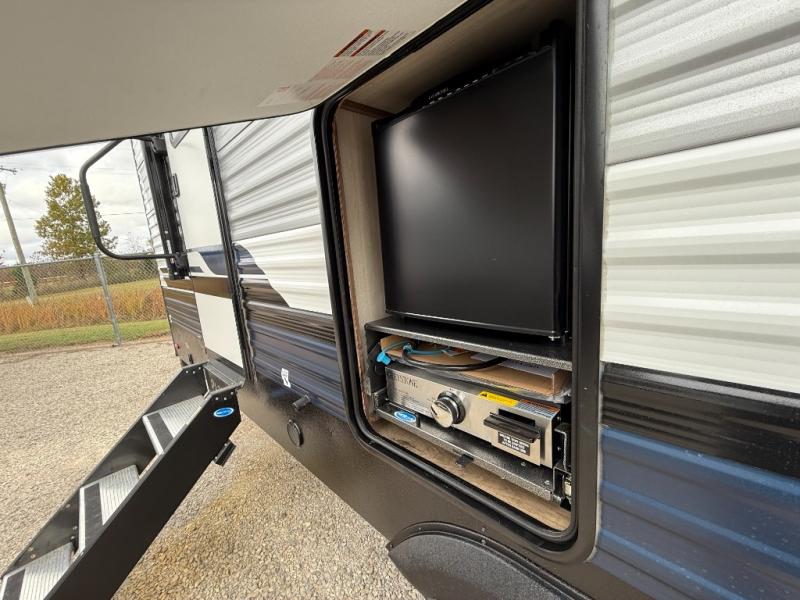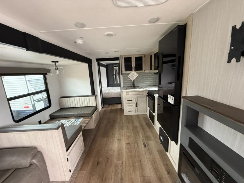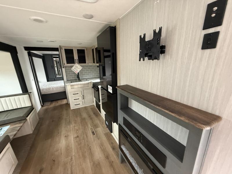 Head to the lake in this double slide out travel trailer that can sleep four to five each night. You will love having the front private bedroom all to yourselves that includes a queen bed slide out, a front wardrobe, a closet with washer and dryer prep, plus your own exterior entry door. Your guests can sleep on the sofa and booth dinette within the second slide out, and the full rear bath is tucked away for privacy. This model also includes an entryway closet/pantry for food storage and jackets, and the fireplace across from the sofa makes your space cozier. An optional outside micro kitchen is available also if you like to cook outdoors!