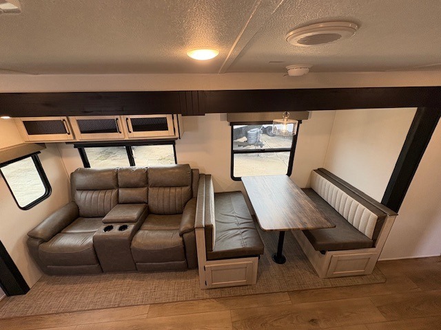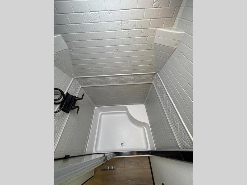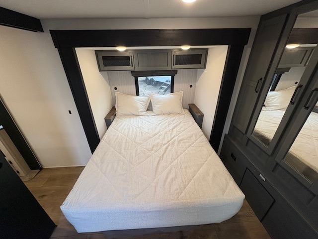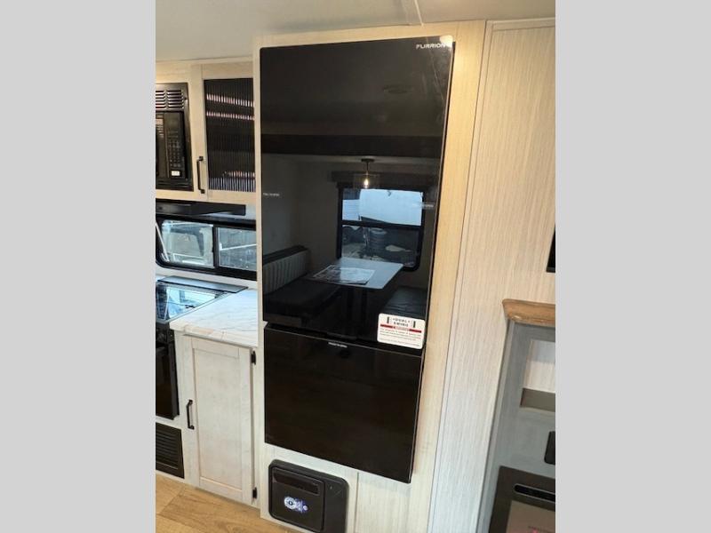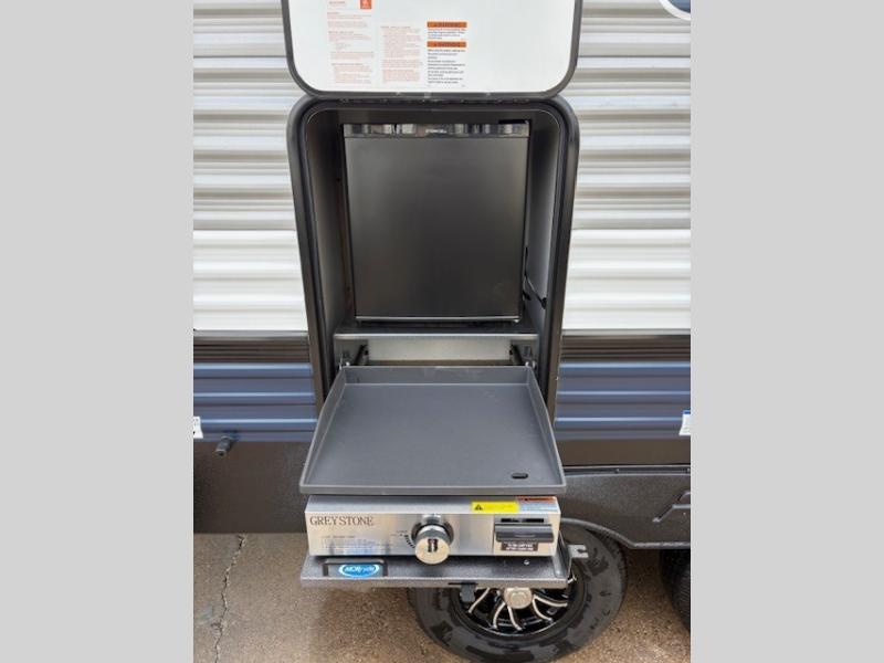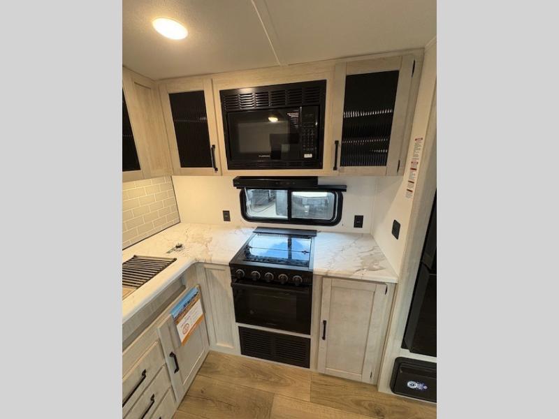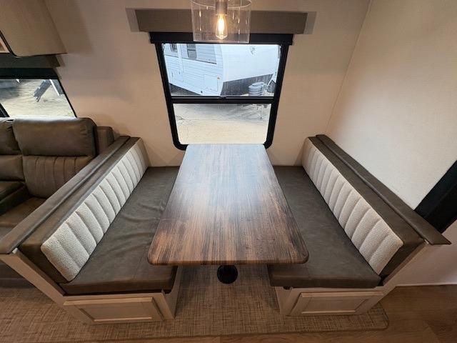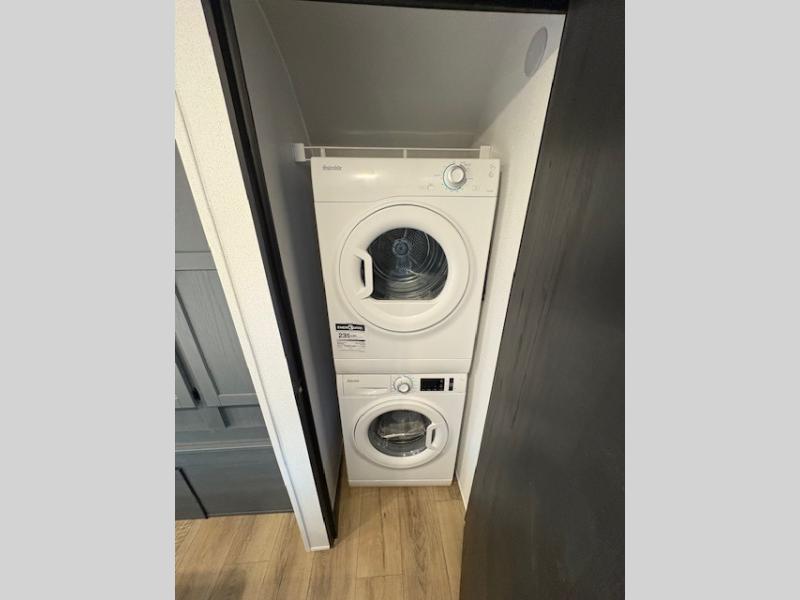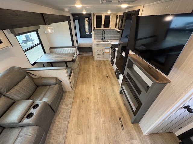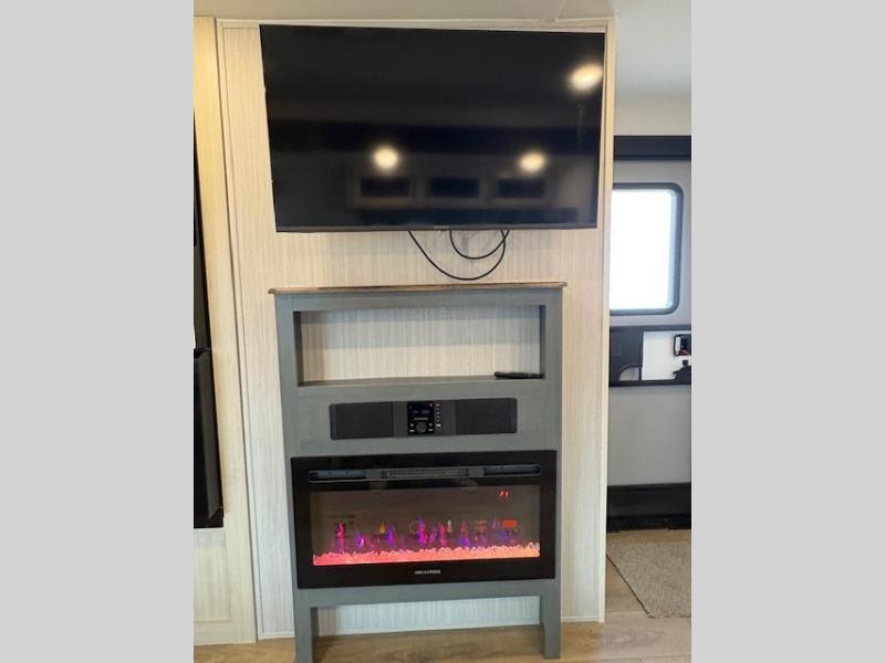 Head to the lake in this double slide out travel trailer that can sleep four to five each night. You will love having the front private bedroom all to yourselves that includes a queen bed slide out, a front wardrobe, a closet with washer and dryer prep, plus your own exterior entry door. Your guests can sleep on the sofa and booth dinette within the second slide out, and the full rear bath is tucked away for privacy. This model also includes an entryway closet/pantry for food storage and jackets, and the fireplace across from the sofa makes your space cozier. An optional outside micro kitchen is available also if you like to cook outdoors!