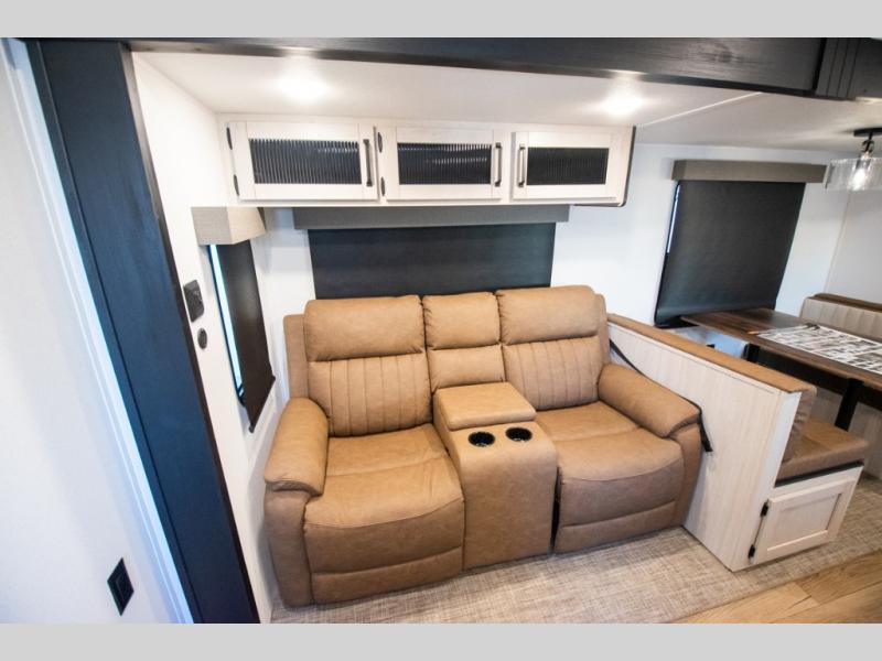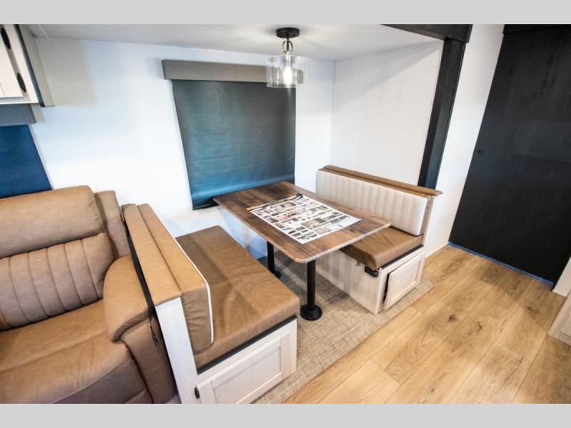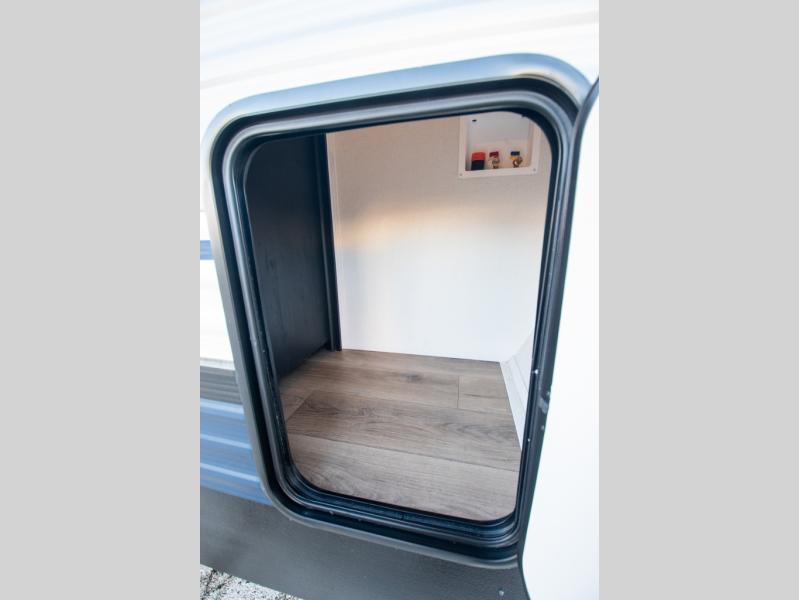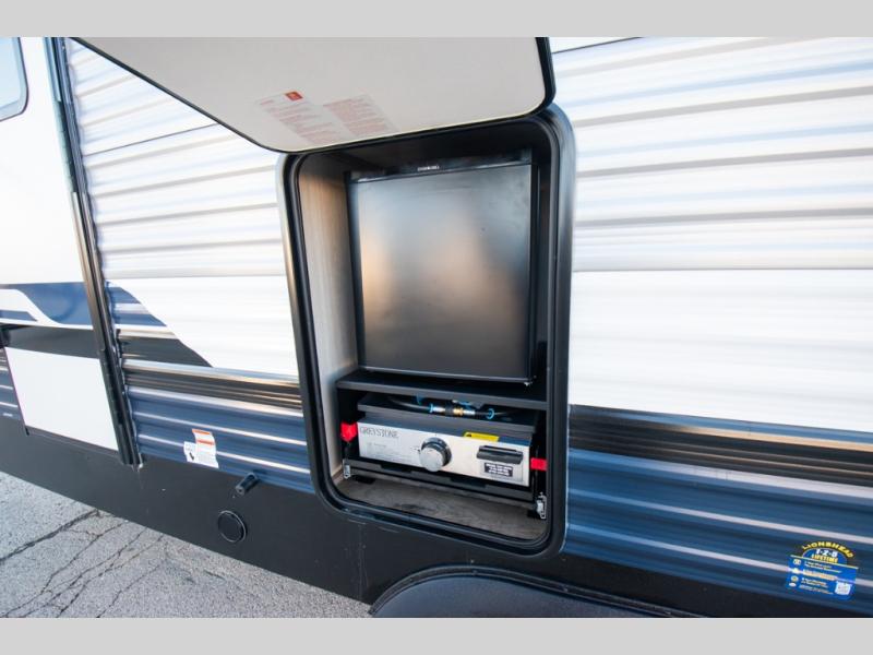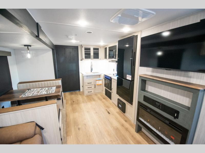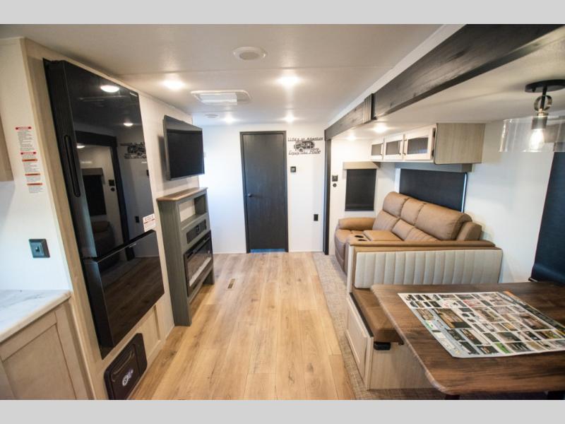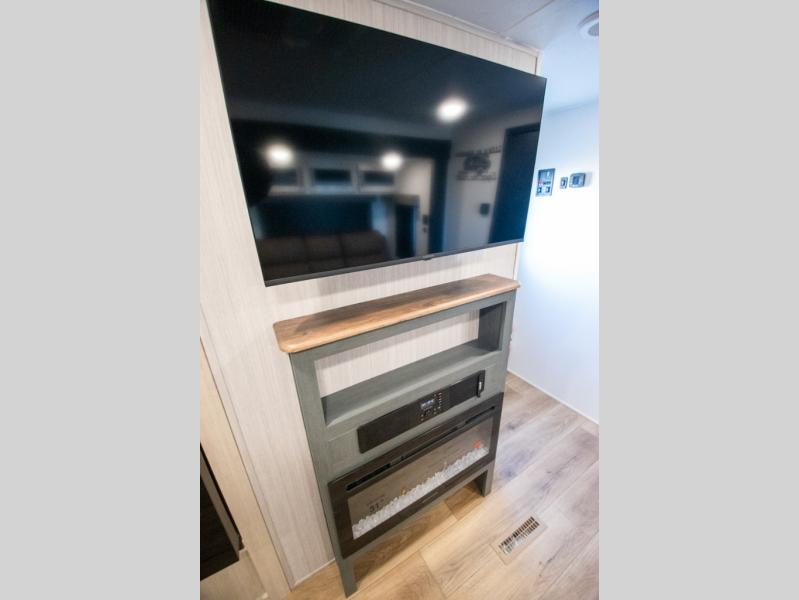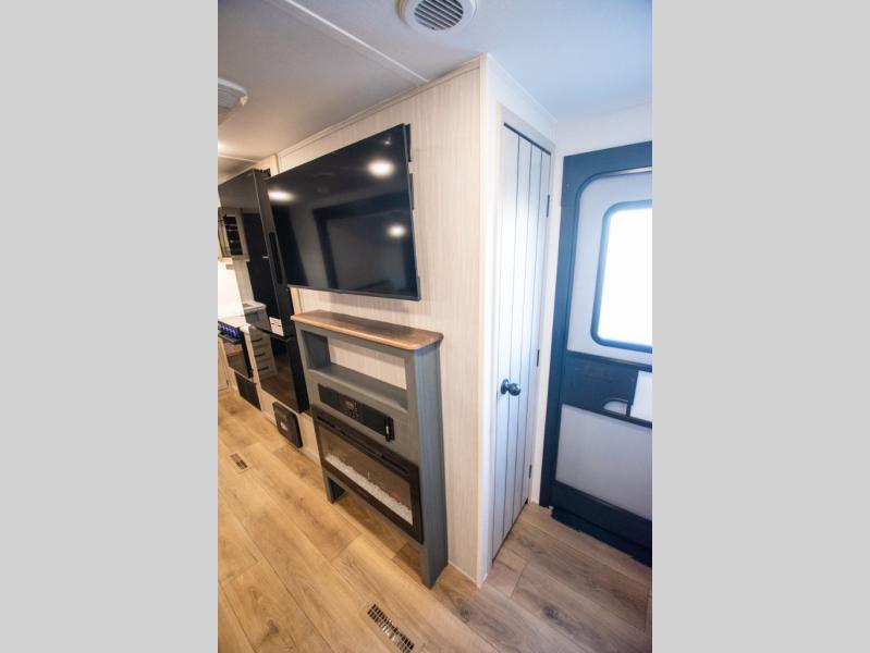 Head to the lake in this double slide out travel trailer that can sleep four to five each night. You will love having the front private bedroom all to yourselves that includes a queen bed slide out, a front wardrobe, a closet with washer and dryer prep, plus your own exterior entry door. Your guests can sleep on the sofa and booth dinette within the second slide out, and the full rear bath is tucked away for privacy. This model also includes an entryway closet/pantry for food storage and jackets, and the fireplace across from the sofa makes your space cozier. An optional outside micro kitchen is available also if you like to cook outdoors!