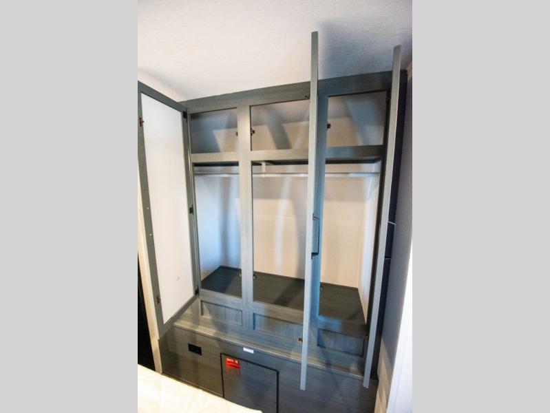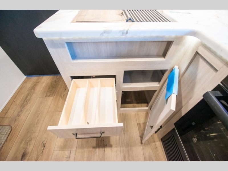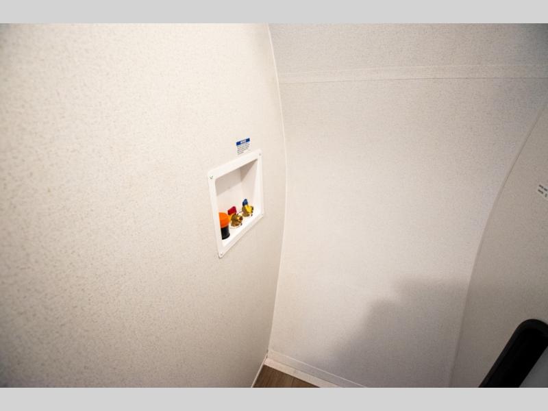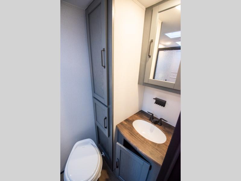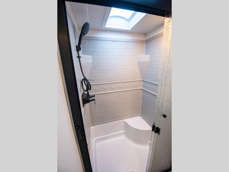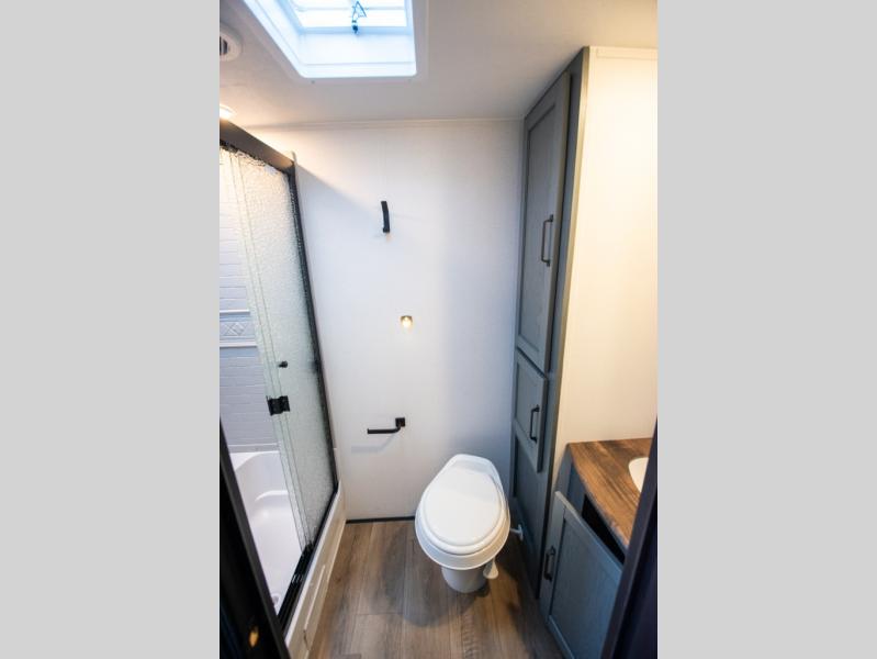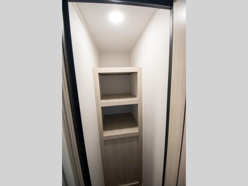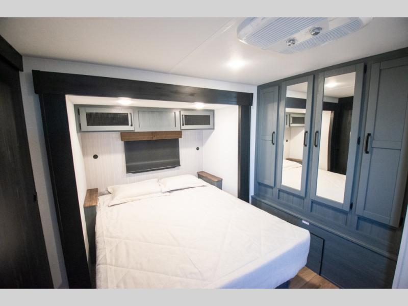Head to the lake in this double slide out travel trailer that can sleep four to five each night. You will love having the front private bedroom all to yourselves that includes a queen bed slide out, a front wardrobe, a closet with washer and dryer prep, plus your own exterior entry door. Your guests can sleep on the sofa and booth dinette within the second slide out, and the full rear bath is tucked away for privacy. This model also includes an entryway closet/pantry for food storage and jackets, and the fireplace across from the sofa makes your space cozier. An optional outside micro kitchen is available also if you like to cook outdoors!