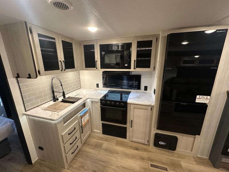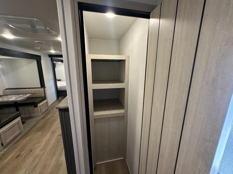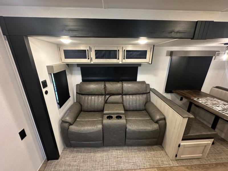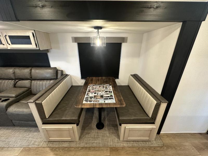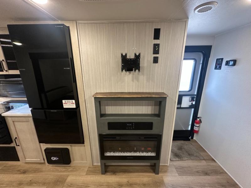 Head to the lake in this double slide out travel trailer that can sleep four to five each night. You will love having the front private bedroom all to yourselves that includes a queen bed slide out, a front wardrobe, a closet with washer and dryer prep, plus your own exterior entry door. Your guests can sleep on the sofa and booth dinette within the second slide out, and the full rear bath is tucked away for privacy. This model also includes an entryway closet/pantry for food storage and jackets, and the fireplace across from the sofa makes your space cozier. An optional outside micro kitchen is available also if you like to cook outdoors!