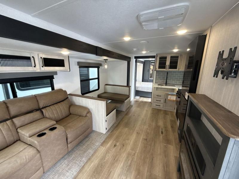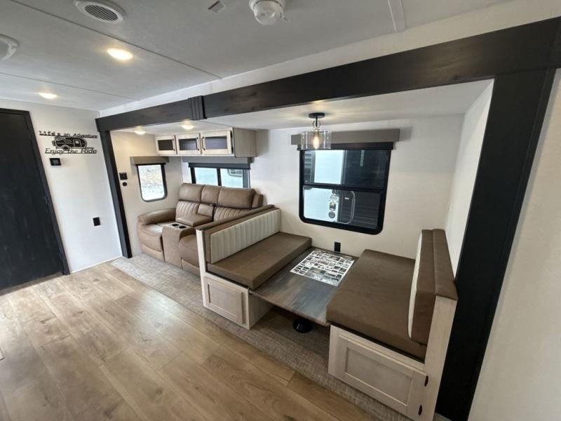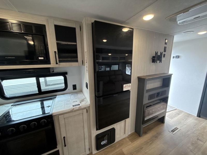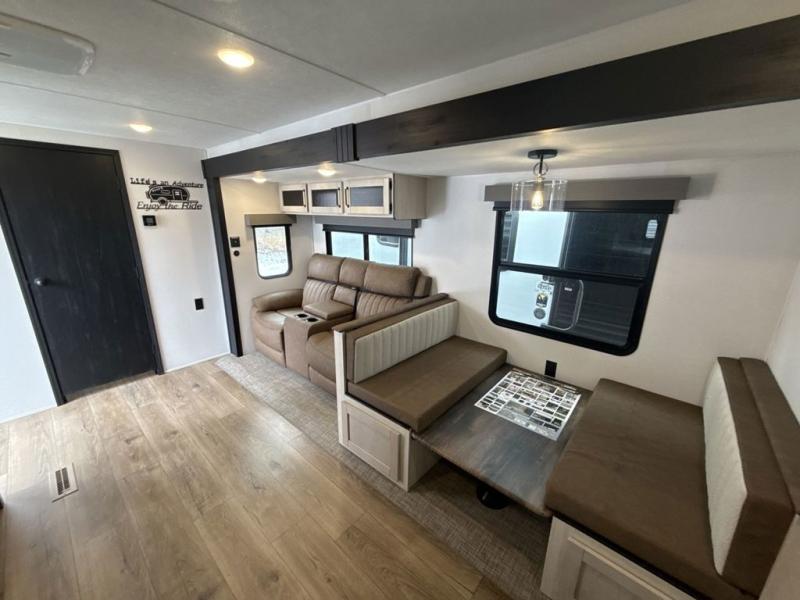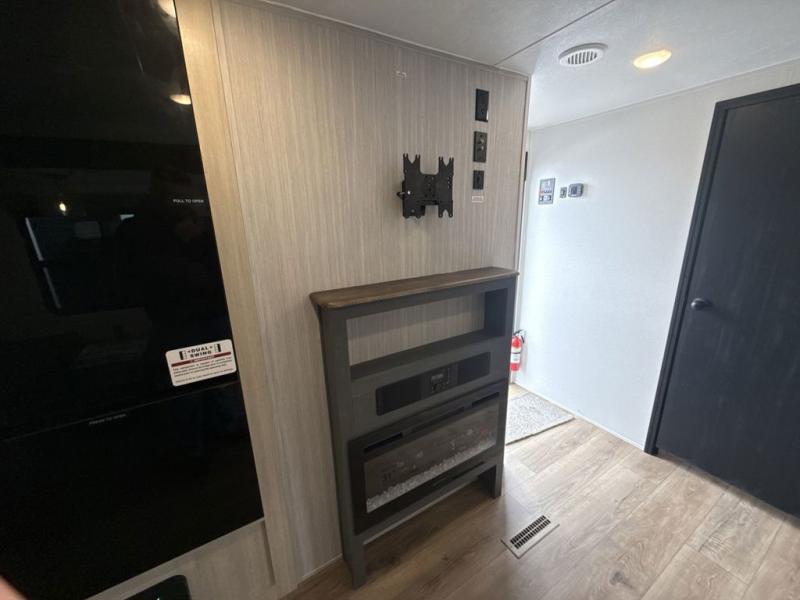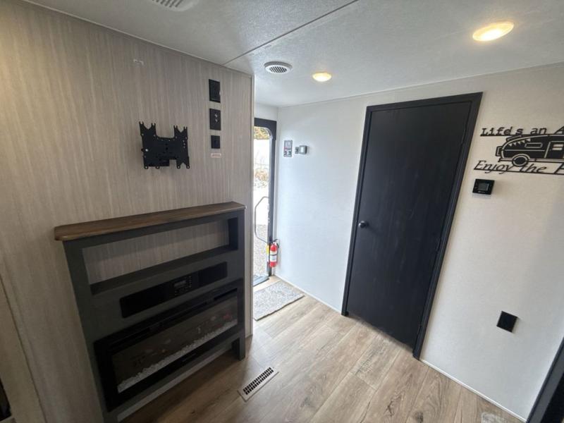 Head to the lake in this double slide out travel trailer that can sleep four to five each night. You will love having the front private bedroom all to yourselves that includes a queen bed slide out, a front wardrobe, a closet with washer and dryer prep, plus your own exterior entry door. Your guests can sleep on the sofa and booth dinette within the second slide out, and the full rear bath is tucked away for privacy. This model also includes an entryway closet/pantry for food storage and jackets, and the fireplace across from the sofa makes your space cozier. An optional outside micro kitchen is available also if you like to cook outdoors!
