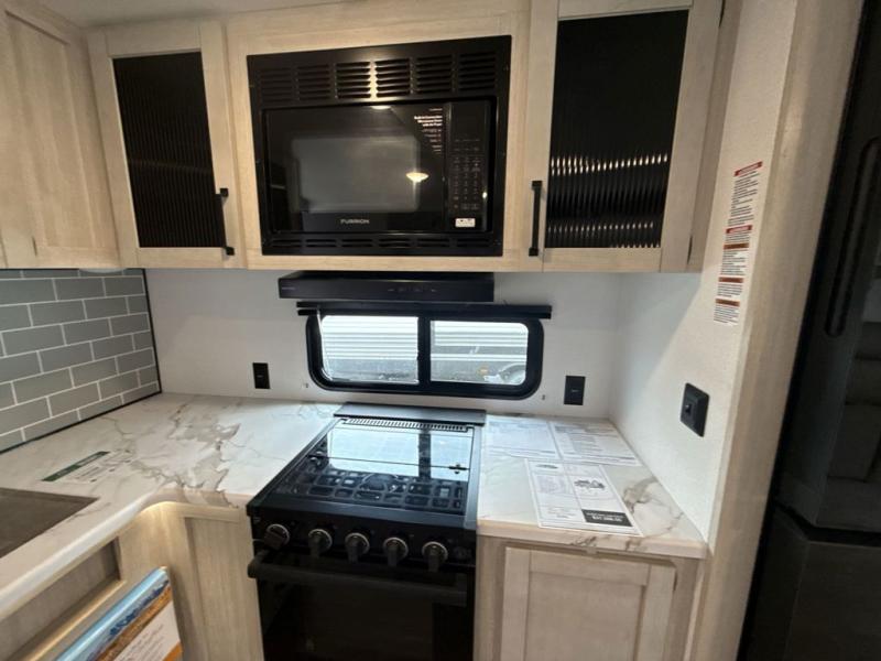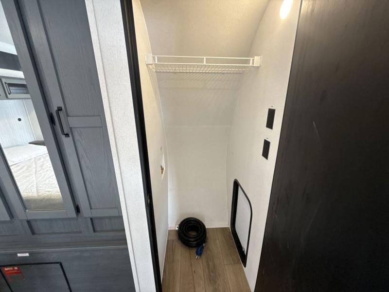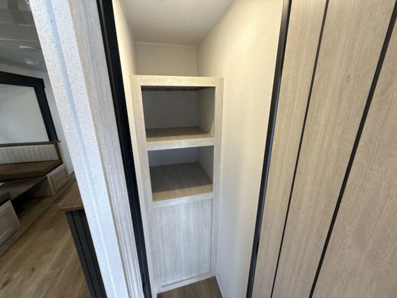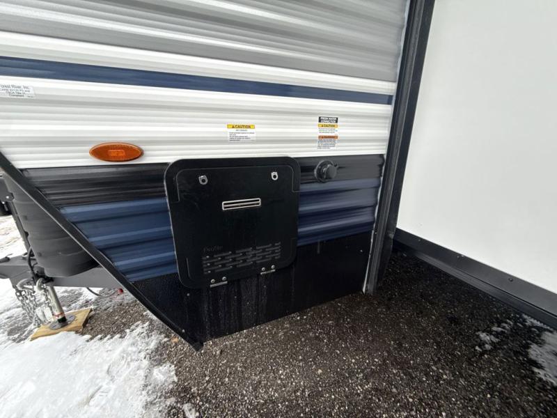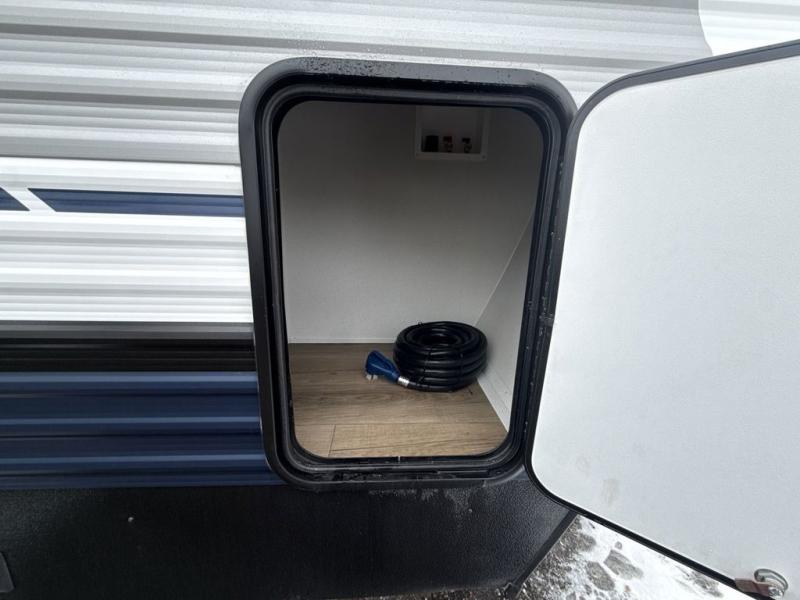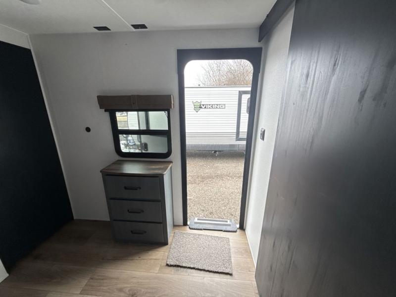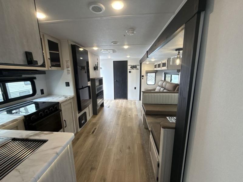 Head to the lake in this double slide out travel trailer that can sleep four to five each night. You will love having the front private bedroom all to yourselves that includes a queen bed slide out, a front wardrobe, a closet with washer and dryer prep, plus your own exterior entry door. Your guests can sleep on the sofa and booth dinette within the second slide out, and the full rear bath is tucked away for privacy. This model also includes an entryway closet/pantry for food storage and jackets, and the fireplace across from the sofa makes your space cozier. An optional outside micro kitchen is available also if you like to cook outdoors!