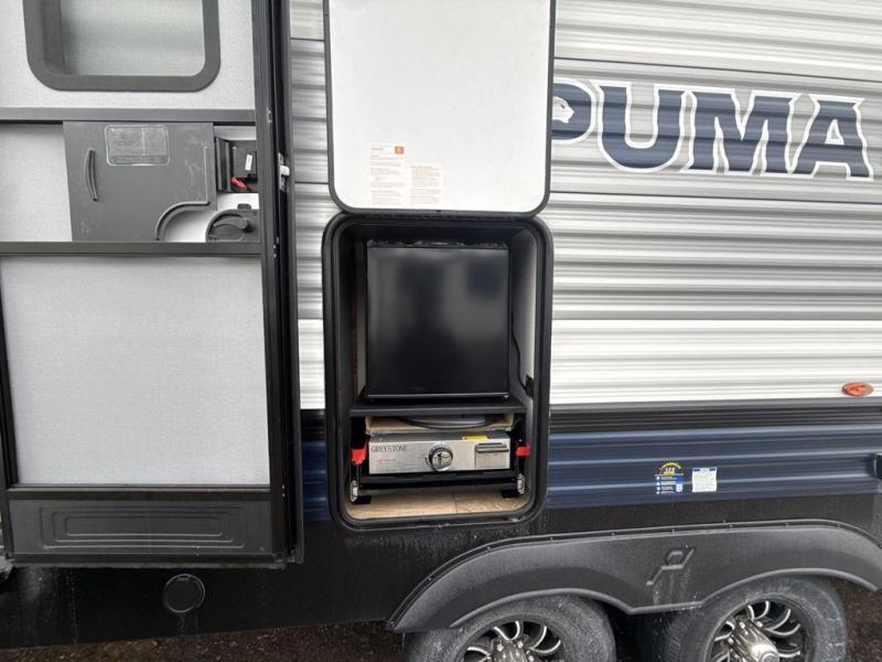If you're looking for family-fun adventures, then you need one of these Forest River Puma travel trailers! They are built rugged, easy to tow, and jam packed with features. The Darco wrapped underbelly will help protect your unit, and the roof and side mount solar prep gives you the option to add off-grid power. Inside, the Congoleum linoleum will be easy to keep clean, and the night roller shades will provide privacy when it's time to turn in. You'll also enjoy an electric awning with an LED light strip plus an AM/FM/Bluetooth stereo and two outside speakers to keep the party going!