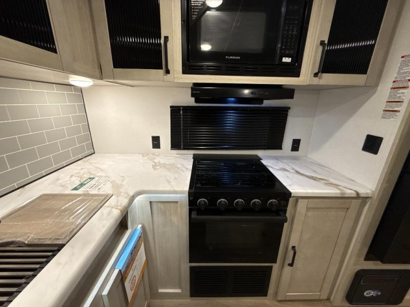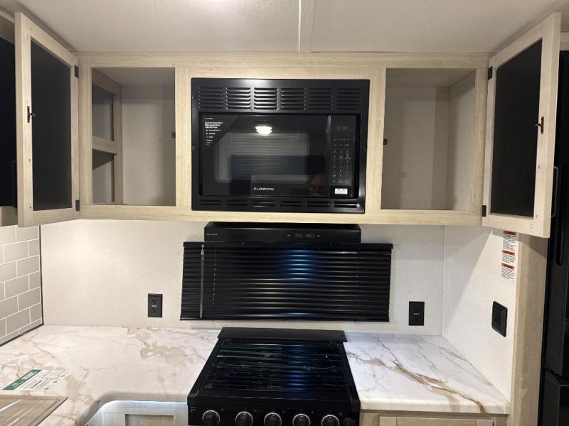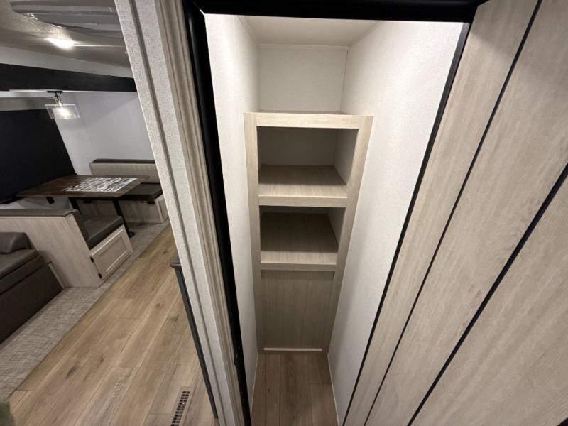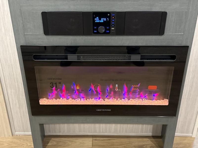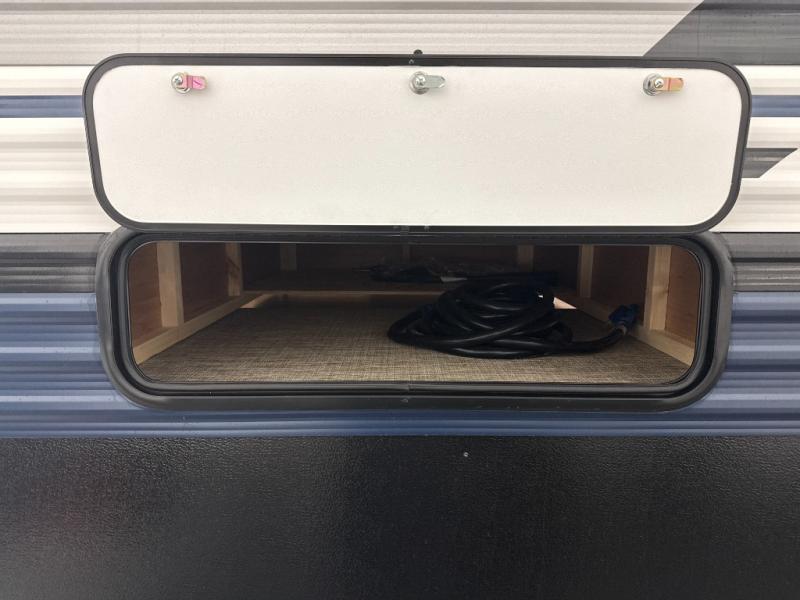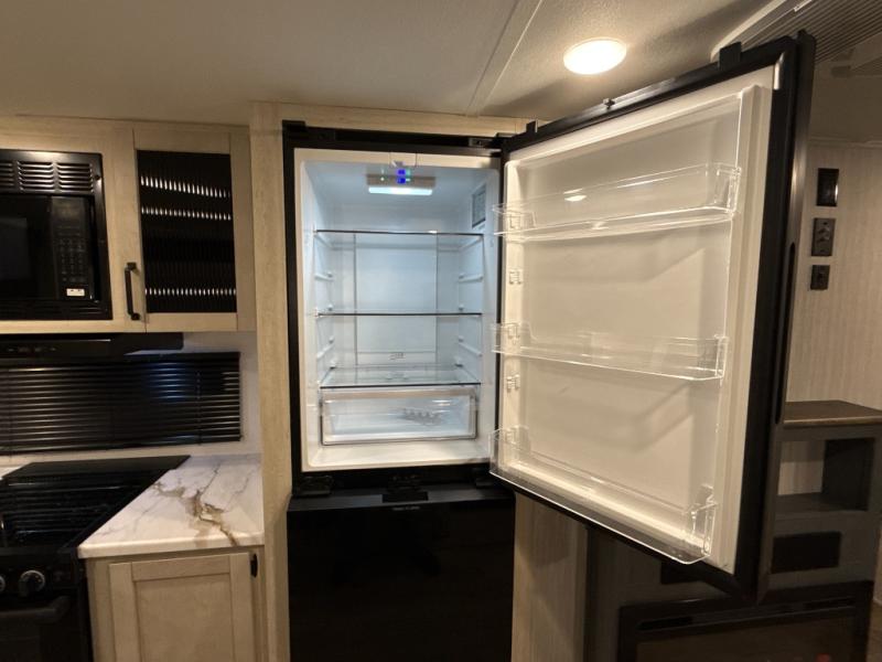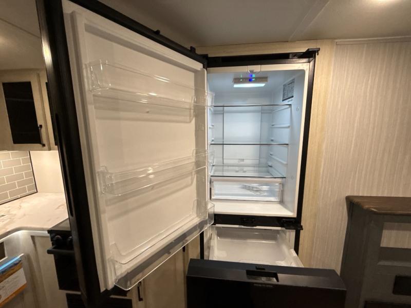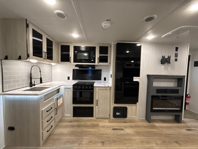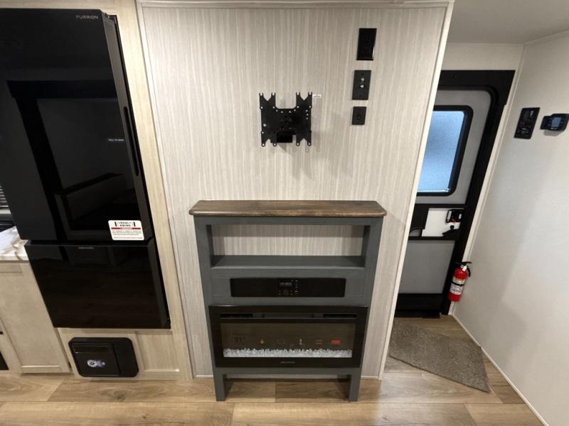 Head to the lake in this double slide out travel trailer that can sleep four to five each night. You will love having the front private bedroom all to yourselves that includes a queen bed slide out, a front wardrobe, a closet with washer and dryer prep, plus your own exterior entry door. Your guests can sleep on the sofa and booth dinette within the second slide out, and the full rear bath is tucked away for privacy. This model also includes an entryway closet/pantry for food storage and jackets, and the fireplace across from the sofa makes your space cozier. An optional outside micro kitchen is available also if you like to cook outdoors!