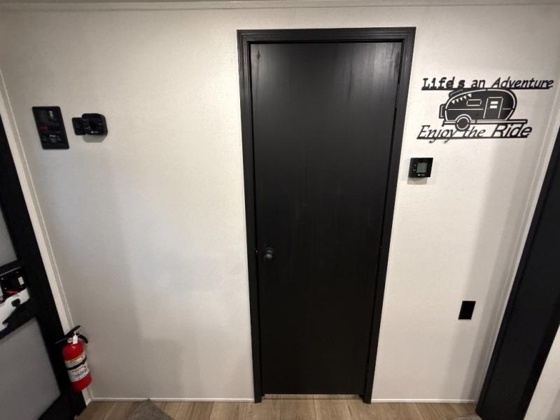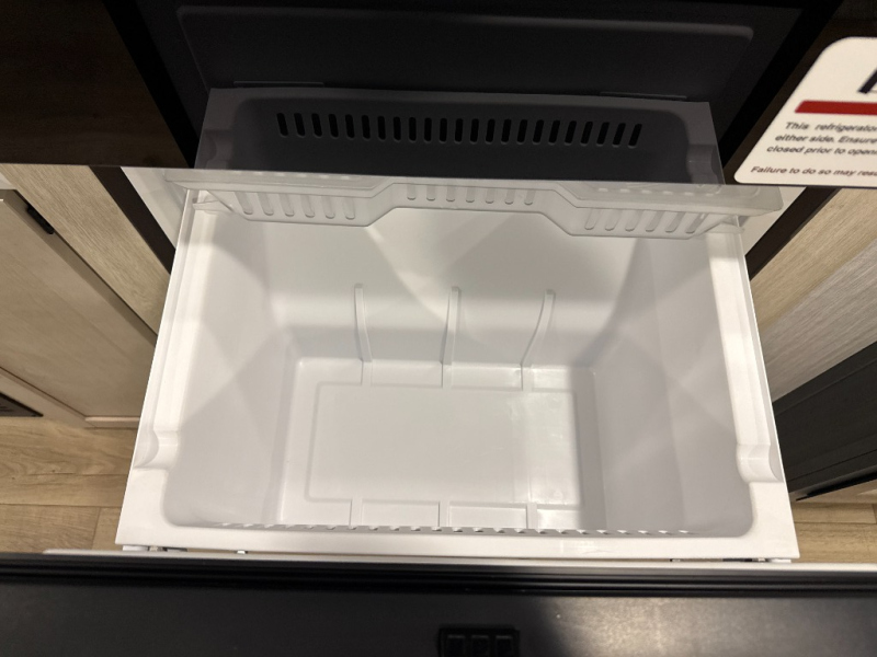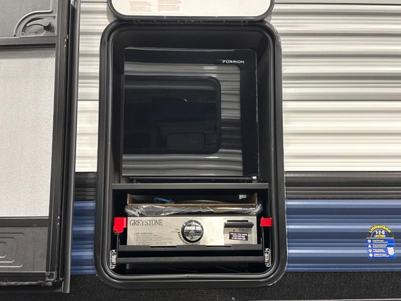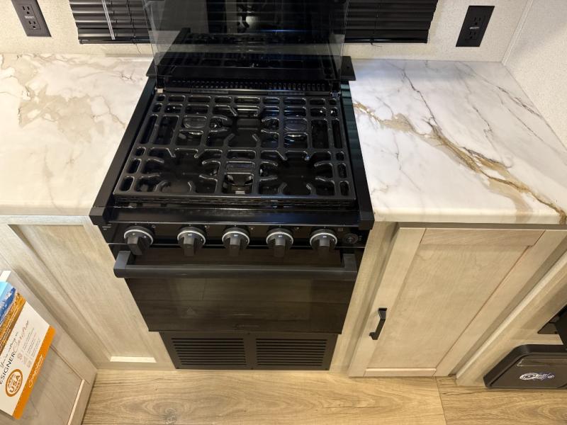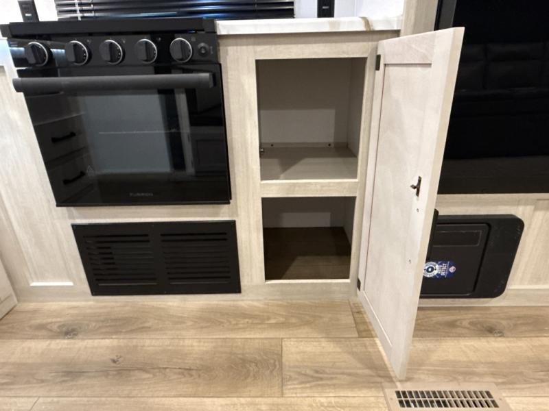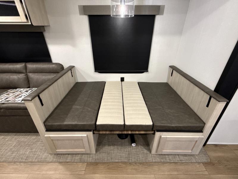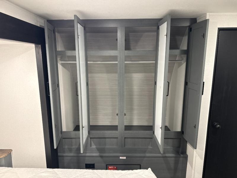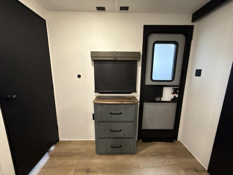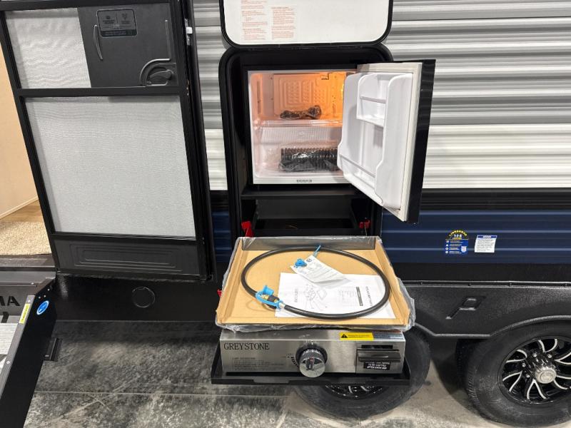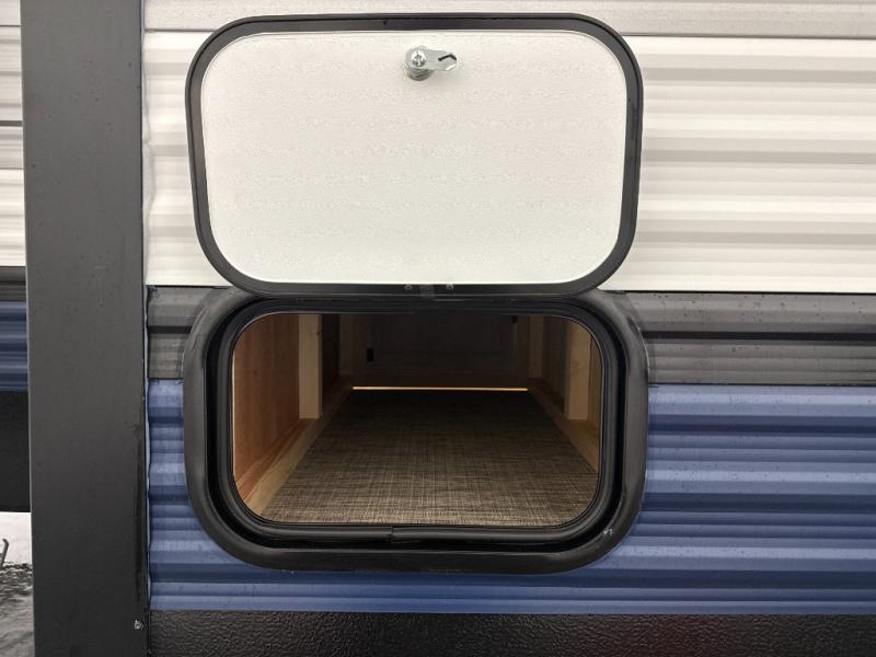 Head to the lake in this double slide out travel trailer that can sleep four to five each night. You will love having the front private bedroom all to yourselves that includes a queen bed slide out, a front wardrobe, a closet with washer and dryer prep, plus your own exterior entry door. Your guests can sleep on the sofa and booth dinette within the second slide out, and the full rear bath is tucked away for privacy. This model also includes an entryway closet/pantry for food storage and jackets, and the fireplace across from the sofa makes your space cozier. An optional outside micro kitchen is available also if you like to cook outdoors!