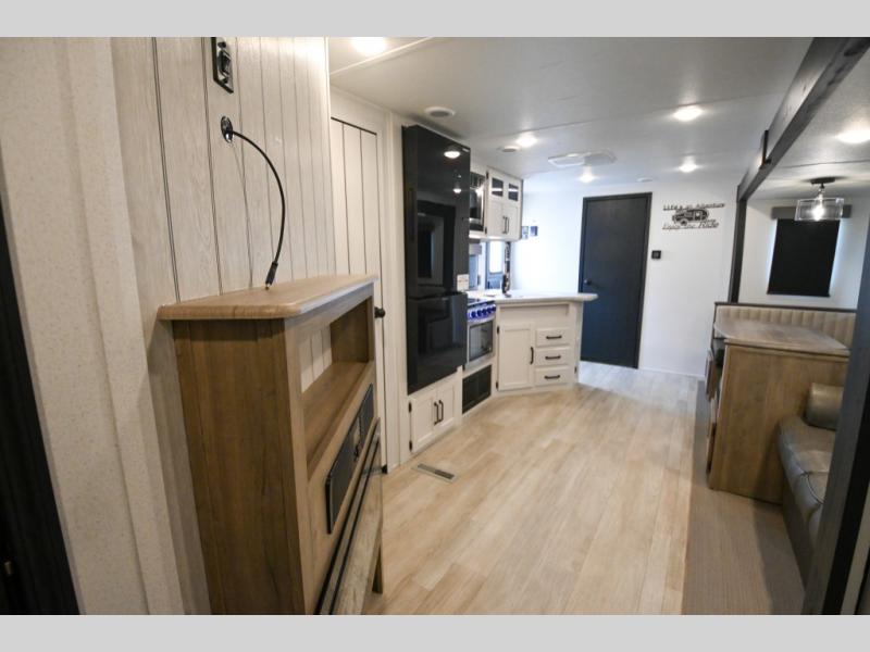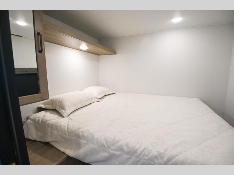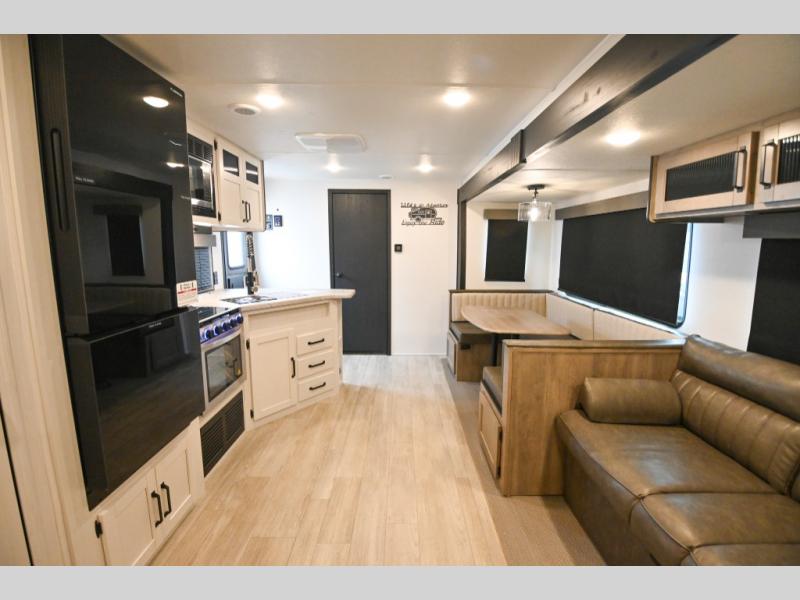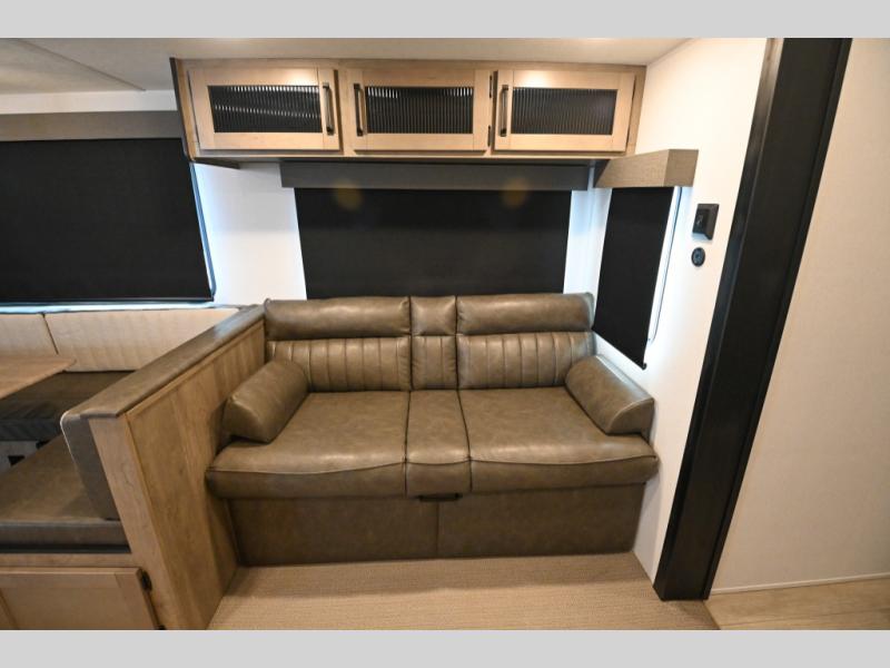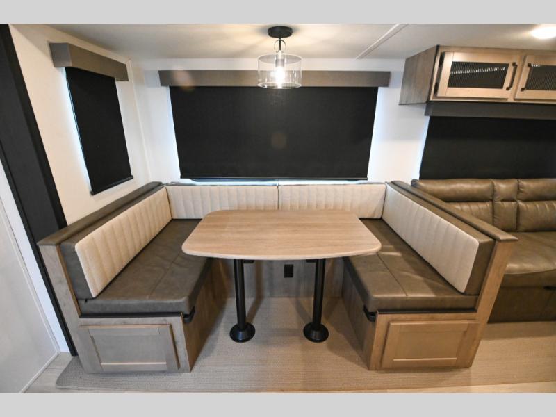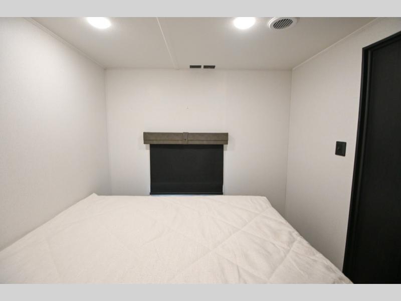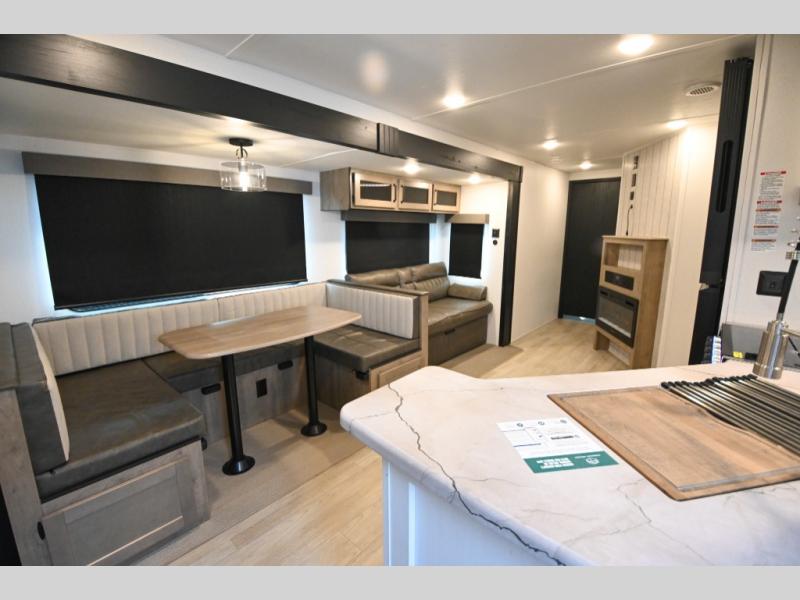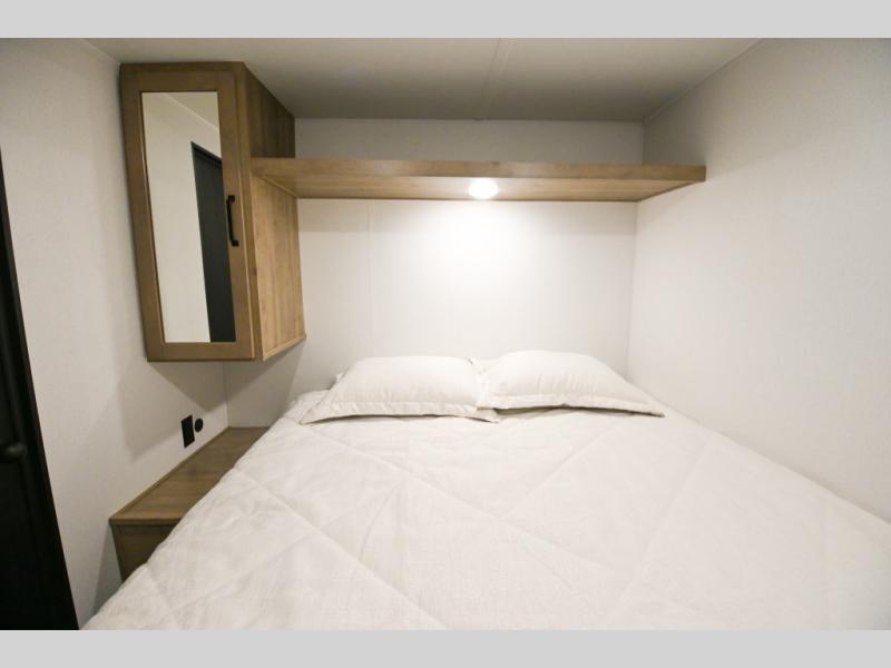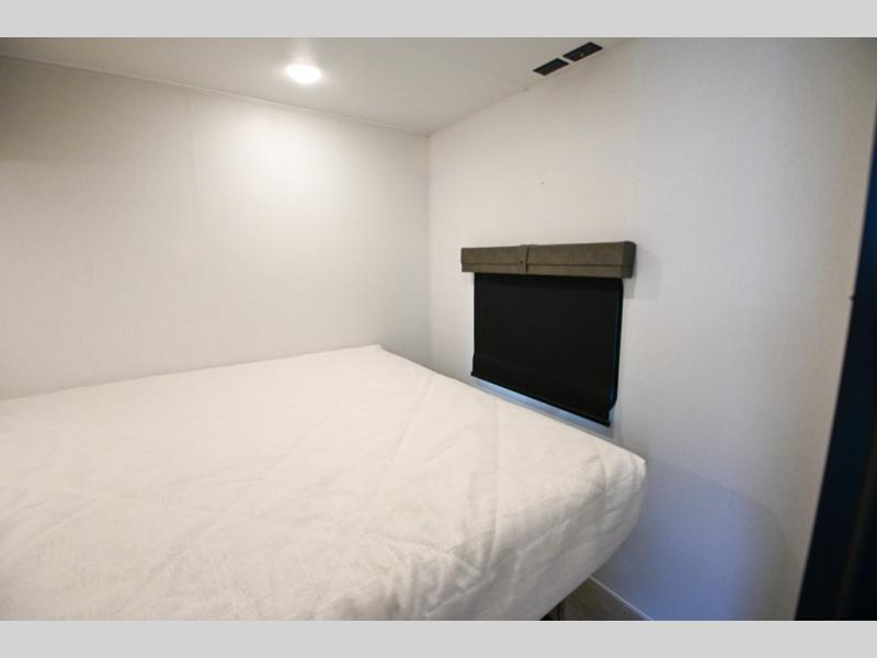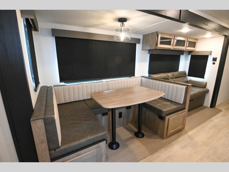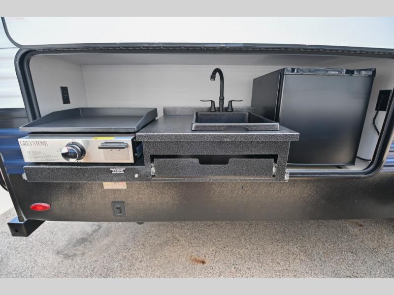 There's a comfortable place to sleep for the whole family in this travel trailer! The rear private bunkhouse has a set of 28" x 76" bunk beds, a 28" x 65" bunk above a sofa, and a wardrobe with an entertainment center above it so they can bring a cousin or two to join in on the fun. You will have your own privacy with the front private bedroom which has a queen bed with shirt closets on either side of it. The spacious full bathroom has a 34" x 34" radius shower for everyone to freshen up and one of the entrances leads directly outside so you can get back to having fun fast. Prepare your best home cooked meals indoors with the walk-in pantry, the three burner cooktop, and the 12V refrigerator. Plus, there is a U-shaped dinette to enjoy your meals and even transform into an extra sleeping space! Choose the optional mini outside kitchen for even more convenience!