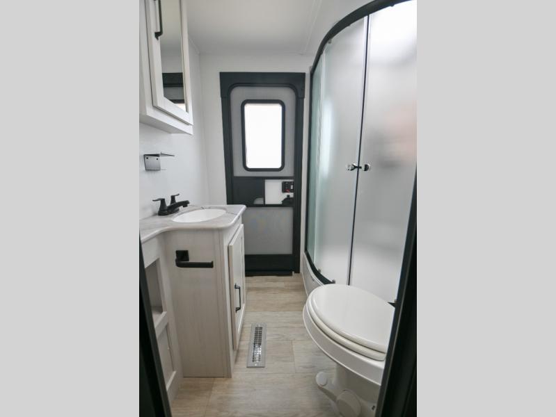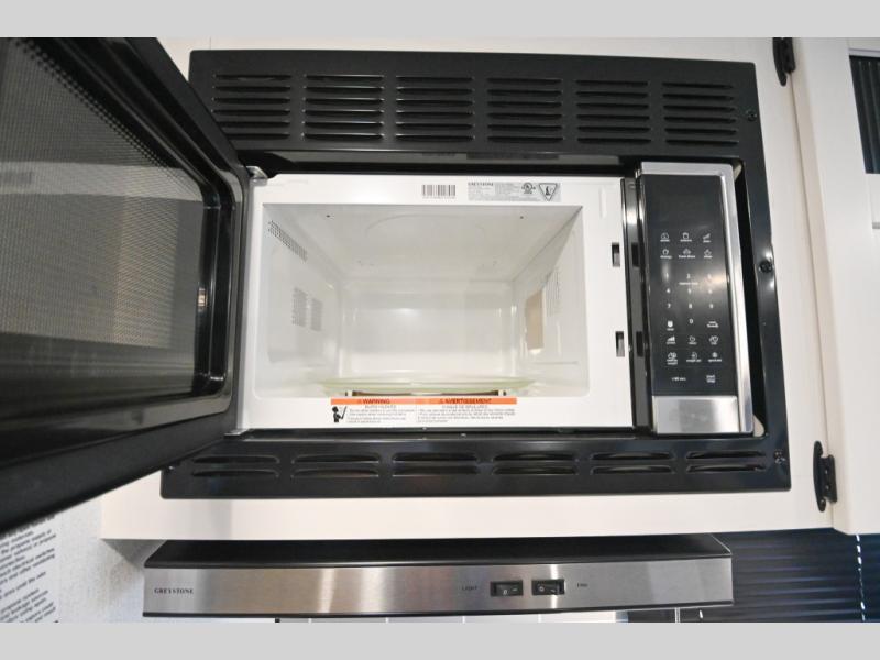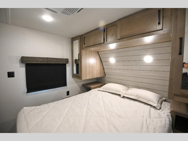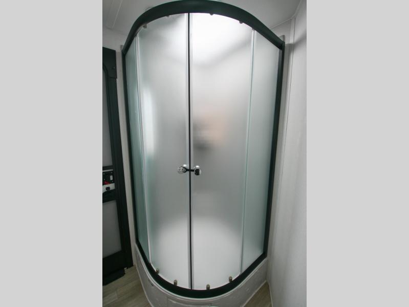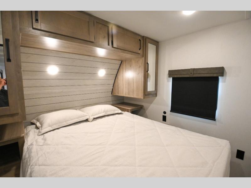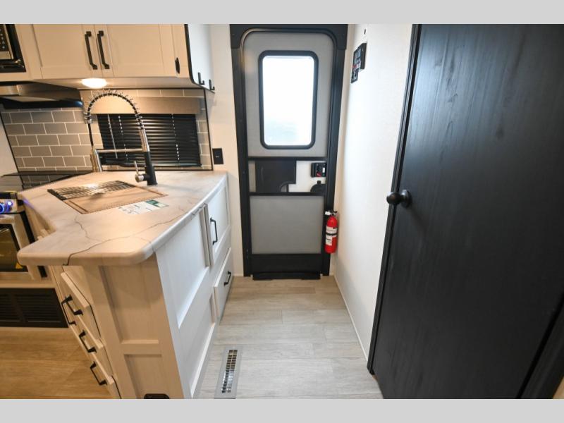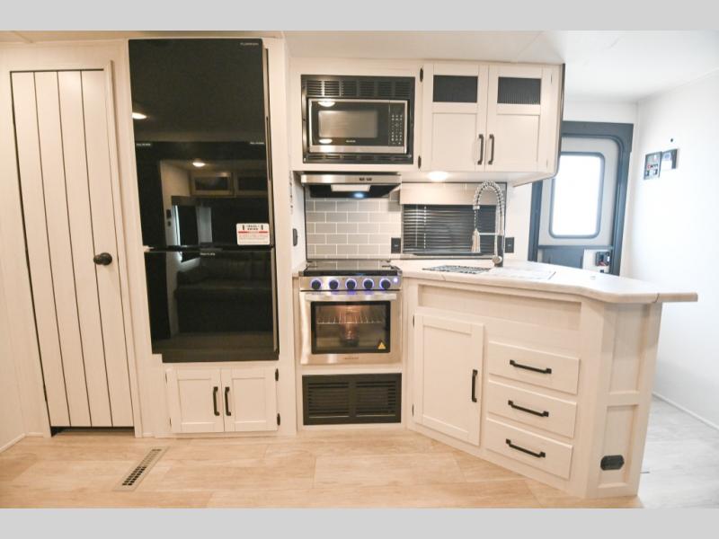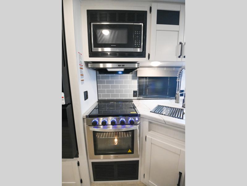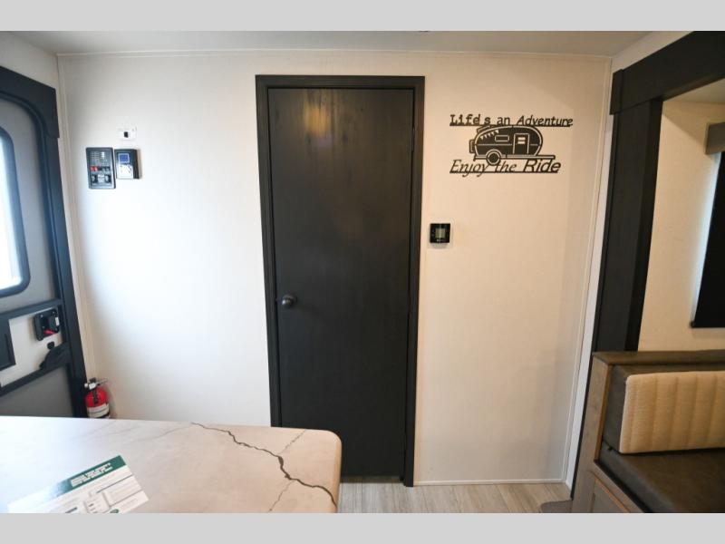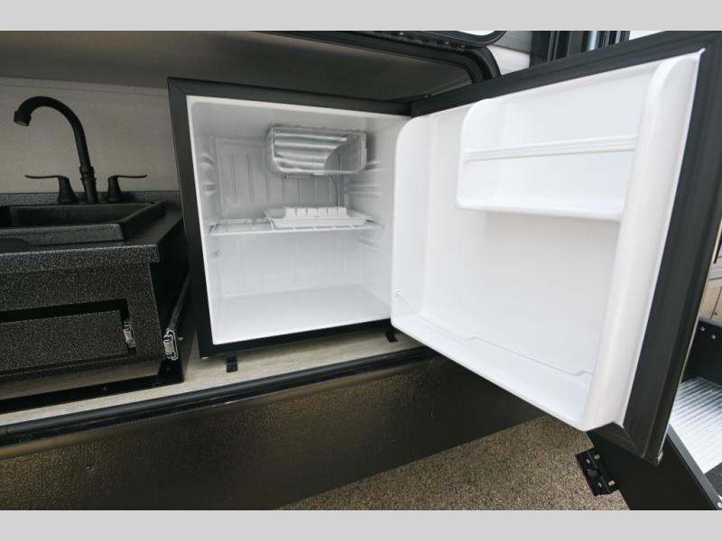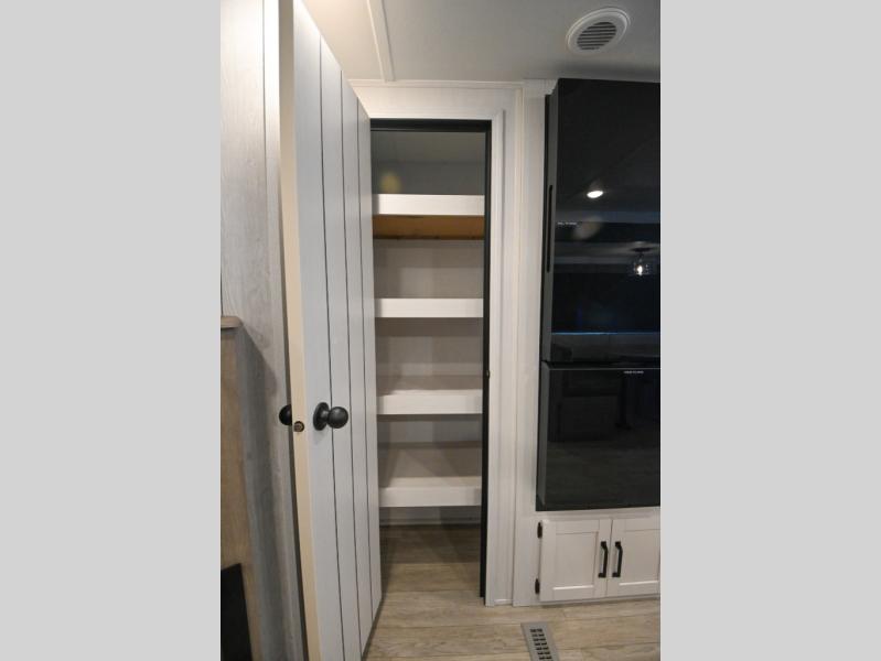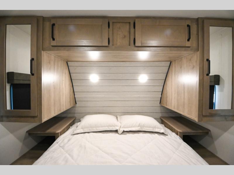 There's a comfortable place to sleep for the whole family in this travel trailer! The rear private bunkhouse has a set of 28" x 76" bunk beds, a 28" x 65" bunk above a sofa, and a wardrobe with an entertainment center above it so they can bring a cousin or two to join in on the fun. You will have your own privacy with the front private bedroom which has a queen bed with shirt closets on either side of it. The spacious full bathroom has a 34" x 34" radius shower for everyone to freshen up and one of the entrances leads directly outside so you can get back to having fun fast. Prepare your best home cooked meals indoors with the walk-in pantry, the three burner cooktop, and the 12V refrigerator. Plus, there is a U-shaped dinette to enjoy your meals and even transform into an extra sleeping space! Choose the optional mini outside kitchen for even more convenience!