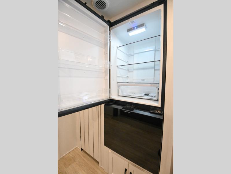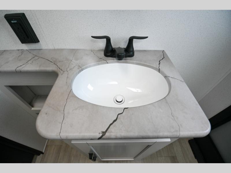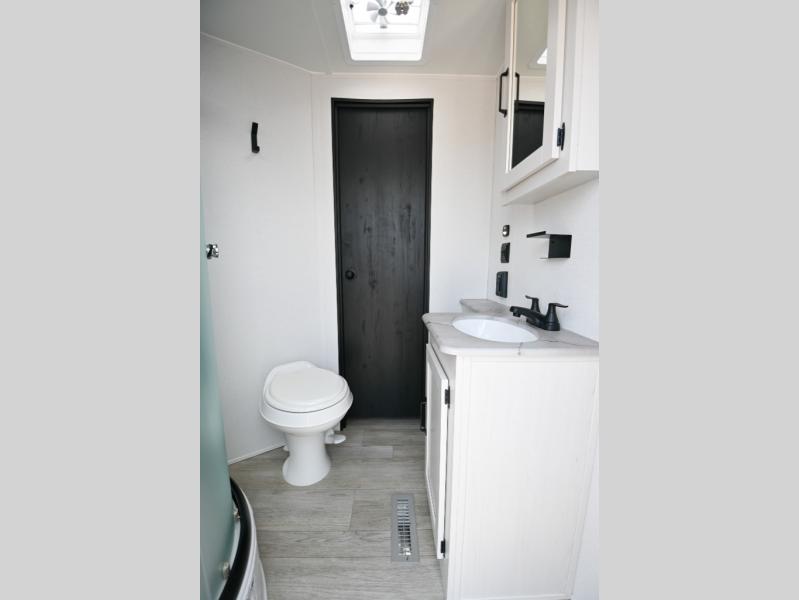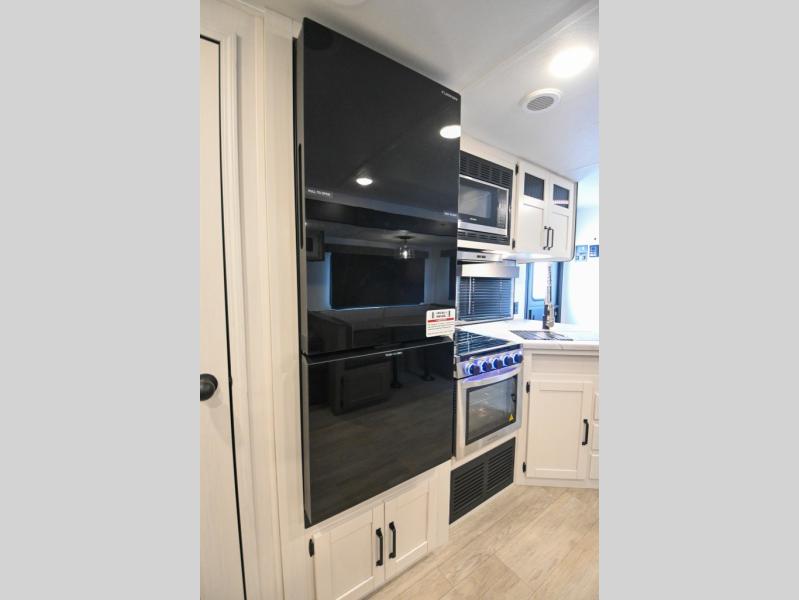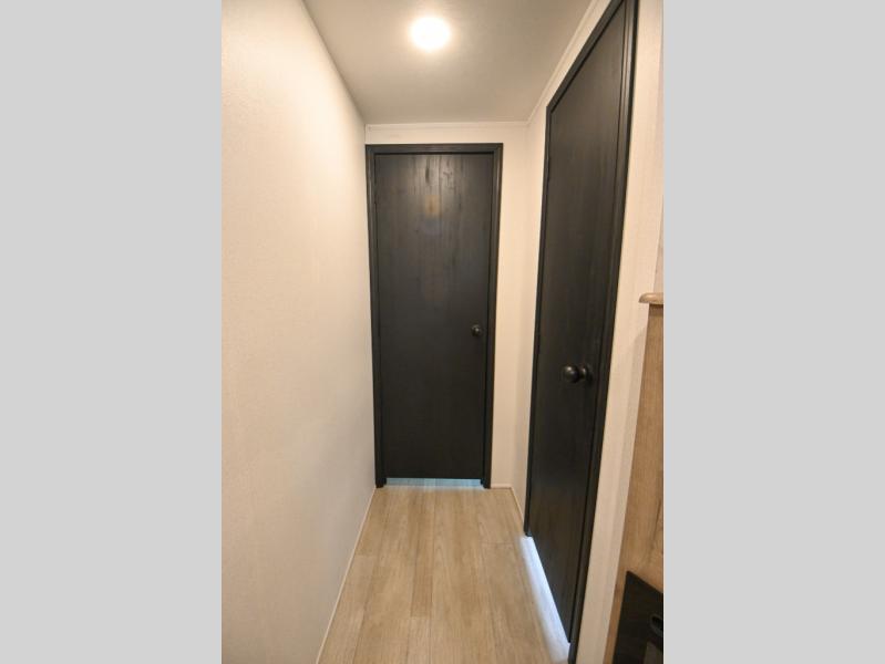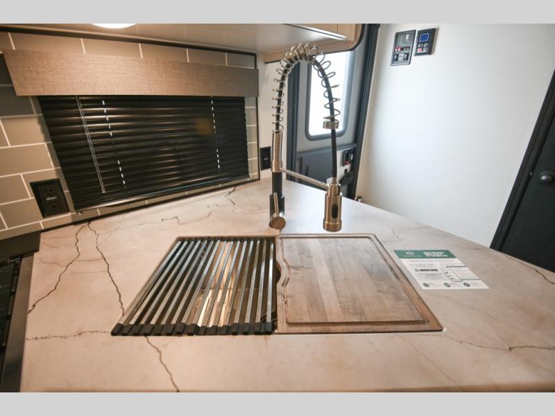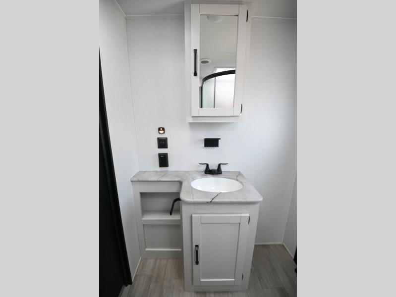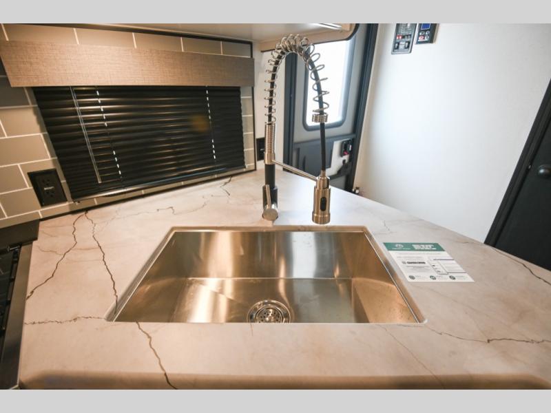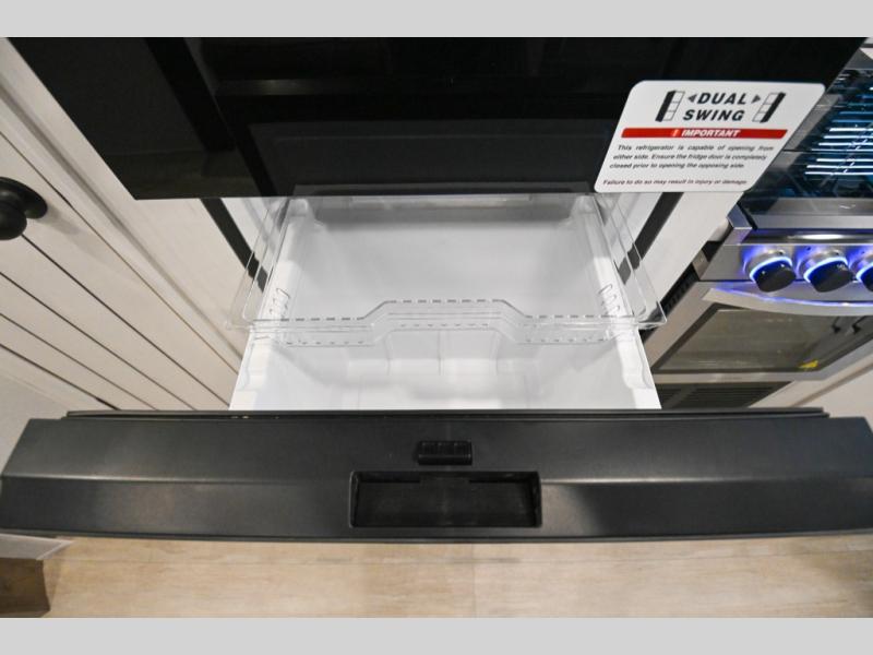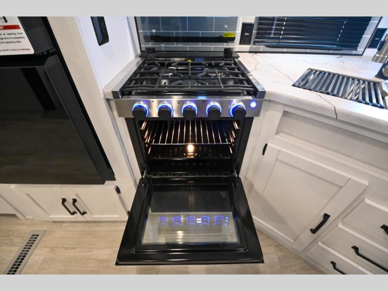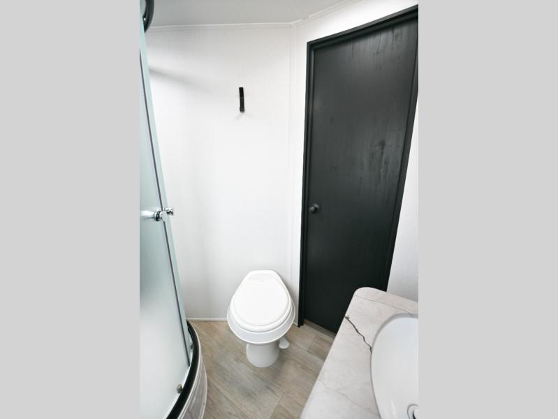 There's a comfortable place to sleep for the whole family in this travel trailer! The rear private bunkhouse has a set of 28" x 76" bunk beds, a 28" x 65" bunk above a sofa, and a wardrobe with an entertainment center above it so they can bring a cousin or two to join in on the fun. You will have your own privacy with the front private bedroom which has a queen bed with shirt closets on either side of it. The spacious full bathroom has a 34" x 34" radius shower for everyone to freshen up and one of the entrances leads directly outside so you can get back to having fun fast. Prepare your best home cooked meals indoors with the walk-in pantry, the three burner cooktop, and the 12V refrigerator. Plus, there is a U-shaped dinette to enjoy your meals and even transform into an extra sleeping space! Choose the optional mini outside kitchen for even more convenience!