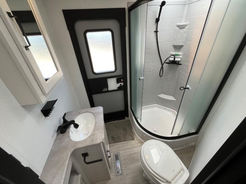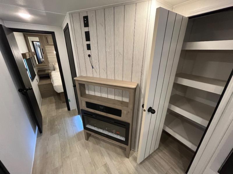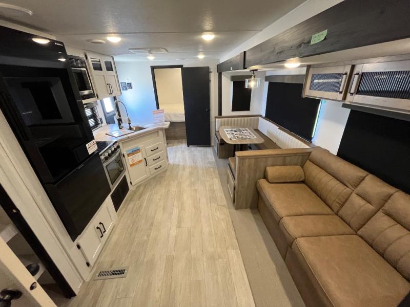 With two full bedrooms, everyone will have their own private retreat in this travel trailer! The front private bedroom has a queen bed with shirt closets and nightstands on either side of it, and the rear private bedroom has a queen bed with a shirt closet. The spacious full bathroom has a 34" x 34" radius shower for everyone to freshen up and one of the entrances leads directly outside so you can get back to having fun fast. Prepare your best home cooked meals indoors with the walk-in pantry, stainless steel oven and range, and the 12V refrigerator. Plus, there is a U-shaped dinette to enjoy your meals and even transform into an extra sleeping space!