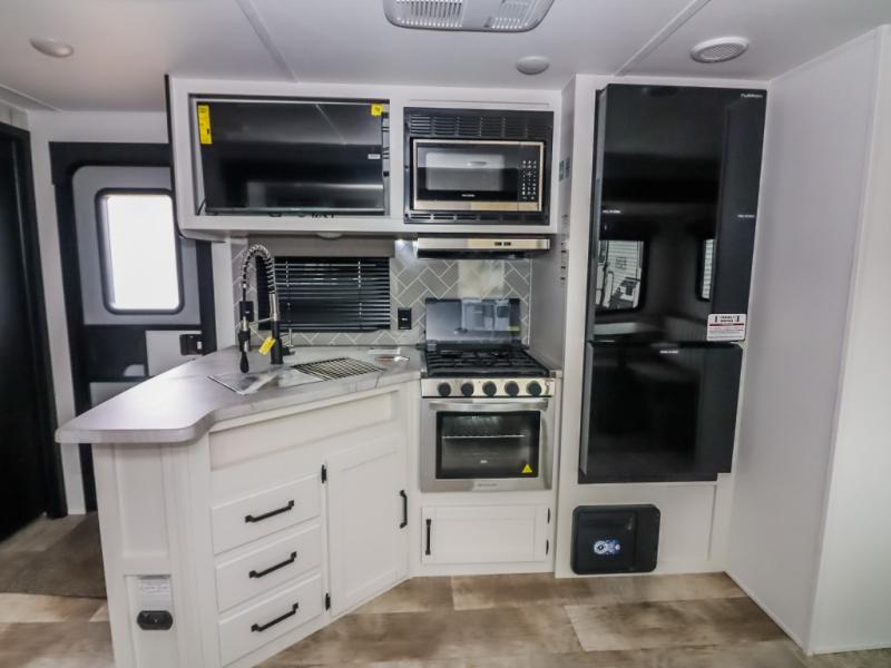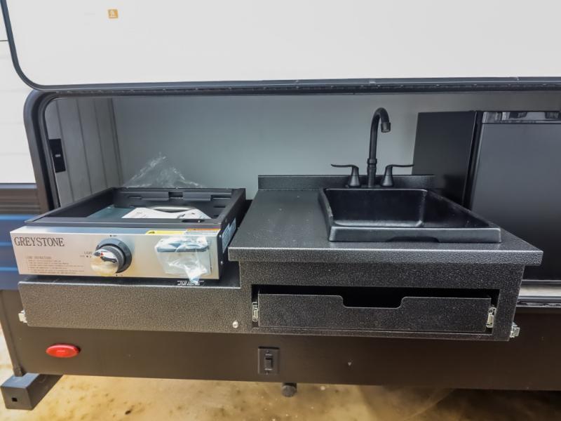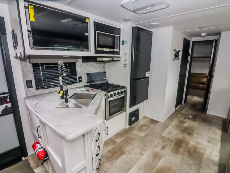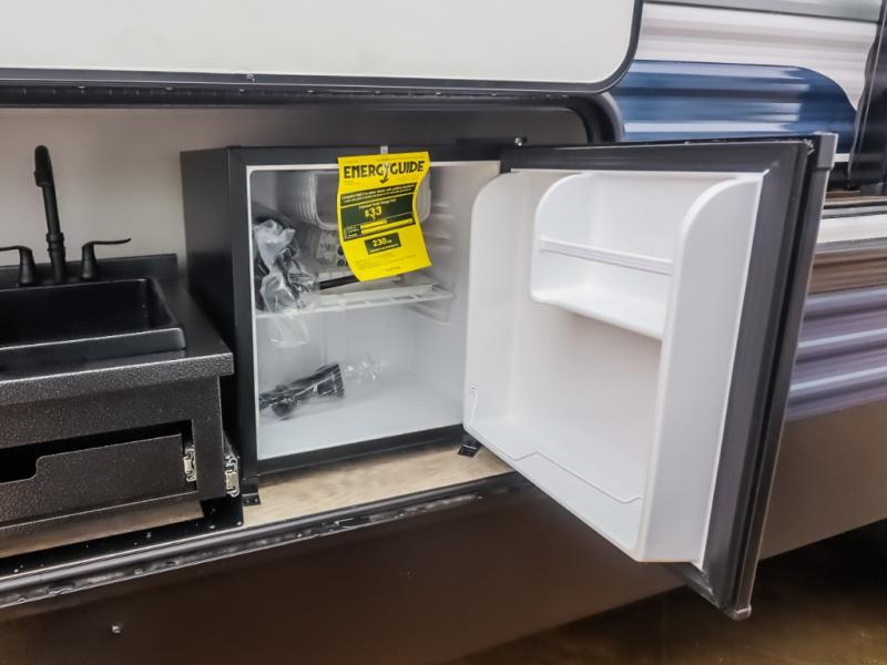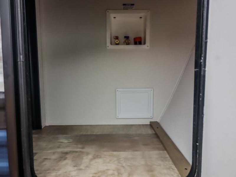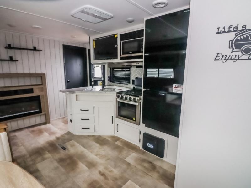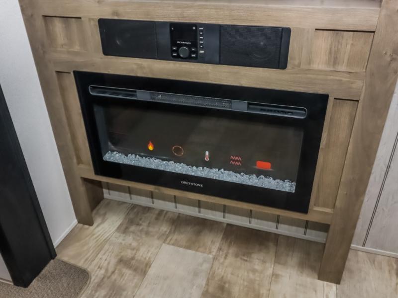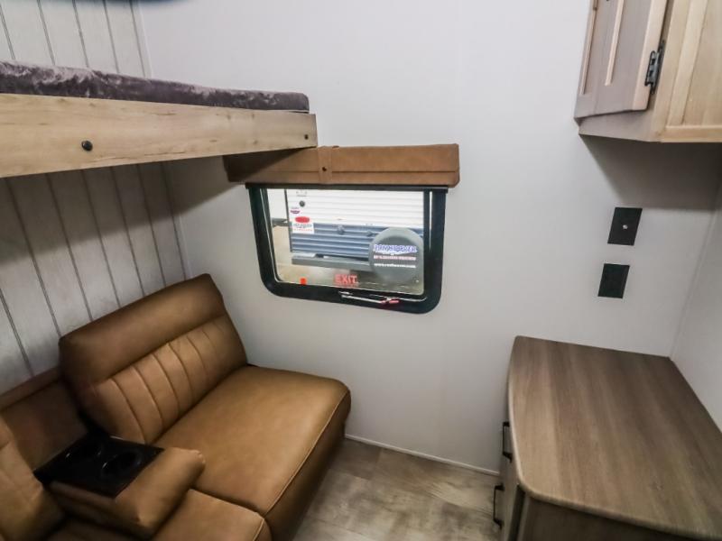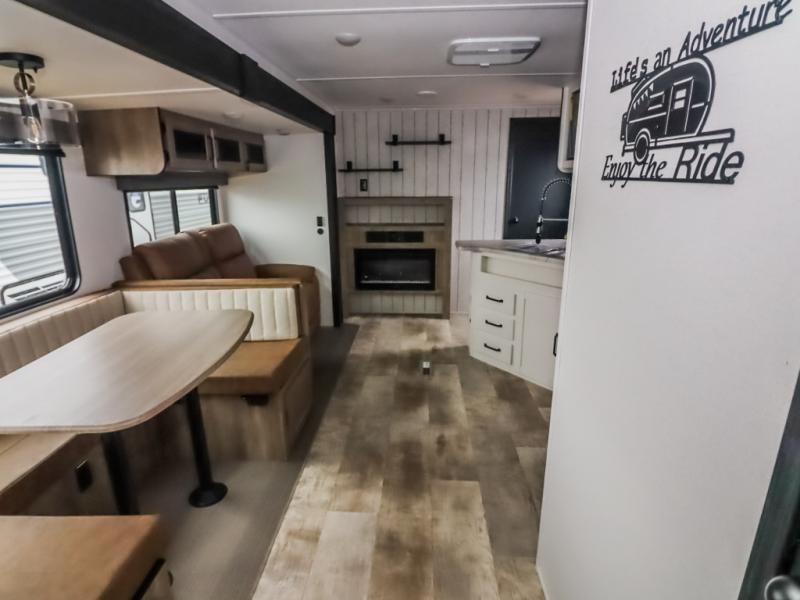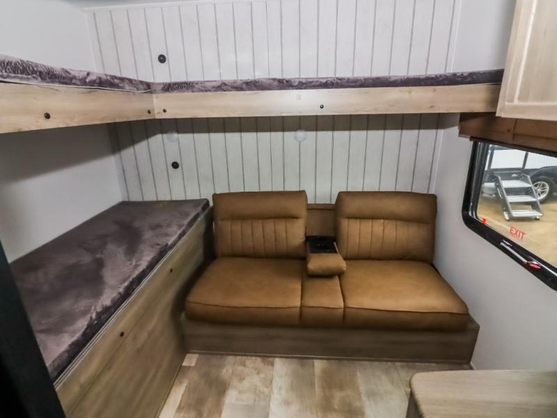 There's a comfortable place to sleep for the whole family in this travel trailer! The rear private bunkhouse features a set of 28" x 76" bunk beds, a 28" x 65" bunk above a sofa, and a wardrobe with an entertainment center above it so they can bring a friend or two to join in on the fun. You will have your own privacy with the front private bedroom which features a queen bed slide for added floor space, plus a large front closet for your clothing, and a second closet with washer/dryer prep, and a dresser too! Everyone will enjoy the full bath which features a 32" x 40" shower with seat to freshen up in so you can skip the public facilities. This unit also offers a spacious combined kitchen and living room which features a U-dinette and sofa slide for plenty of seating for meals and hanging out, and an entertainment center and fireplace to enjoy when spending time inside. You will easily be able to prepare your best home cooked meals using the full interior kitchen, or you may wish to choose the optional outside kitchen with griddle.