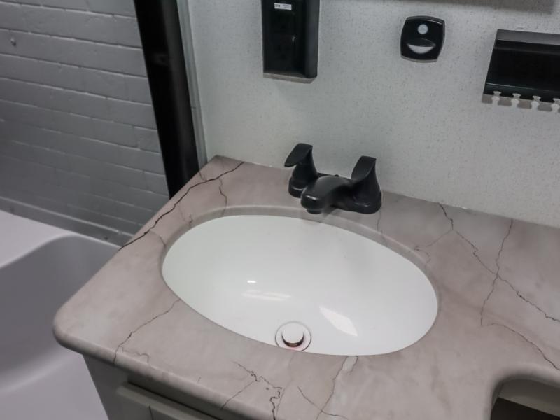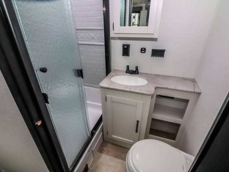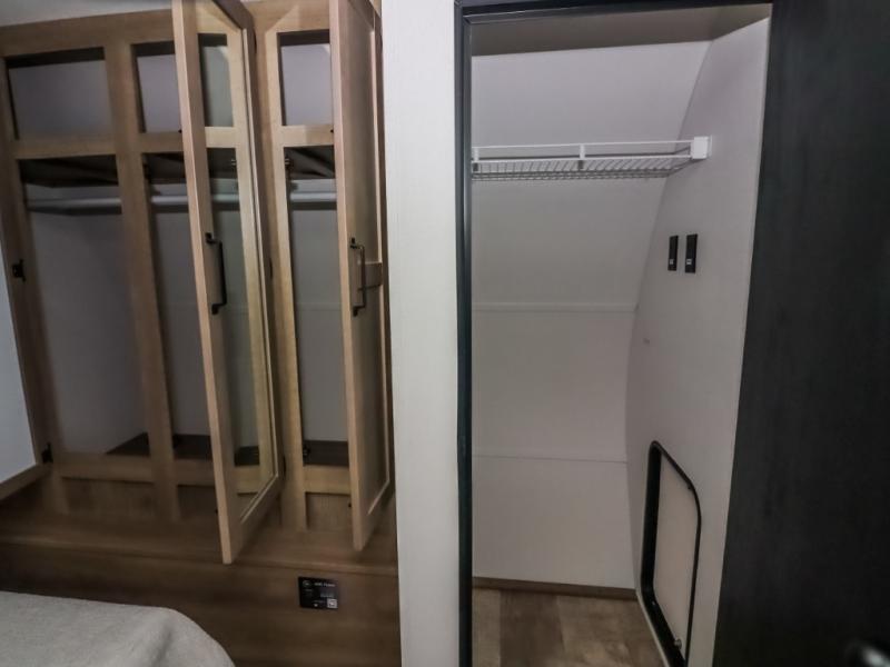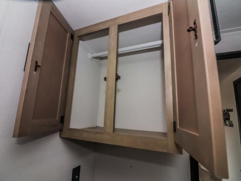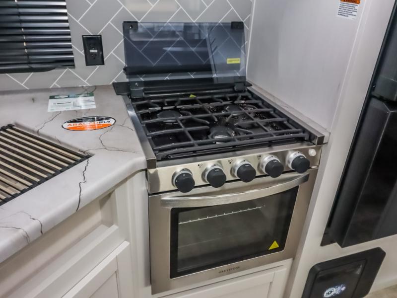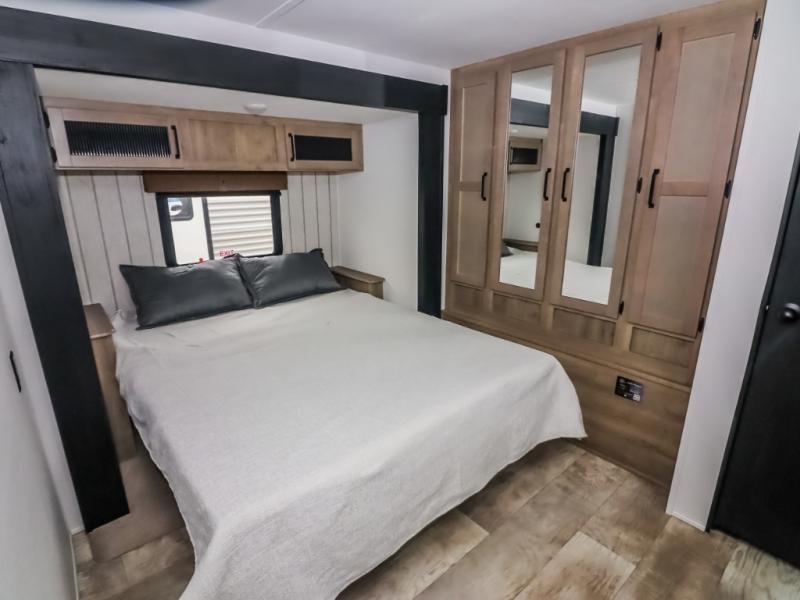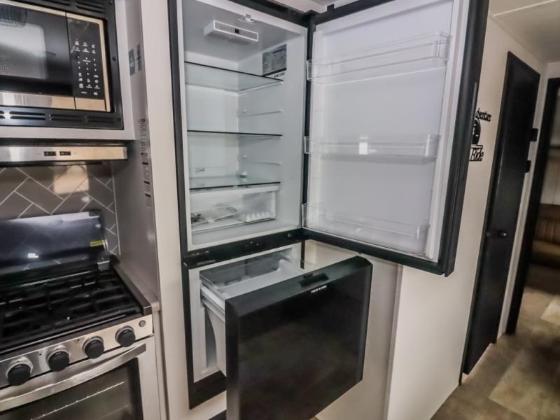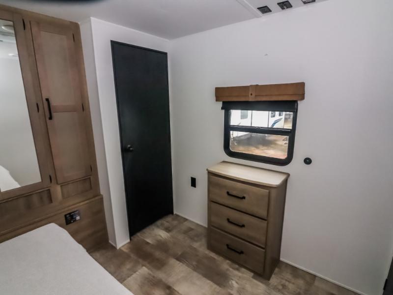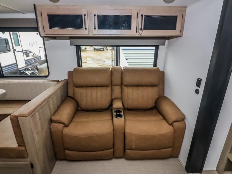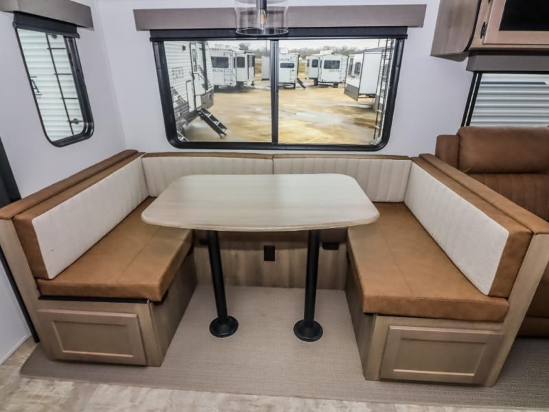There's a comfortable place to sleep for the whole family in this travel trailer! The rear private bunkhouse features a set of 28" x 76" bunk beds, a 28" x 65" bunk above a sofa, and a wardrobe with an entertainment center above it so they can bring a friend or two to join in on the fun. You will have your own privacy with the front private bedroom which features a queen bed slide for added floor space, plus a large front closet for your clothing, and a second closet with washer/dryer prep, and a dresser too! Everyone will enjoy the full bath which features a 32" x 40" shower with seat to freshen up in so you can skip the public facilities. This unit also offers a spacious combined kitchen and living room which features a U-dinette and sofa slide for plenty of seating for meals and hanging out, and an entertainment center and fireplace to enjoy when spending time inside. You will easily be able to prepare your best home cooked meals using the full interior kitchen, or you may wish to choose the optional outside kitchen with griddle.
