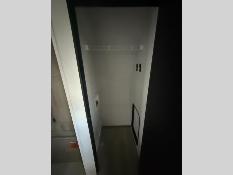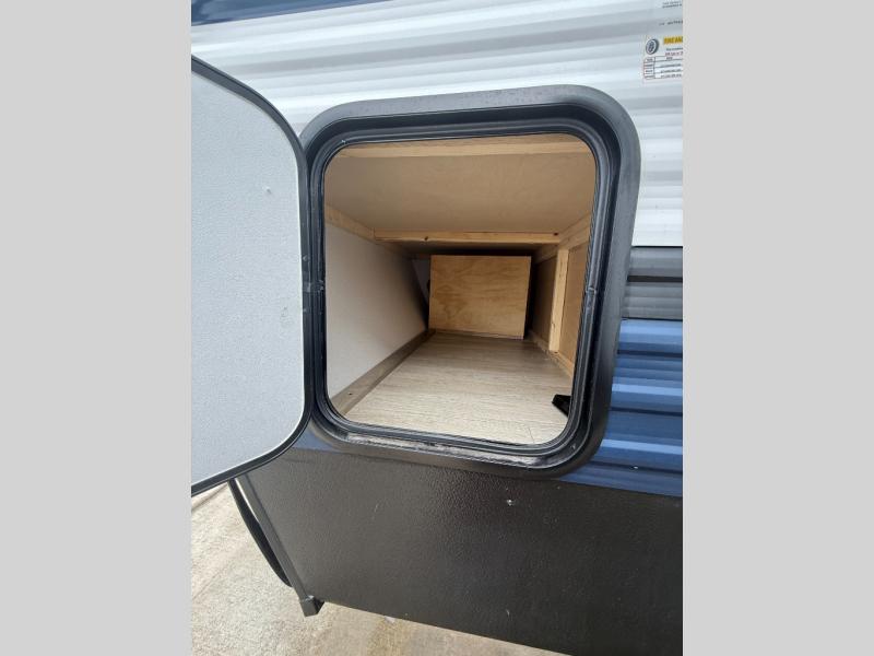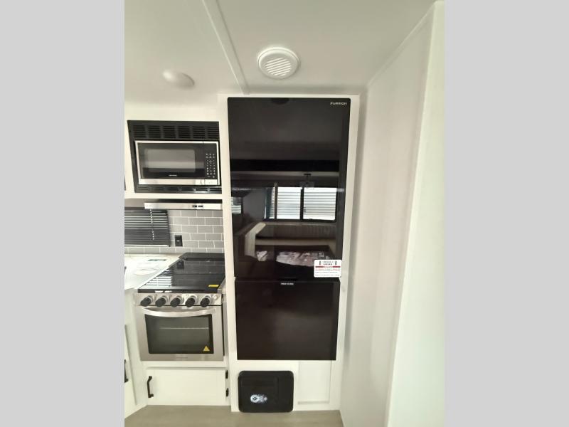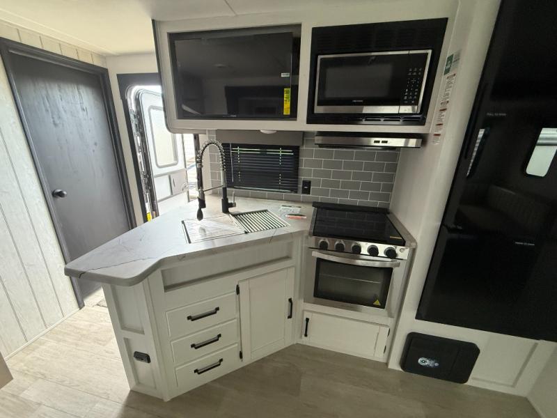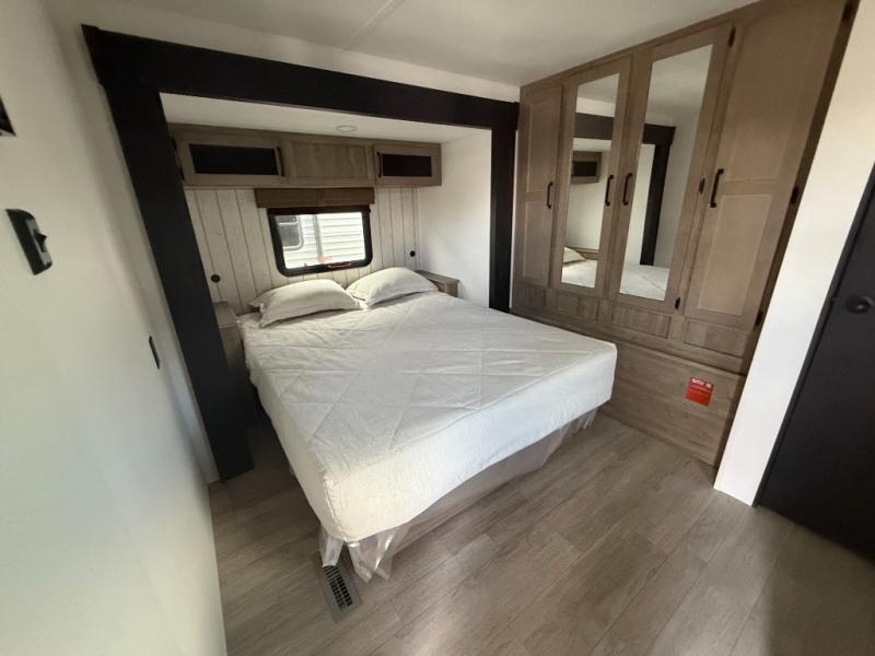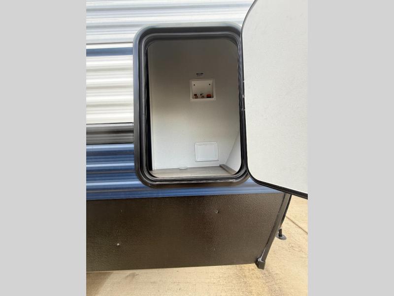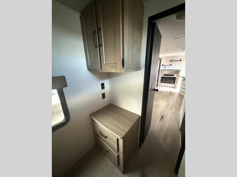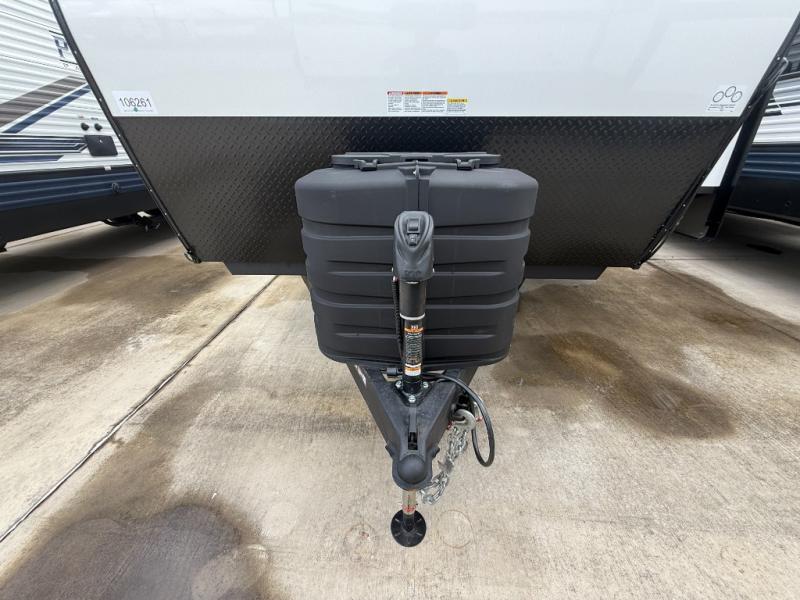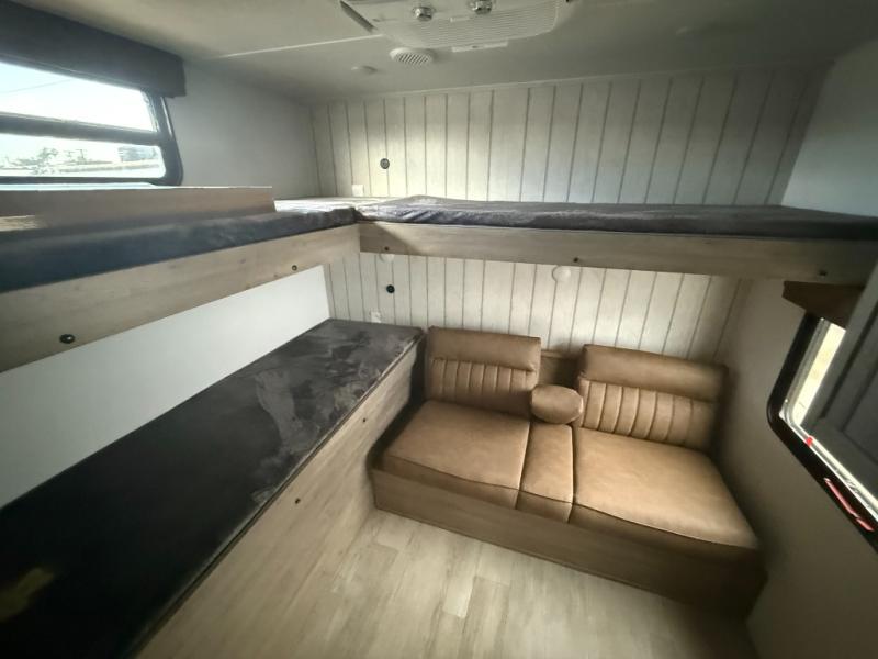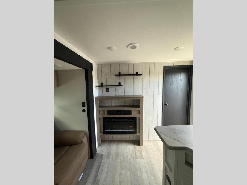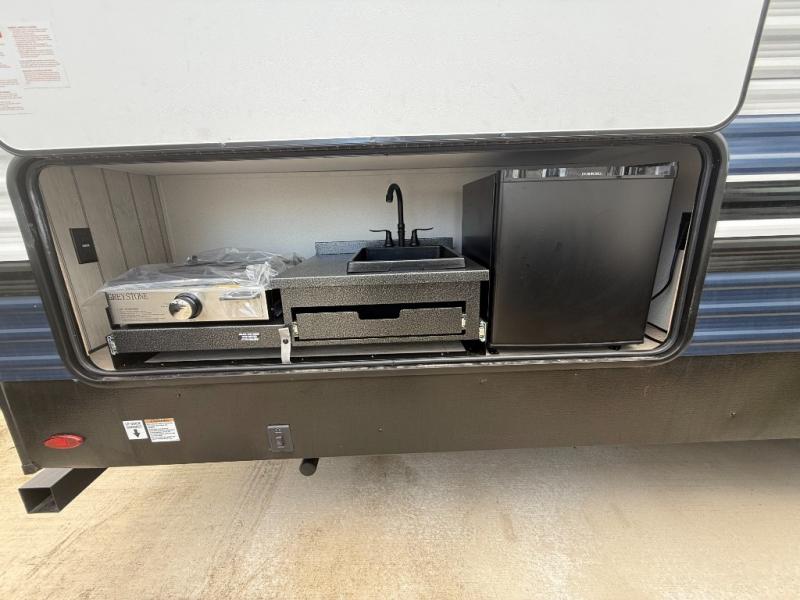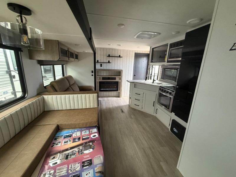 There's a comfortable place to sleep for the whole family in this travel trailer! The rear private bunkhouse features a set of 28" x 76" bunk beds, a 28" x 65" bunk above a sofa, and a wardrobe with an entertainment center above it so they can bring a friend or two to join in on the fun. You will have your own privacy with the front private bedroom which features a queen bed slide for added floor space, plus a large front closet for your clothing, and a second closet with washer/dryer prep, and a dresser too! Everyone will enjoy the full bath which features a 32" x 40" shower with seat to freshen up in so you can skip the public facilities. This unit also offers a spacious combined kitchen and living room which features a U-dinette and sofa slide for plenty of seating for meals and hanging out, and an entertainment center and fireplace to enjoy when spending time inside. You will easily be able to prepare your best home cooked meals using the full interior kitchen, or you may wish to choose the optional outside kitchen with griddle.