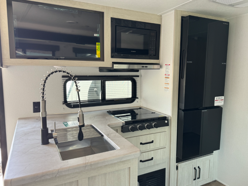 The Puma Camping Edition by Palomino offer an affordable travel trailer for rookie campers or seasoned RVers! They are built with 5/8" tongue and groove plywood flooring and a front diamond plate for added protection. There are also exterior clamp style door latches, back up camera prep, and 20 lb. LP bottles. Head inside to find Thermofoil countertops with a smooth drop edge, bedroom USB ports and outlets, and a GE appliance and kitchen package.