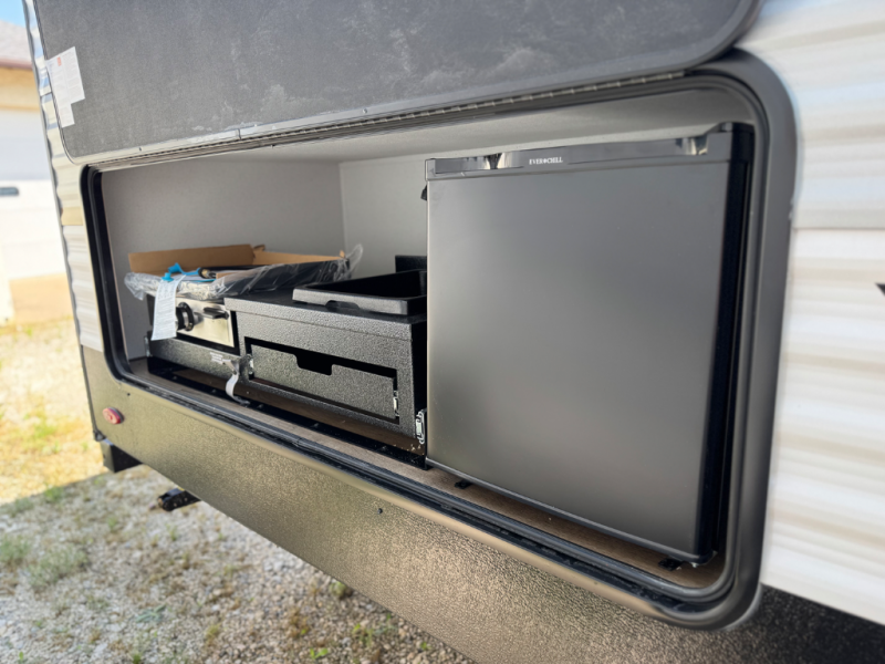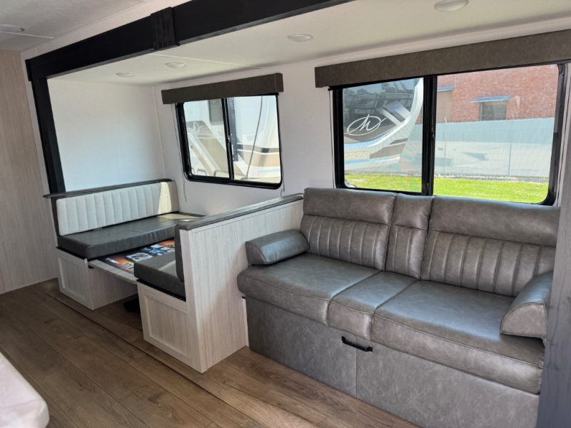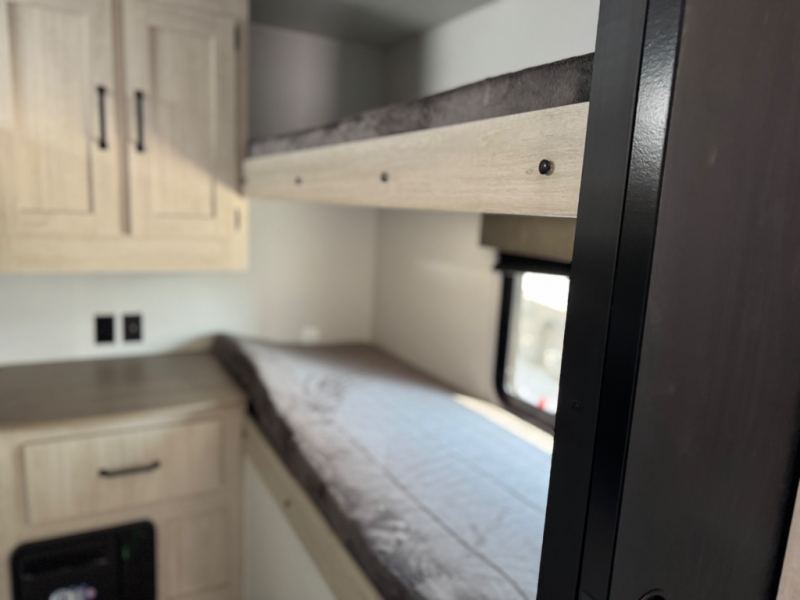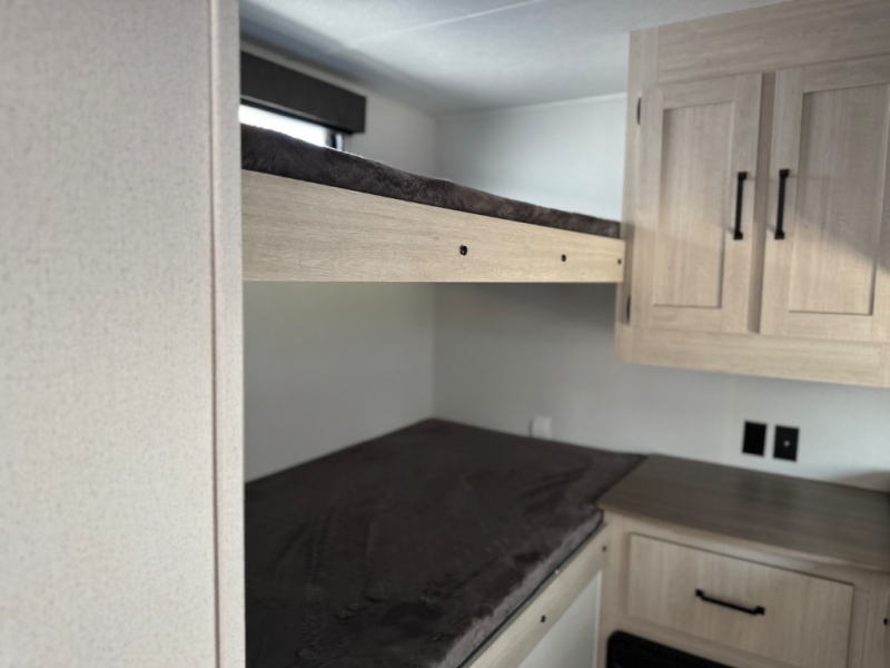 If you're looking for more space, this double axle unit features a large slide so you can walk about freely. Here, you'll find the booth dinette and sofa, which sit across from the optional TV if you want to enjoy movie nights. The full kitchen includes a stainless microwave and three burner cooktop to make meals, plus a pantry and 12V refrigerator for food storage. And an optional outside kitchen with a griddle can be added if you enjoy cooking outdoors! Your guests or littles are sure to enjoy the rear private bunkhouse with four bunk beds and a wardrobe for their things!