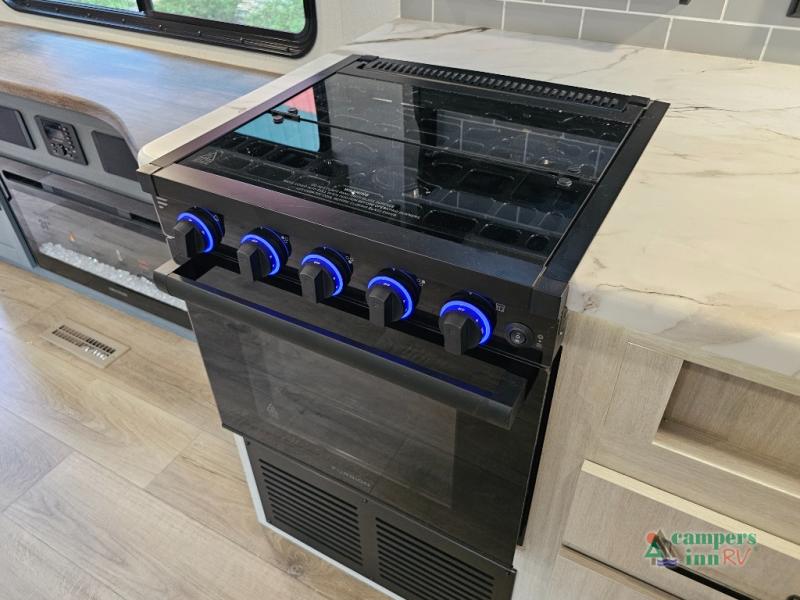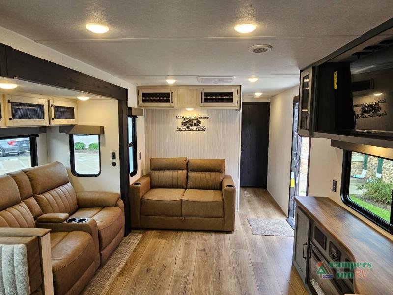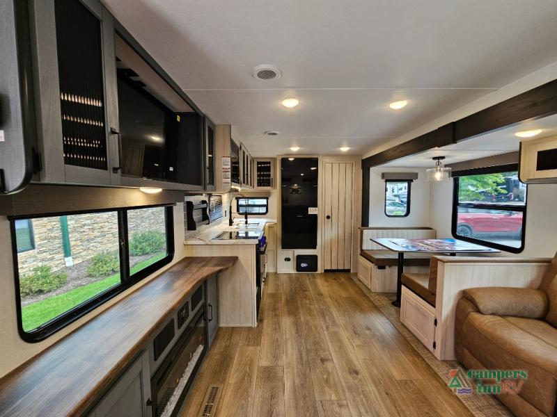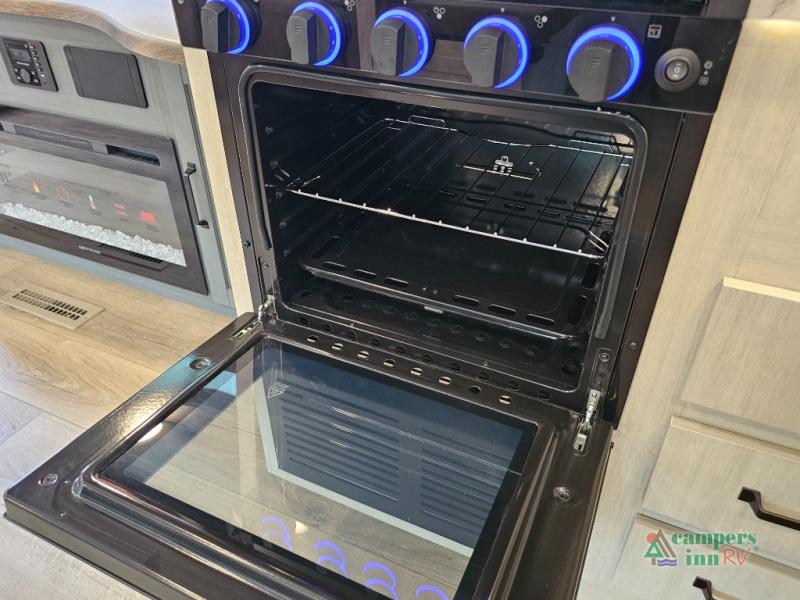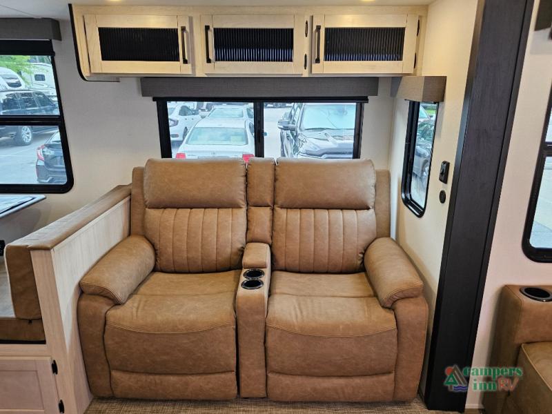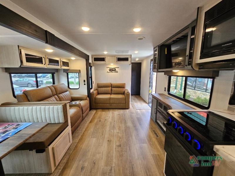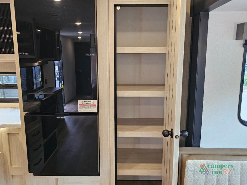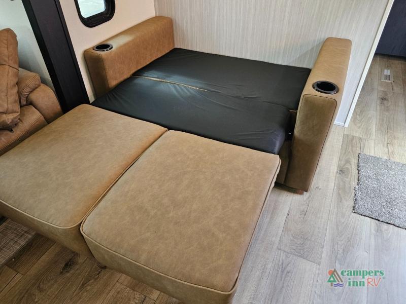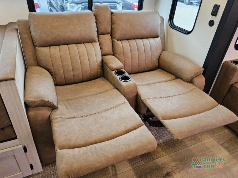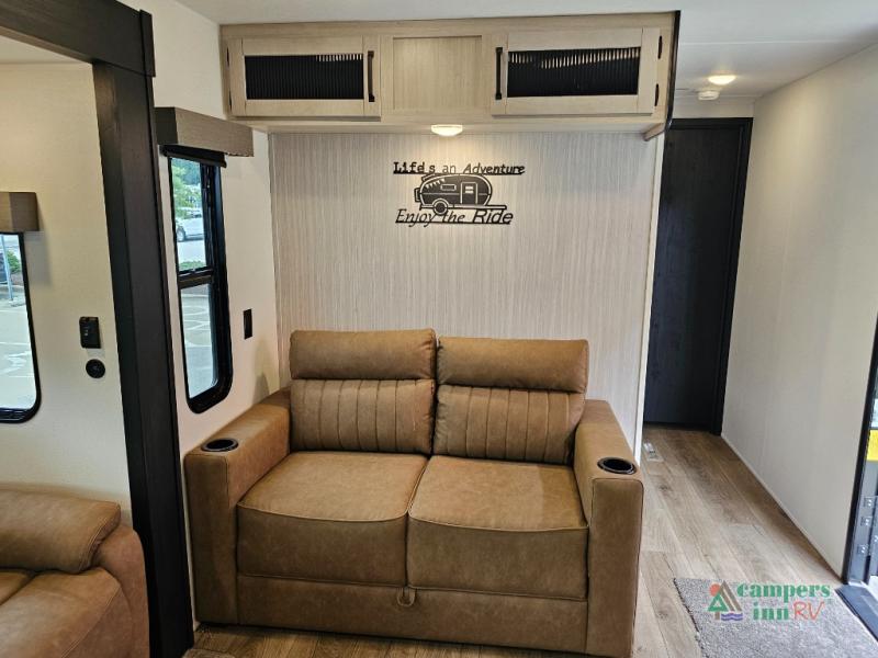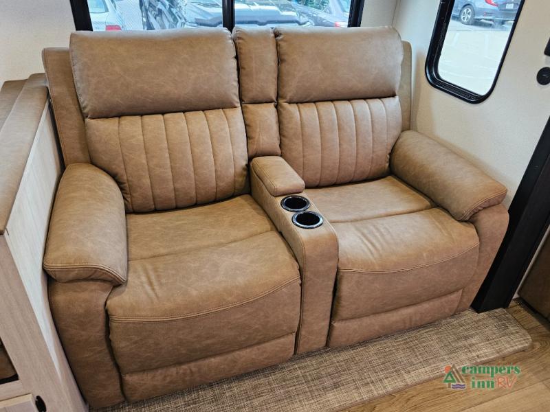 You won't want to camp any other way once you step inside this travel trailer! The rear kitchen has a stainless steel oven and range to prepare your best meals, a 12V refrigerator to keep your perishables fresh, and a walk-in pantry for your canned goods and snacks for movie night. After a fun day at the beach, you can play a card game at the booth dinette, relax in either one of the two recliners and sofa, or rinse the sand out of your hair in the 32" x 40" shower with a seat in the full bathroom. There is also a front private bedroom with a queen bed slide across from a dresser and a front closet with another closet with washer and dryer prep.