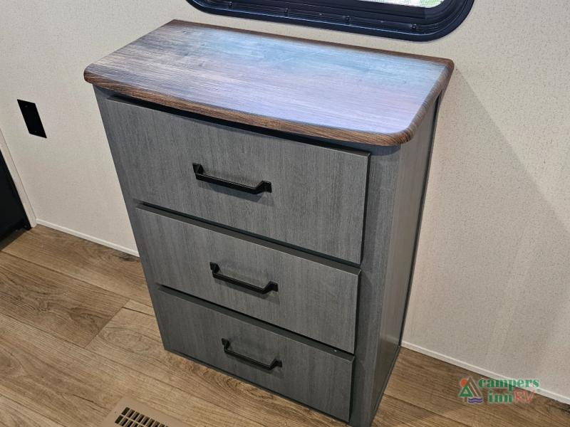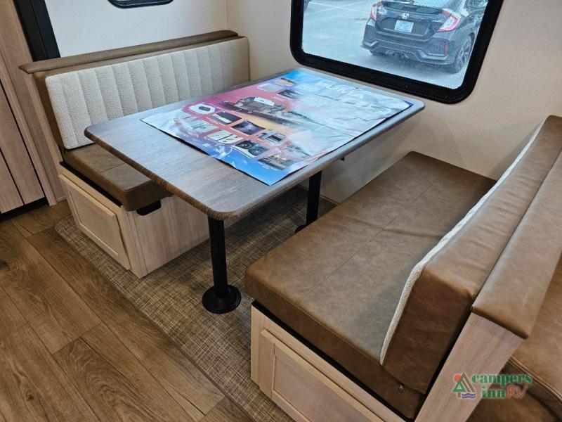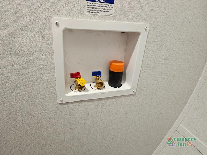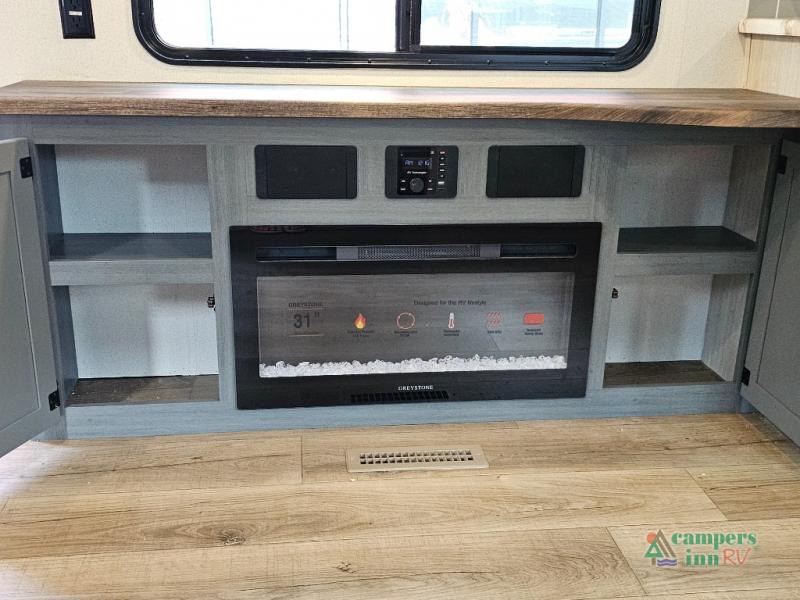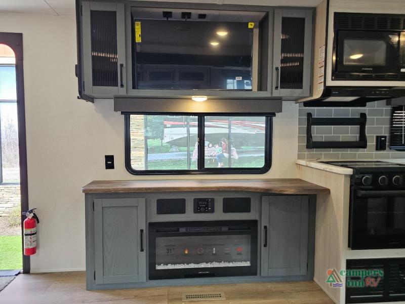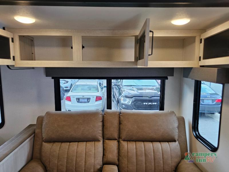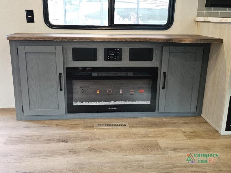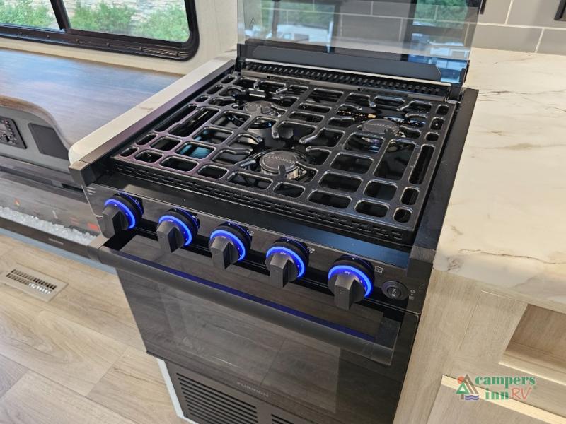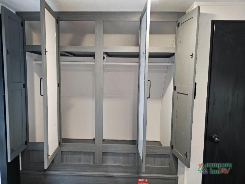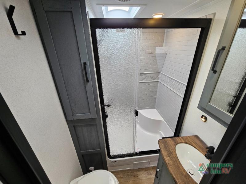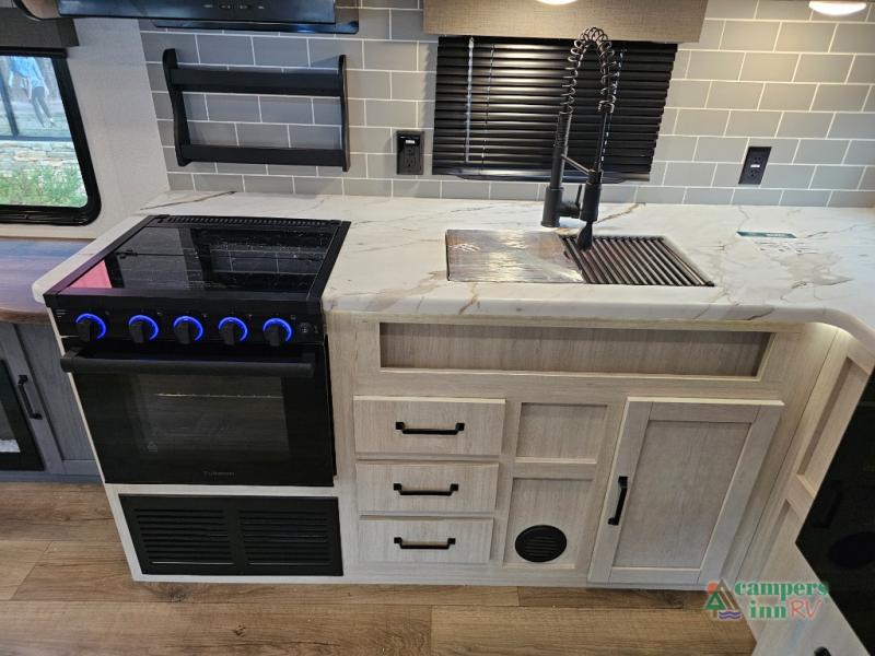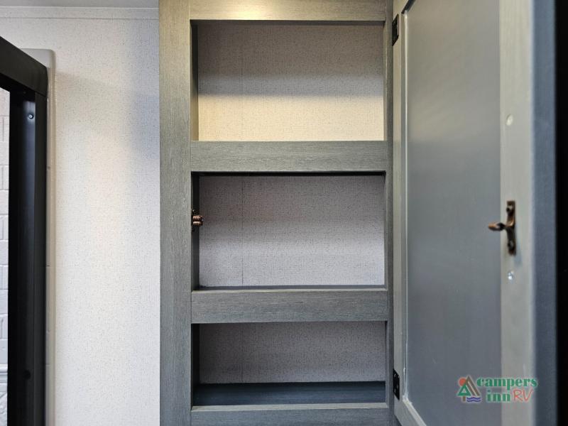 You won't want to camp any other way once you step inside this travel trailer! The rear kitchen has a stainless steel oven and range to prepare your best meals, a 12V refrigerator to keep your perishables fresh, and a walk-in pantry for your canned goods and snacks for movie night. After a fun day at the beach, you can play a card game at the booth dinette, relax in either one of the two recliners and sofa, or rinse the sand out of your hair in the 32" x 40" shower with a seat in the full bathroom. There is also a front private bedroom with a queen bed slide across from a dresser and a front closet with another closet with washer and dryer prep.