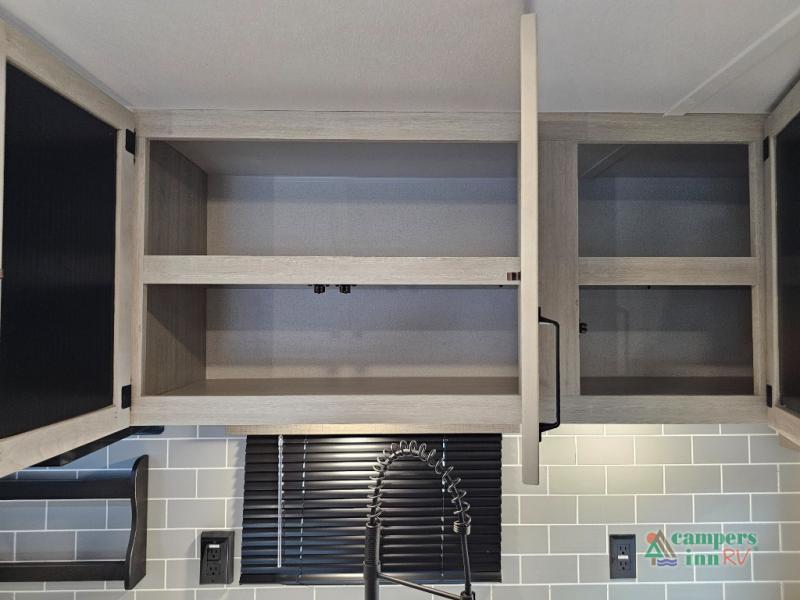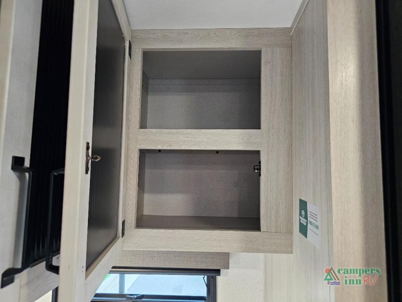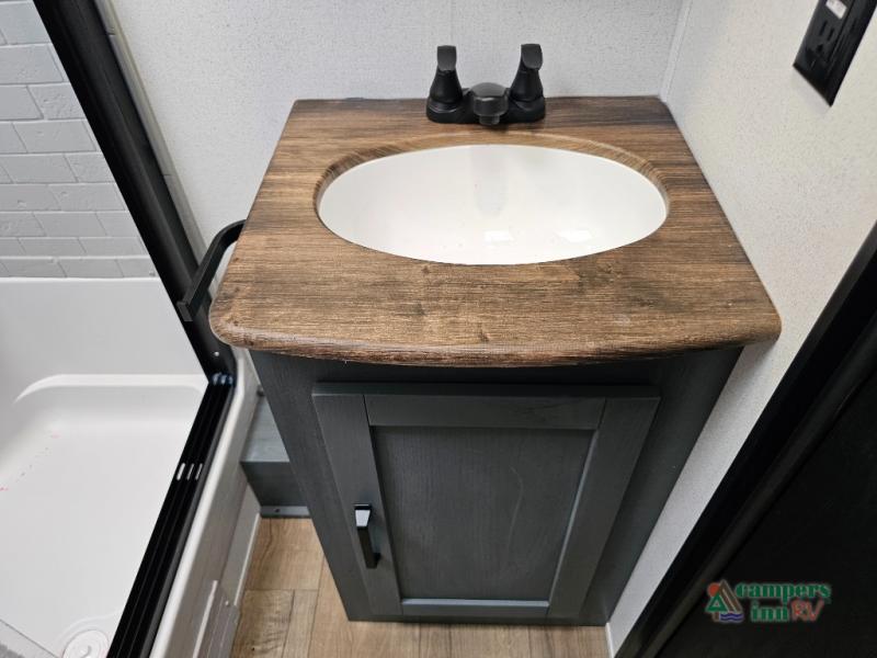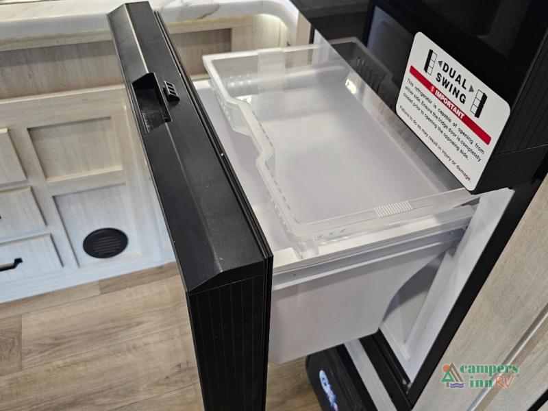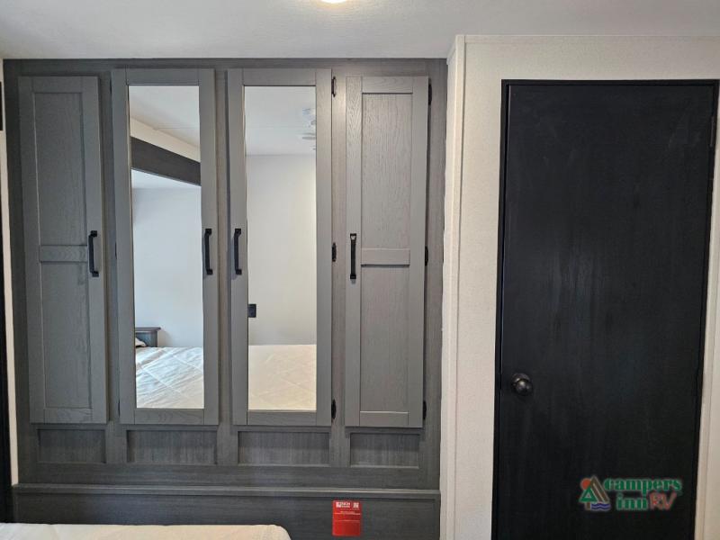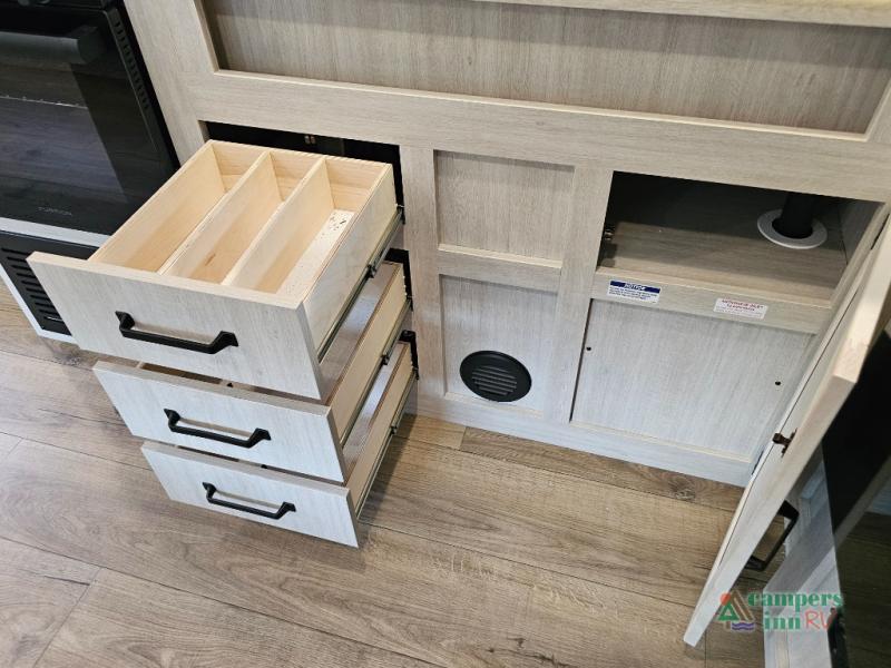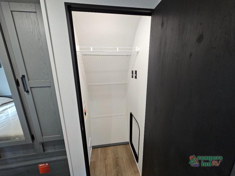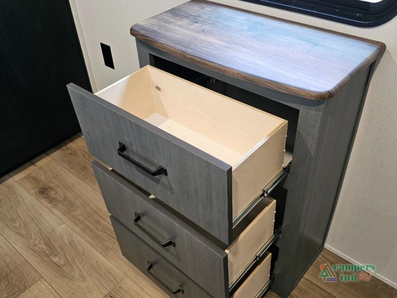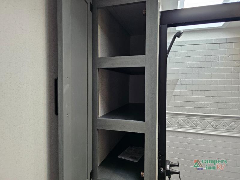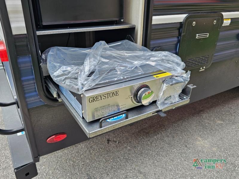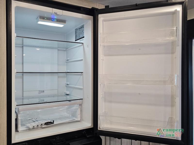 You won't want to camp any other way once you step inside this travel trailer! The rear kitchen has a stainless steel oven and range to prepare your best meals, a 12V refrigerator to keep your perishables fresh, and a walk-in pantry for your canned goods and snacks for movie night. After a fun day at the beach, you can play a card game at the booth dinette, relax in either one of the two recliners and sofa, or rinse the sand out of your hair in the 32" x 40" shower with a seat in the full bathroom. There is also a front private bedroom with a queen bed slide across from a dresser and a front closet with another closet with washer and dryer prep.