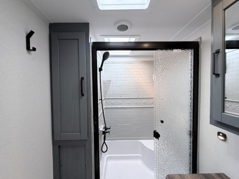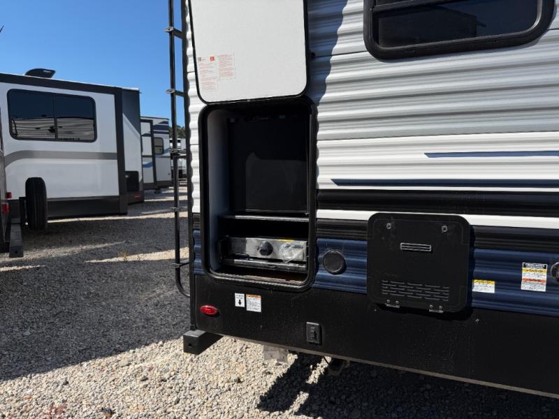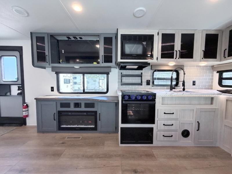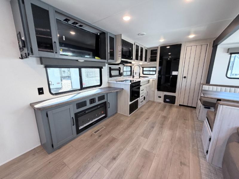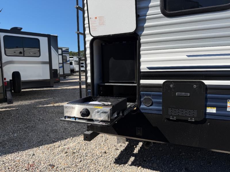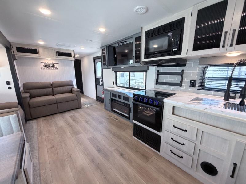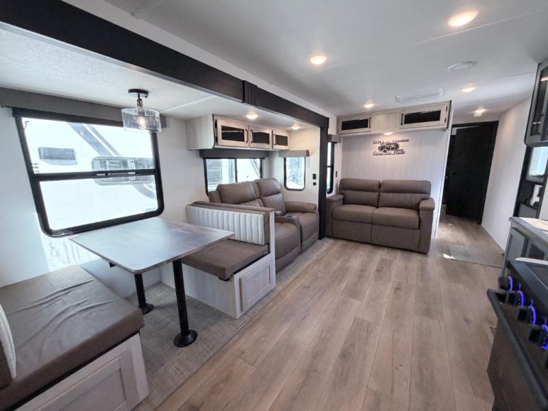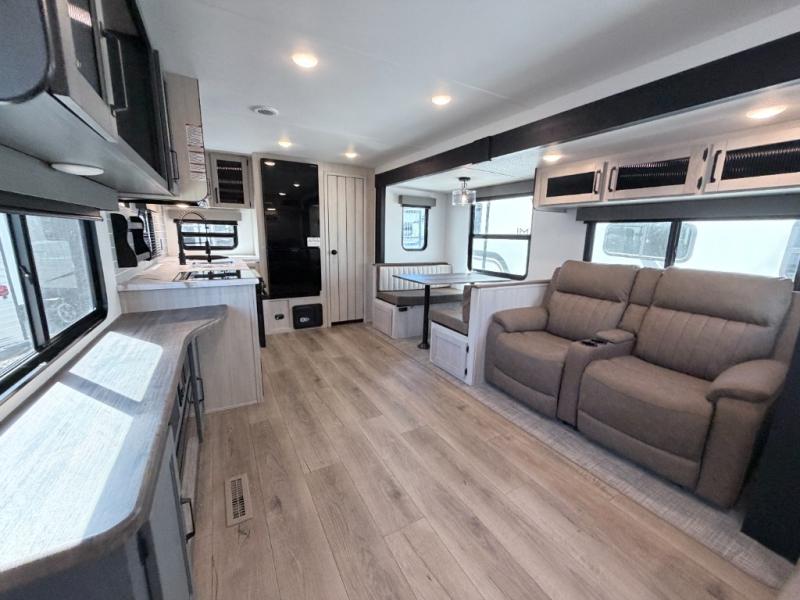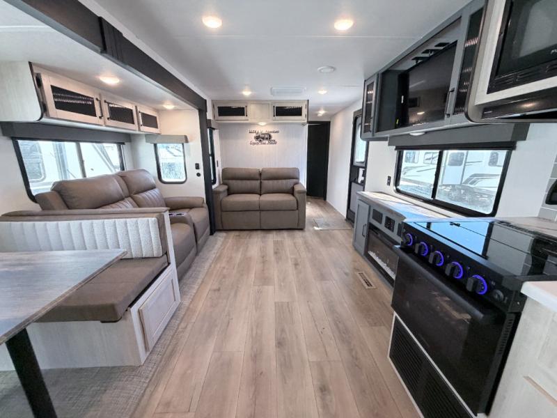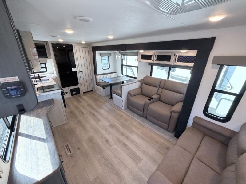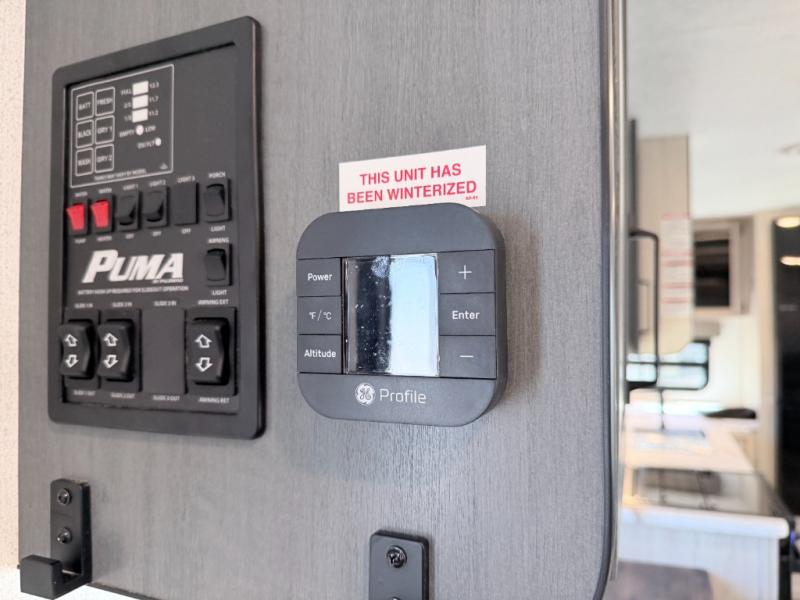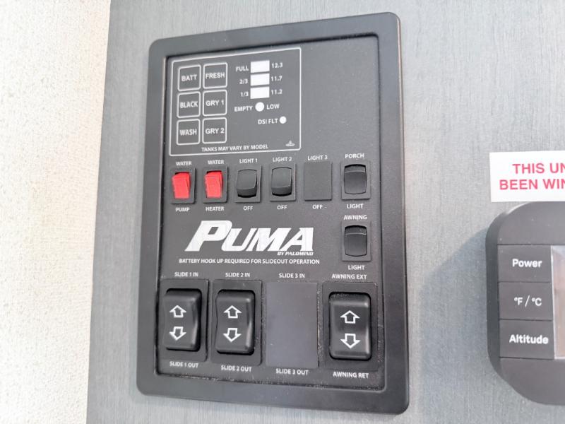 The Palomino Puma 30RKQS travel trailer offers comfort, functionality, and style for every adventure. Enjoy a fully equipped rear kitchen, spacious living area with recliners, and residential-style bedroom with washer/dryer prep. Stay cool with two A/C units, set up effortlessly with power stabilizer jacks, and cook under the stars with the outside kitchen. With durable construction and thoughtful amenities, the Puma 30RKQS makes every trip unforgettable.