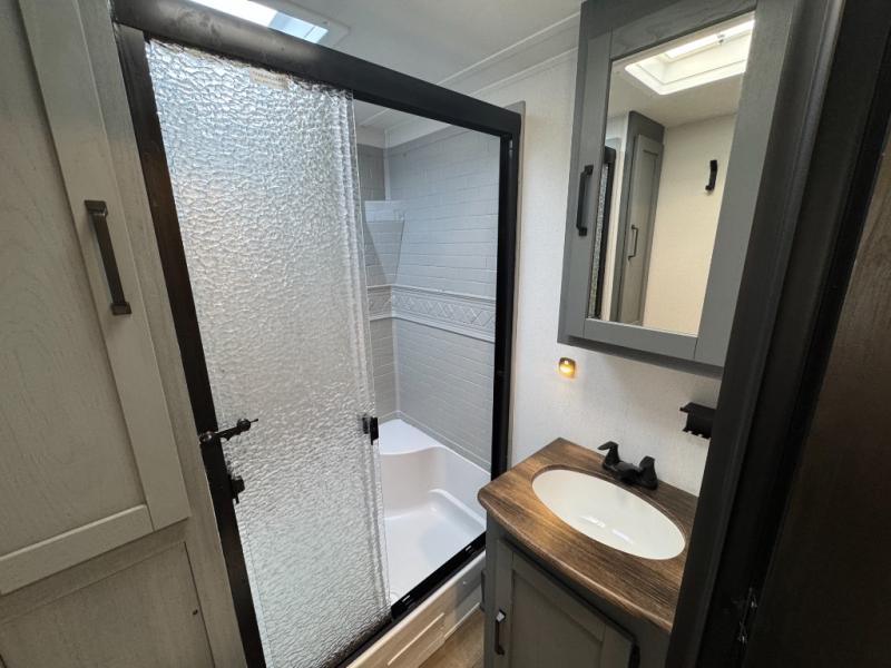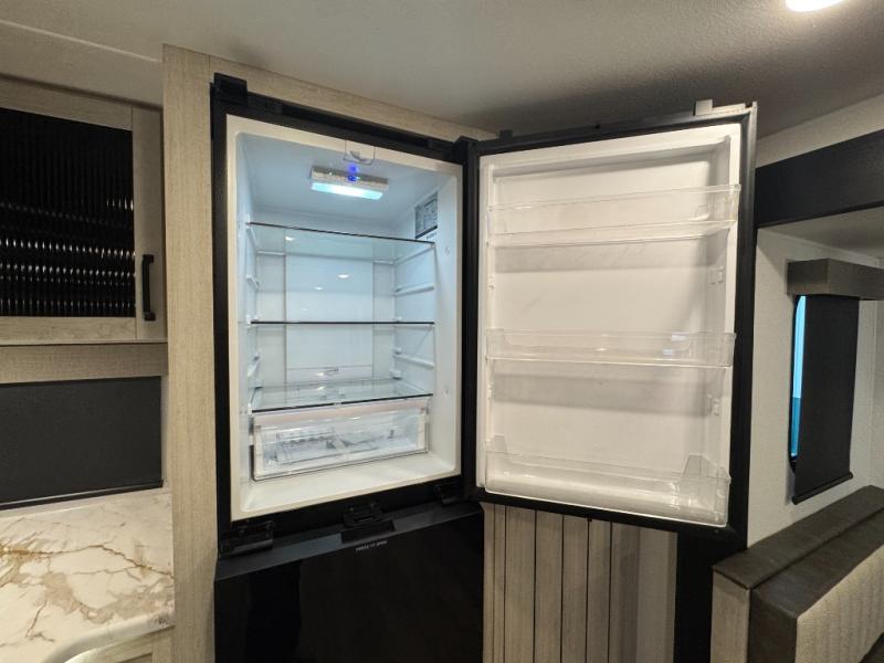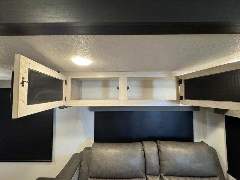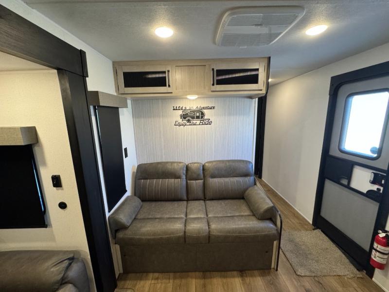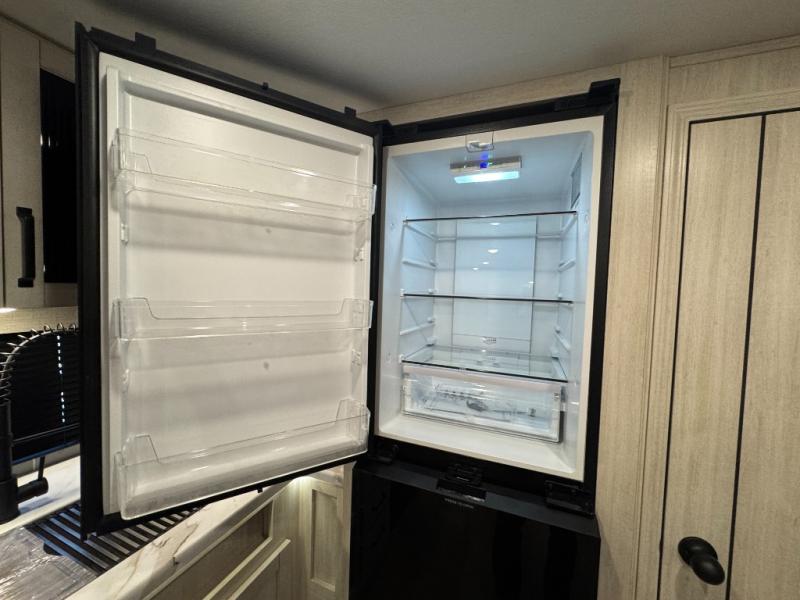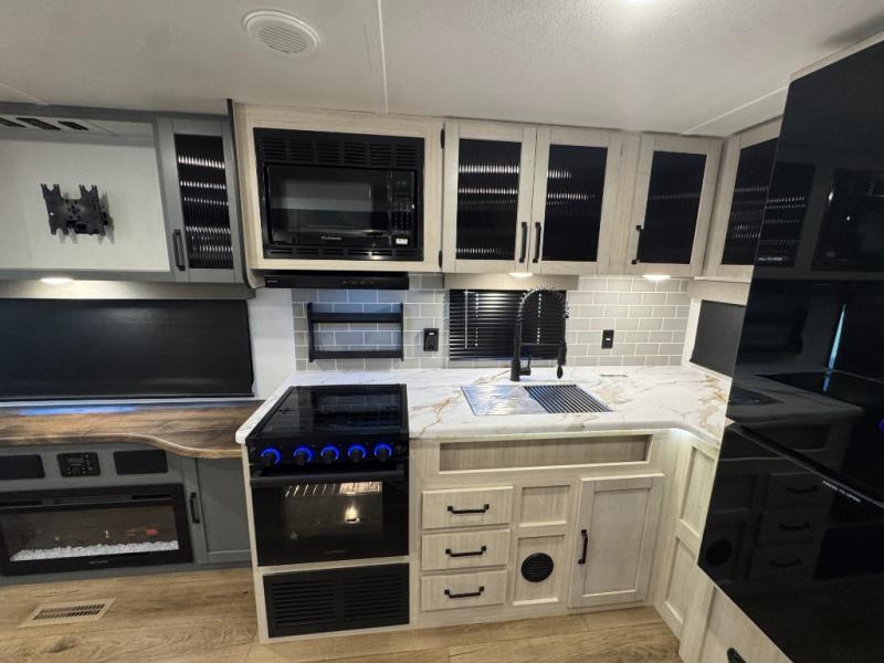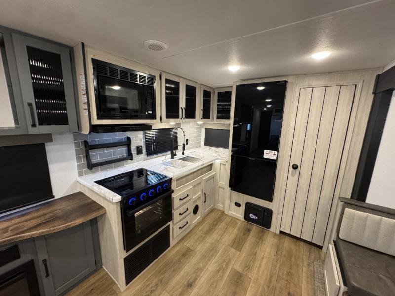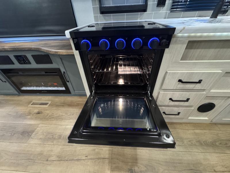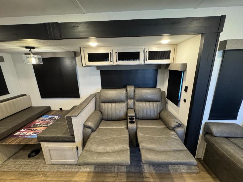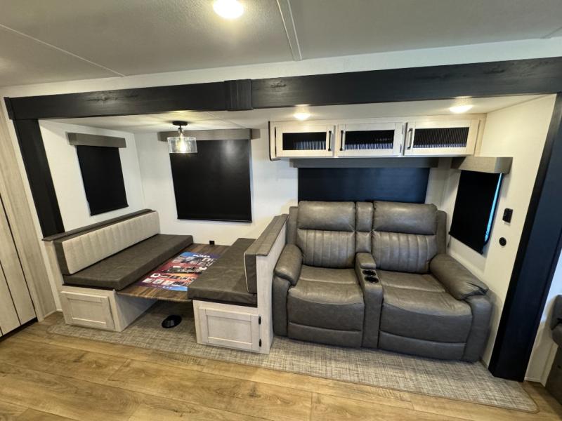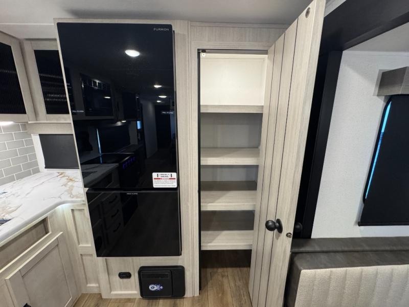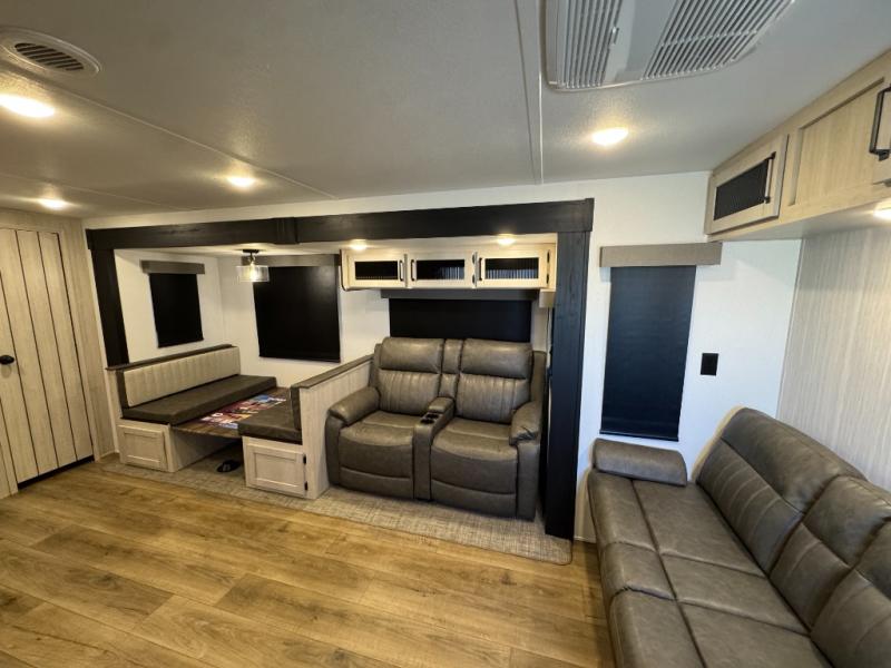You won't want to camp any other way once you step inside this travel trailer! The rear kitchen has a stainless-steel oven and range to prepare your best meals, a 12V refrigerator to keep your perishables fresh, and a walk-in pantry for your canned goods and snacks for movie night. After a fun day at the beach, you can play a card game at the booth dinette, relax on the theater seating and sofa, or rinse the sand out of your hair in the 32" x 40" shower with a seat in the full bathroom. There is also a front private bedroom with a queen bed slide across from a dresser and a front closet with another closet with washer and dryer prep.