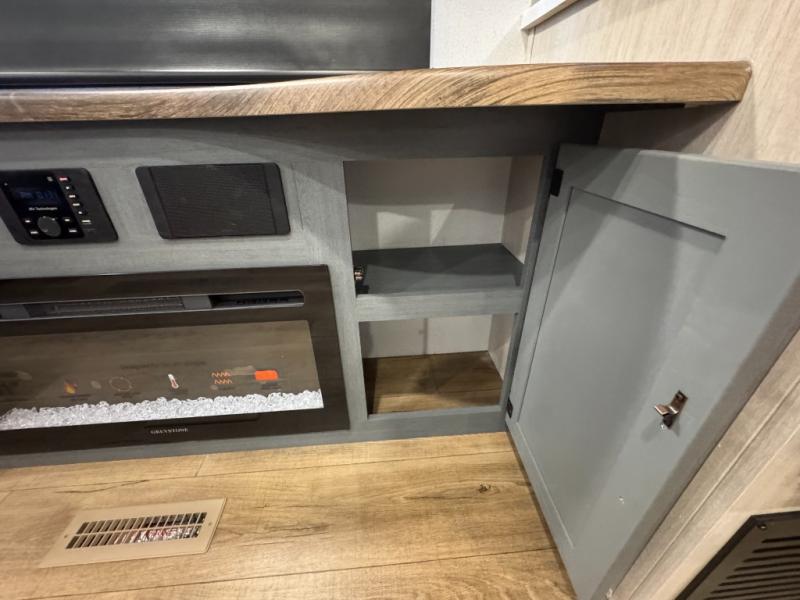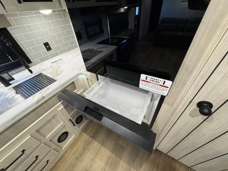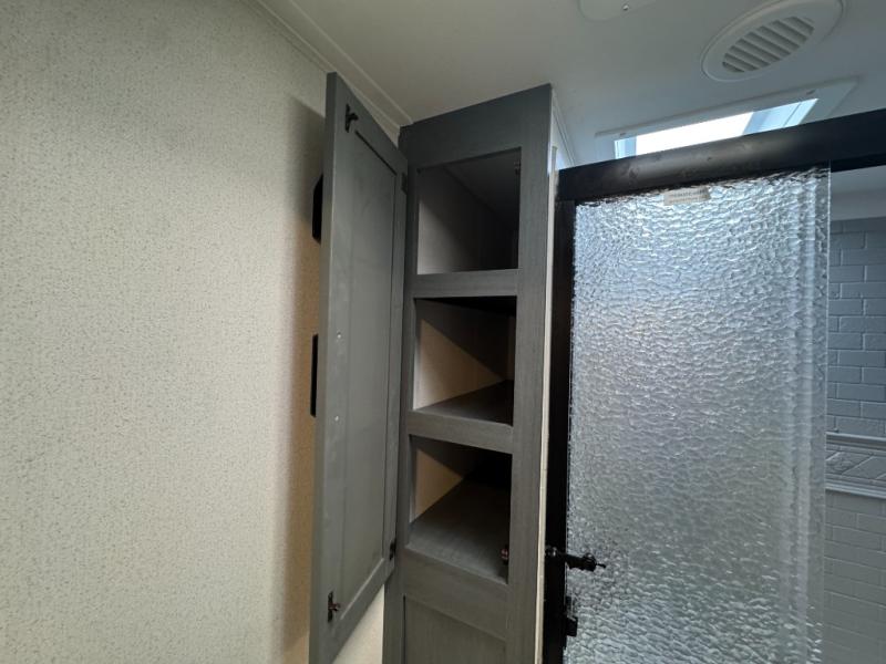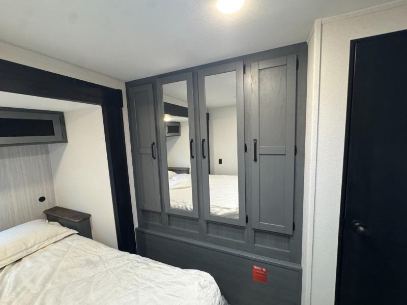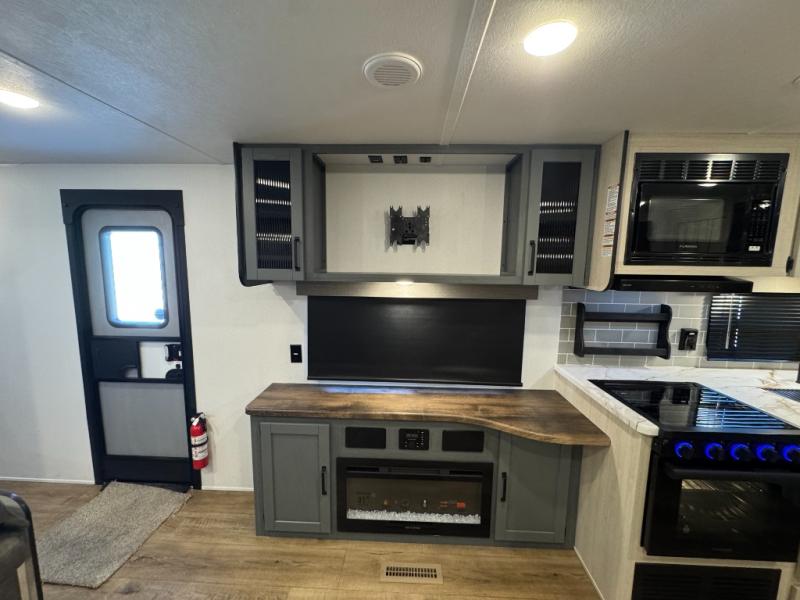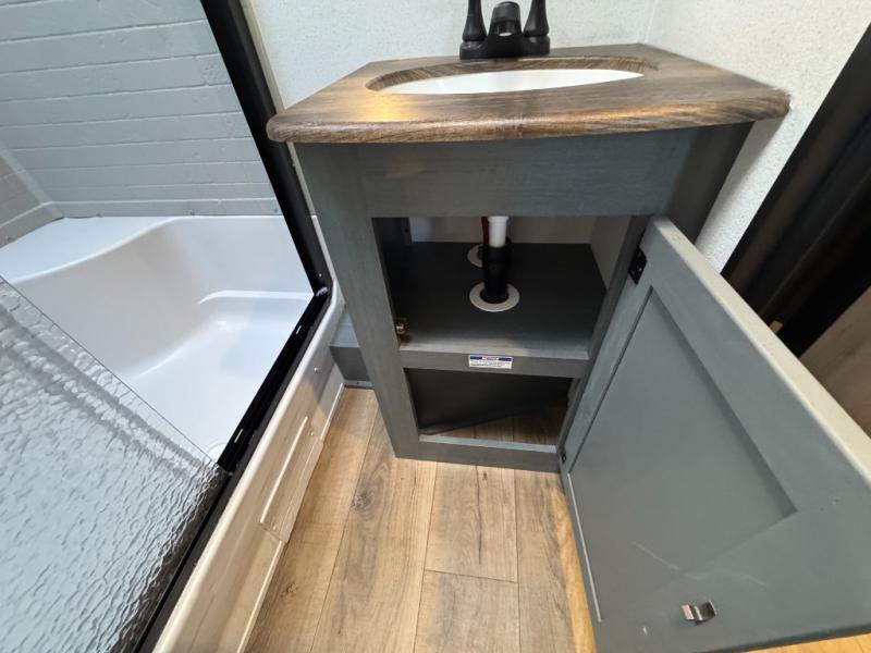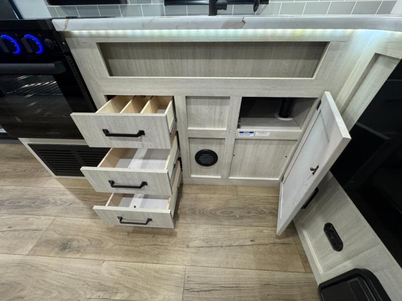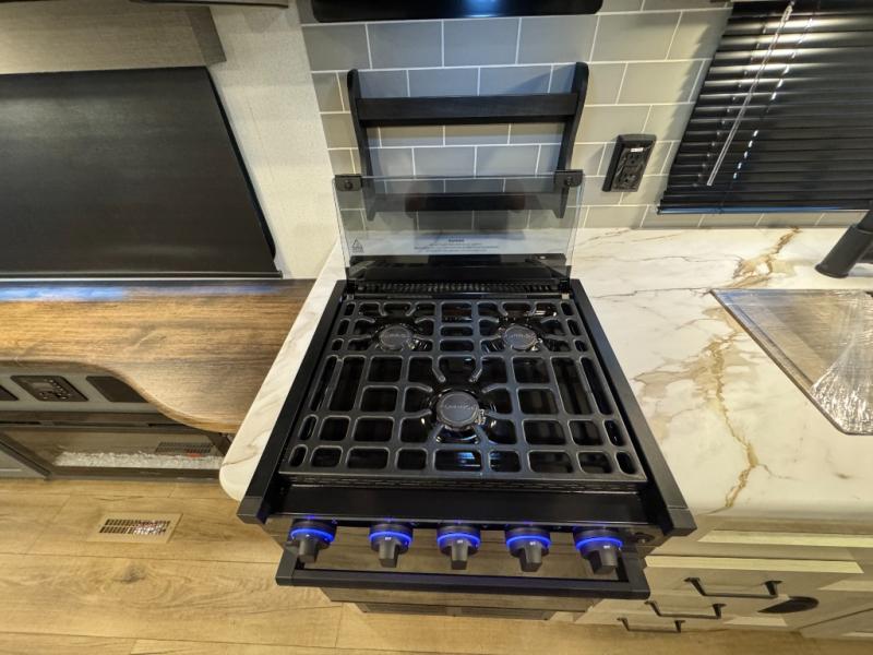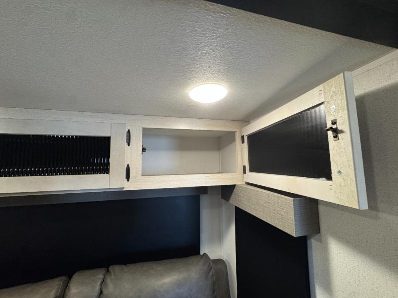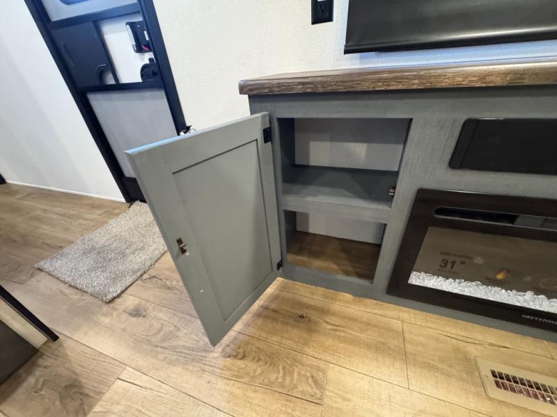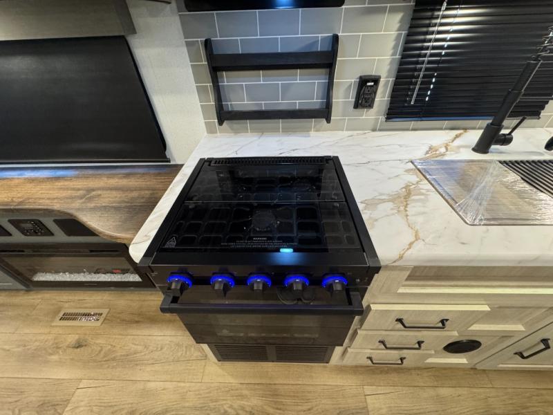 You won't want to camp any other way once you step inside this travel trailer! The rear kitchen has a stainless-steel oven and range to prepare your best meals, a 12V refrigerator to keep your perishables fresh, and a walk-in pantry for your canned goods and snacks for movie night. After a fun day at the beach, you can play a card game at the booth dinette, relax on the theater seating and sofa, or rinse the sand out of your hair in the 32" x 40" shower with a seat in the full bathroom. There is also a front private bedroom with a queen bed slide across from a dresser and a front closet with another closet with washer and dryer prep.