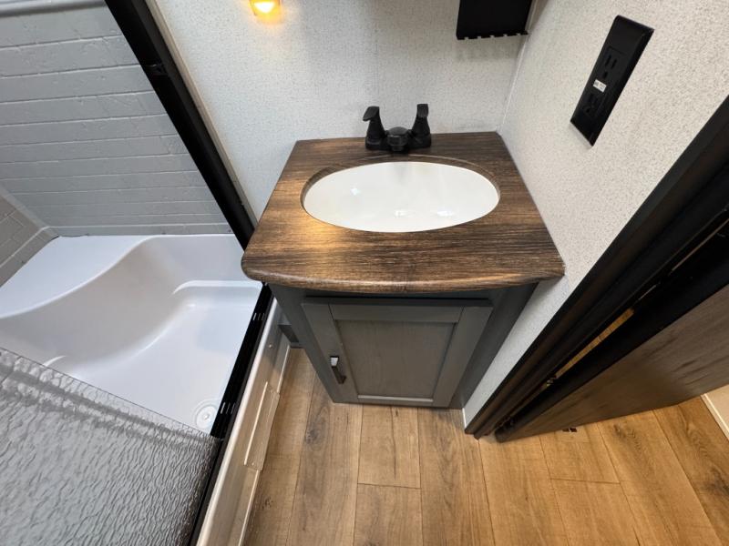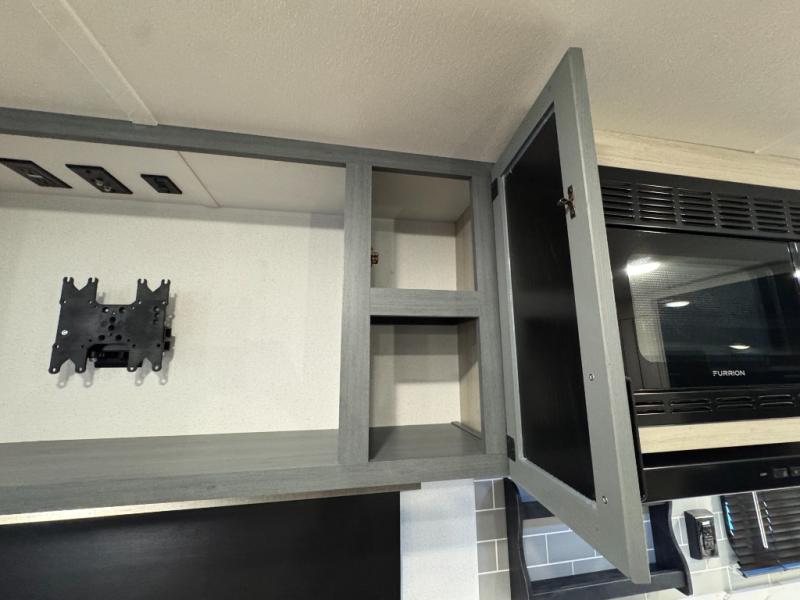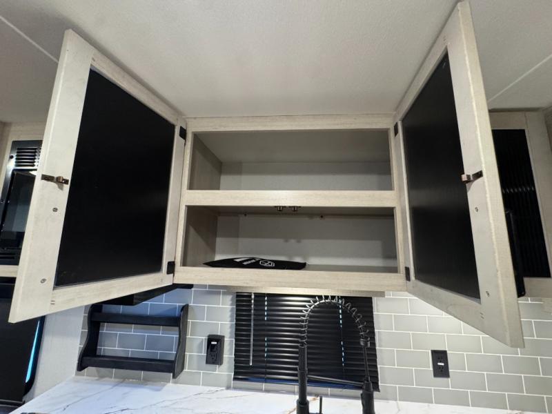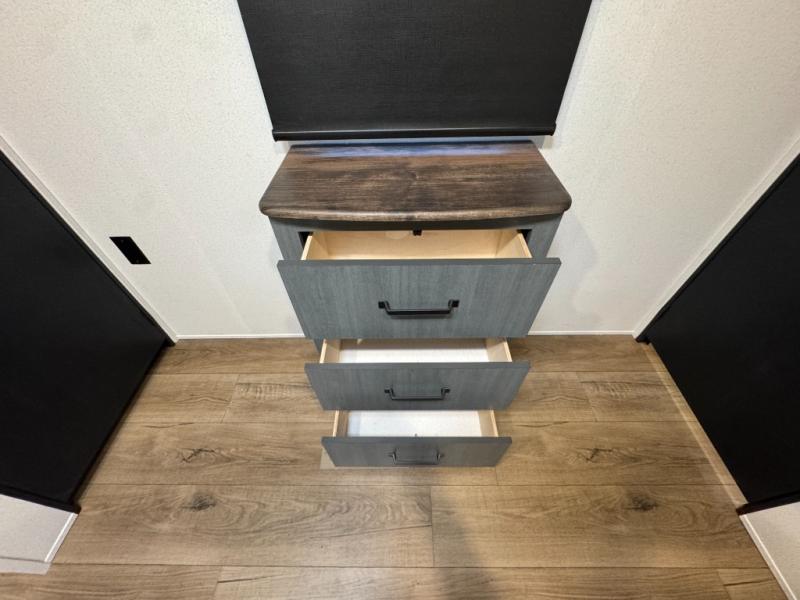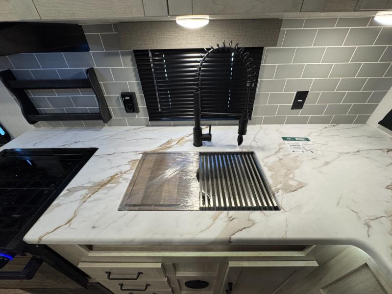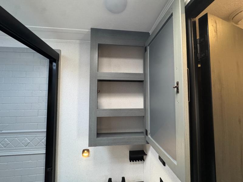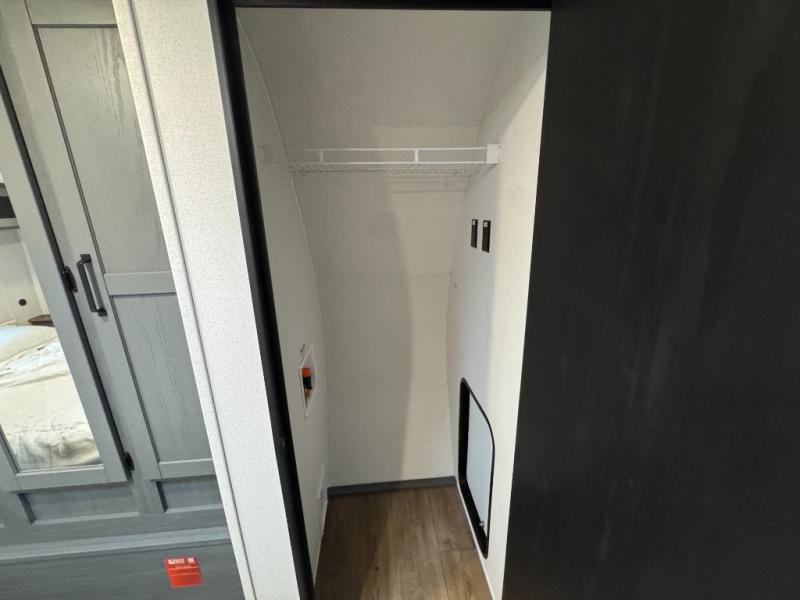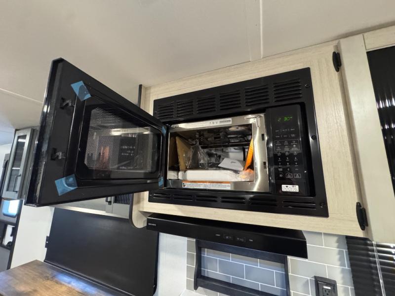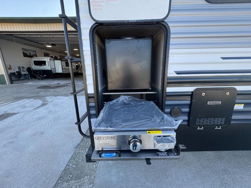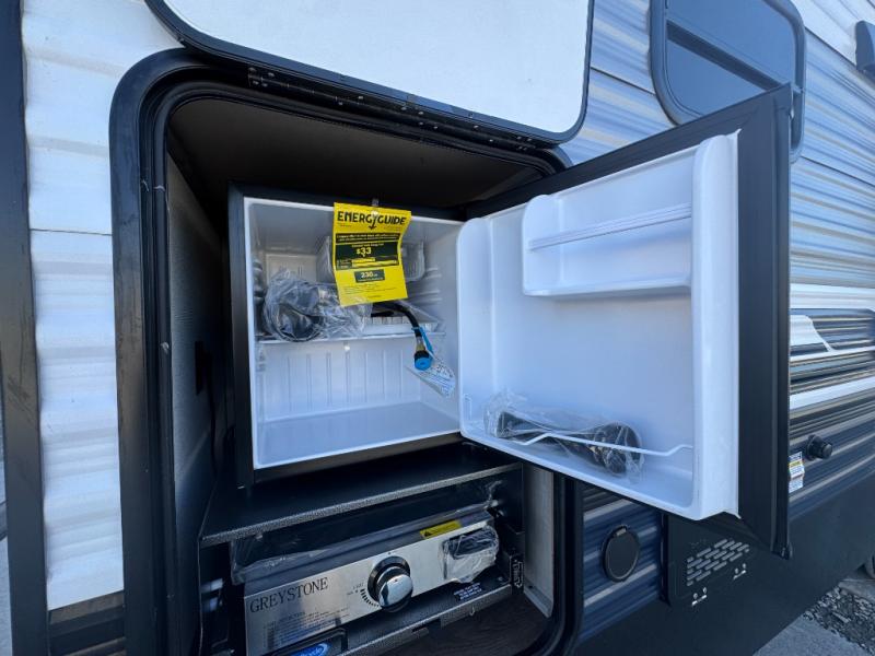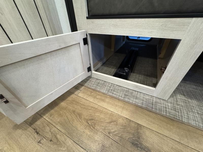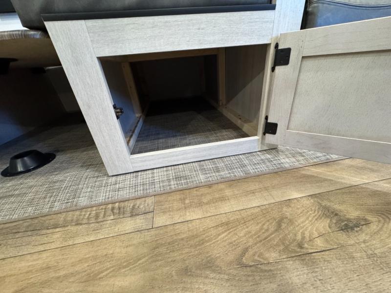You won't want to camp any other way once you step inside this travel trailer! The rear kitchen has a stainless-steel oven and range to prepare your best meals, a 12V refrigerator to keep your perishables fresh, and a walk-in pantry for your canned goods and snacks for movie night. After a fun day at the beach, you can play a card game at the booth dinette, relax on the theater seating and sofa, or rinse the sand out of your hair in the 32" x 40" shower with a seat in the full bathroom. There is also a front private bedroom with a queen bed slide across from a dresser and a front closet with another closet with washer and dryer prep.