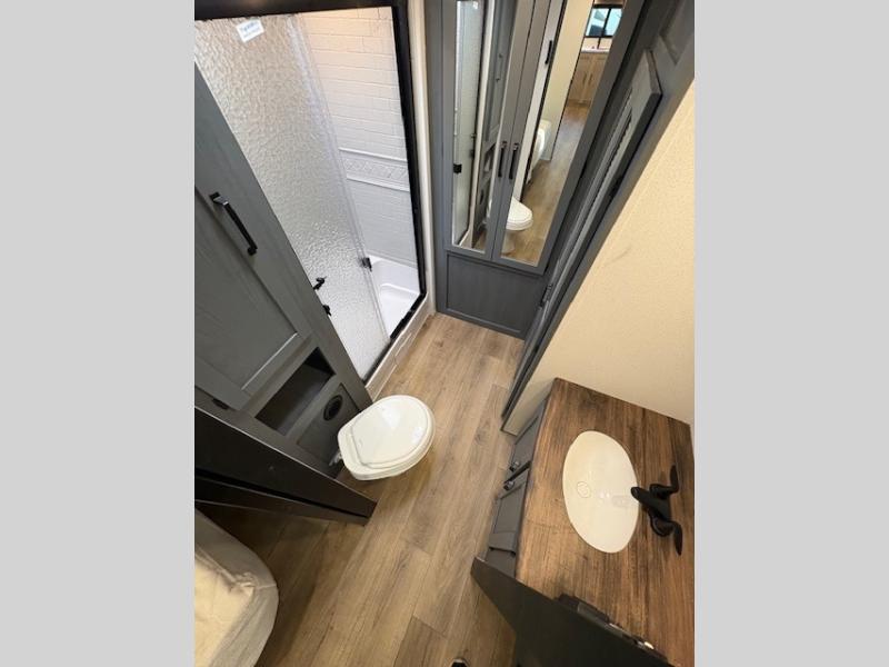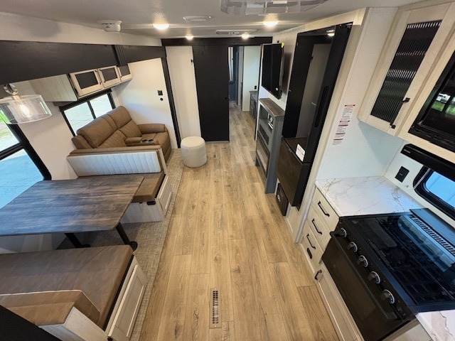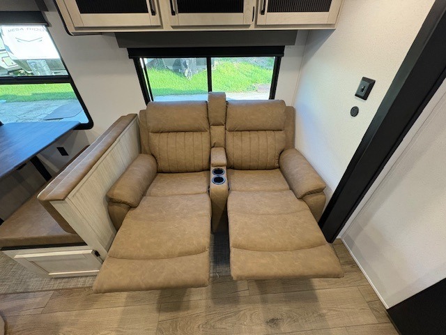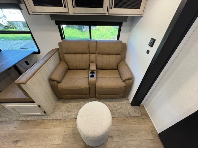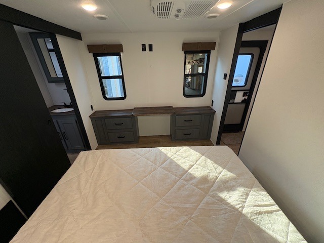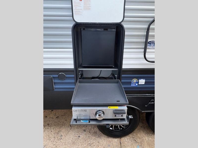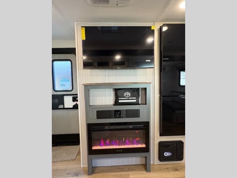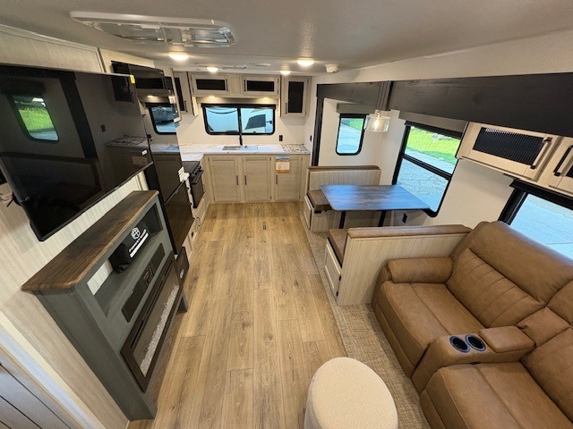 You'll love camping in this double slide out travel trailer with a rear kitchen and a spacious front bath! There is a 40" shower here, along with a linen closet, shirt closet, plus a closet with washer/dryer prep. The master bedroom includes a king bed slide out, dual bedroom dressers, a desk and a TV hookup if you want the option to watch movies in bed. The combined kitchen and living area is made open by the large slide out, which houses the sofa and booth dinette. These pieces of furniture area conveniently across from the entertainment center and fireplace to make it feel more like home. The chef of your group will appreciate generous counter space in the rear kitchen, and if they like to cook outdoors, and optional mini kitchen with a griddle can be added!