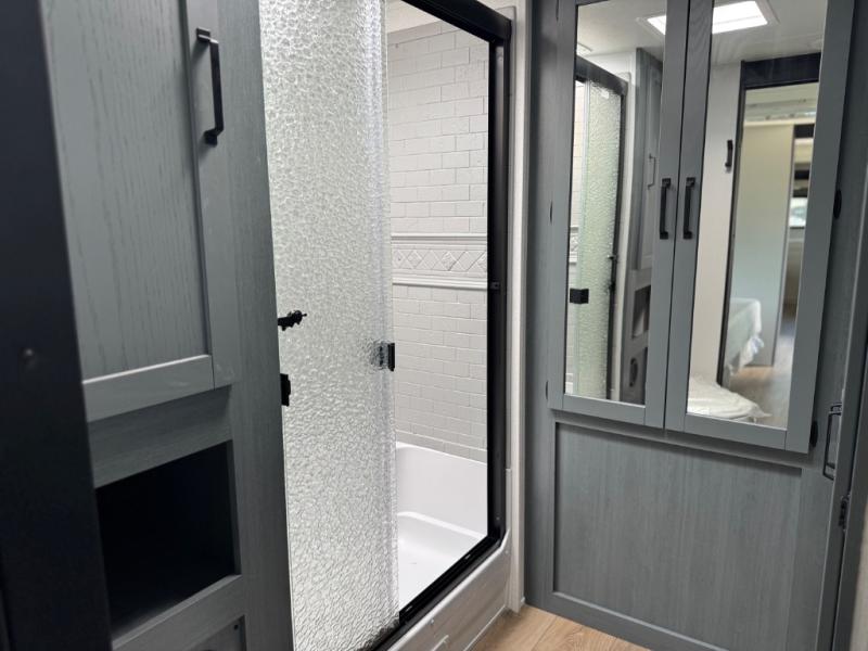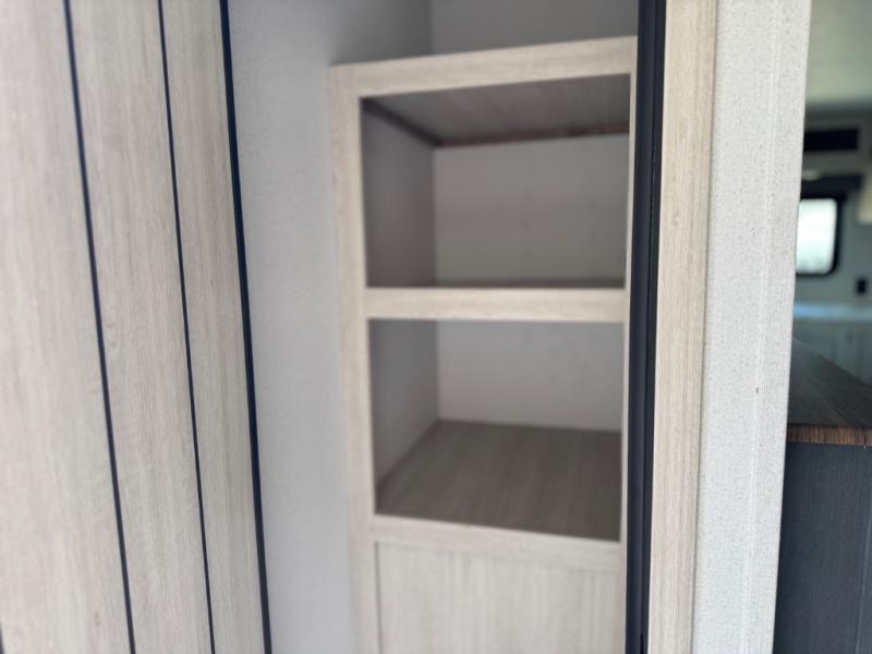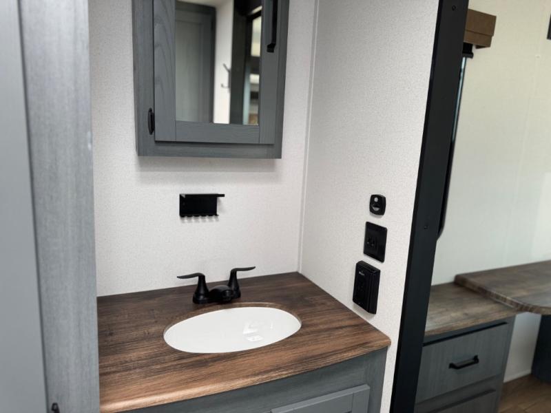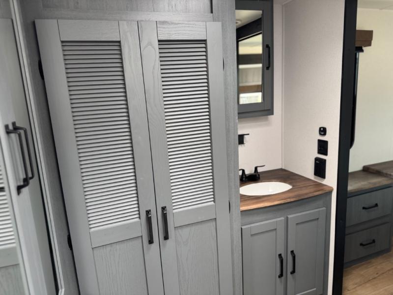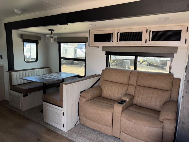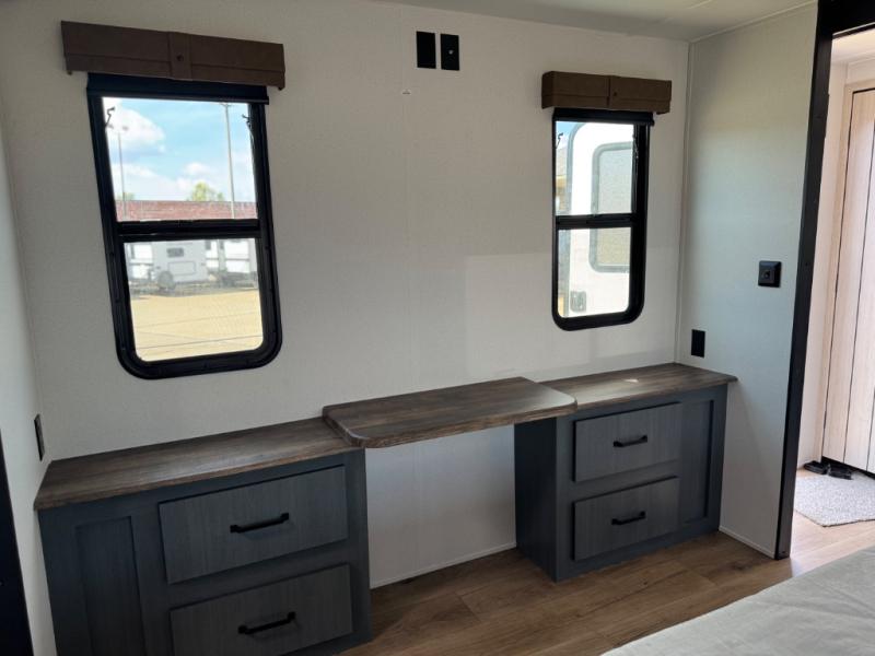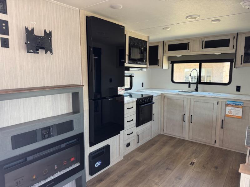 You'll love camping in this double slide out travel trailer with a rear kitchen and a spacious front bath! There is a 40" shower here, along with a linen closet, shirt closet, plus a closet with washer/dryer prep. The master bedroom includes a king bed slide out, dual bedroom dressers, a desk and a TV hookup if you want the option to watch movies in bed. The combined kitchen and living area is made open by the large slide out, which houses the sofa and booth dinette. These pieces of furniture area conveniently across from the entertainment center and fireplace to make it feel more like home. The chef of your group will appreciate generous counter space in the rear kitchen, and if they like to cook outdoors, and optional mini kitchen with a griddle can be added!
