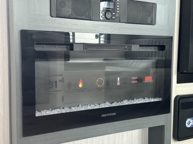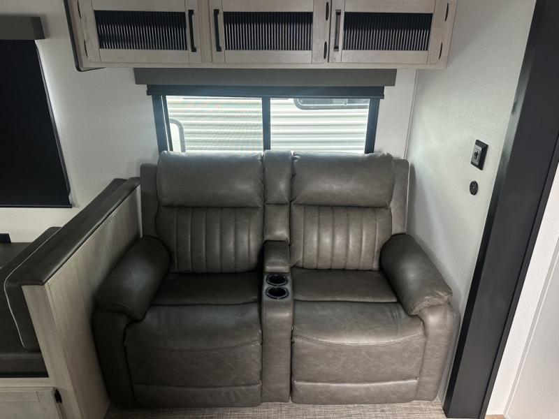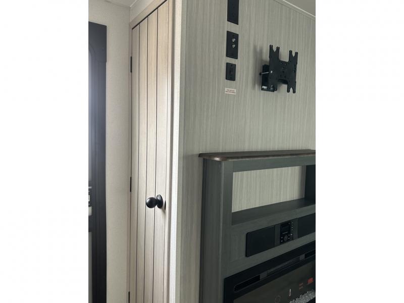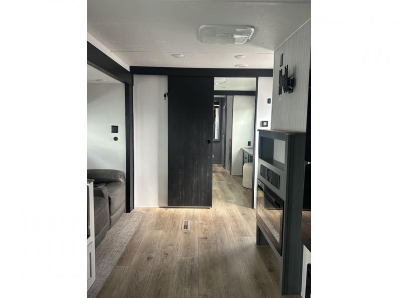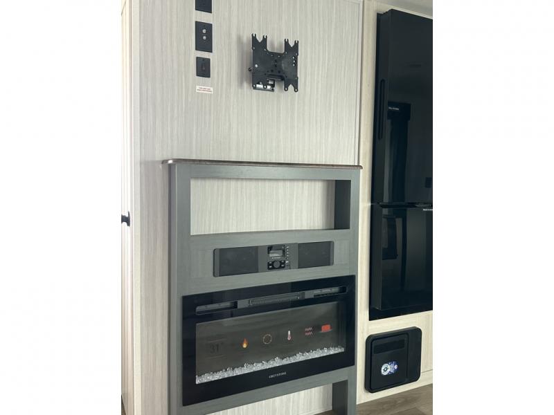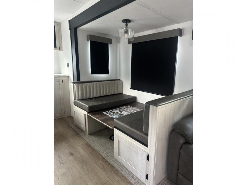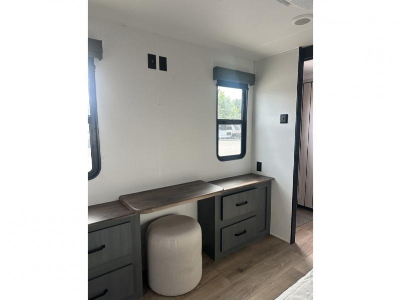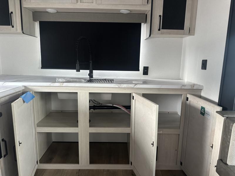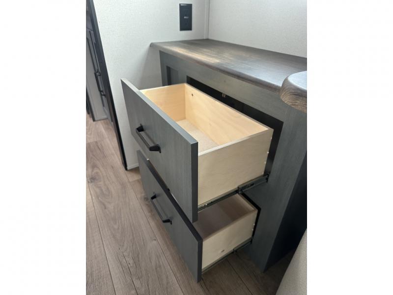 You'll love camping in this double slide out travel trailer with a rear kitchen and a spacious front bath! There is a 40" shower here, along with a linen closet, shirt closet, plus a closet with washer/dryer prep. The master bedroom includes a king bed slide out, dual bedroom dressers, a desk and a TV hookup if you want the option to watch movies in bed. The combined kitchen and living area is made open by the large slide out, which houses the sofa and booth dinette. These pieces of furniture area conveniently across from the entertainment center and fireplace to make it feel more like home. The chef of your group will appreciate generous counter space in the rear kitchen, and if they like to cook outdoors, and optional mini kitchen with a griddle can be added!