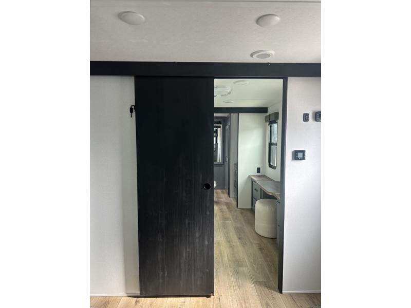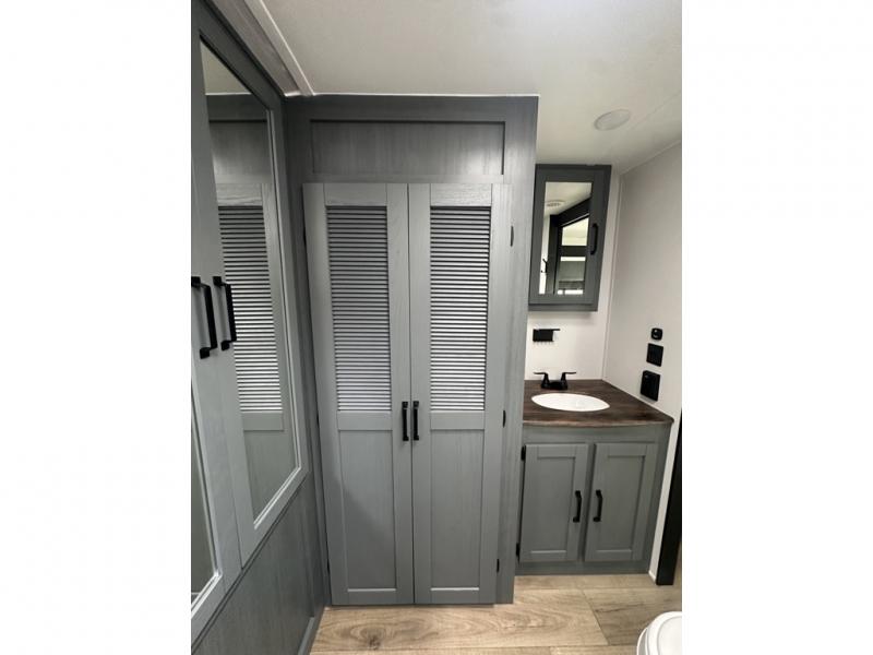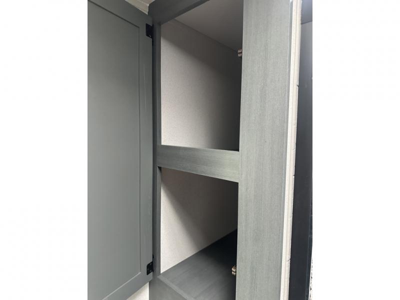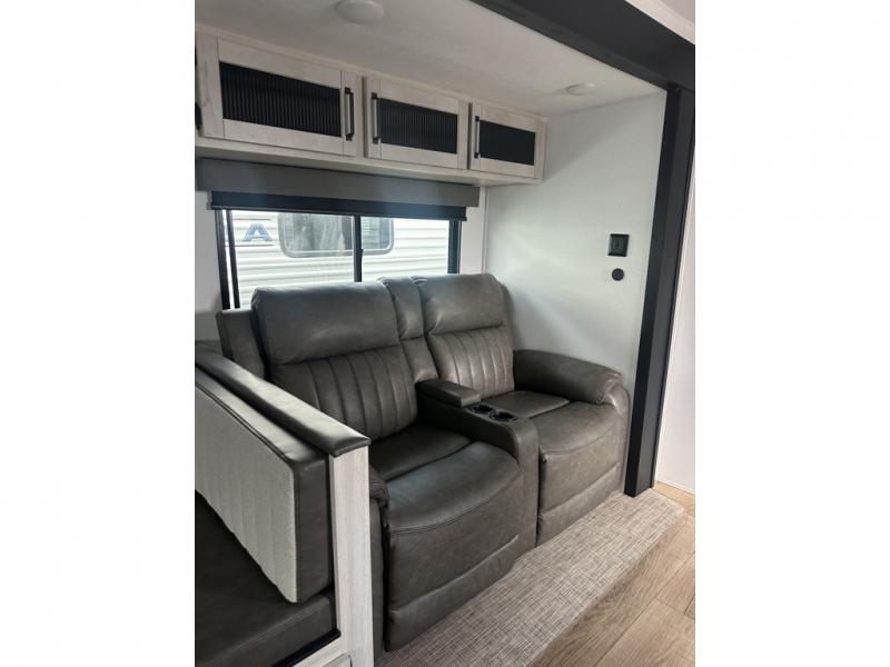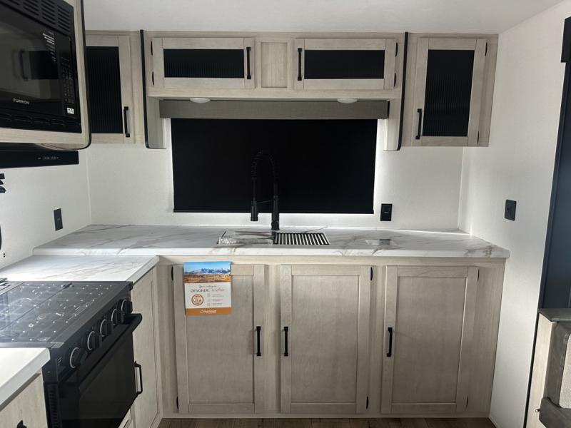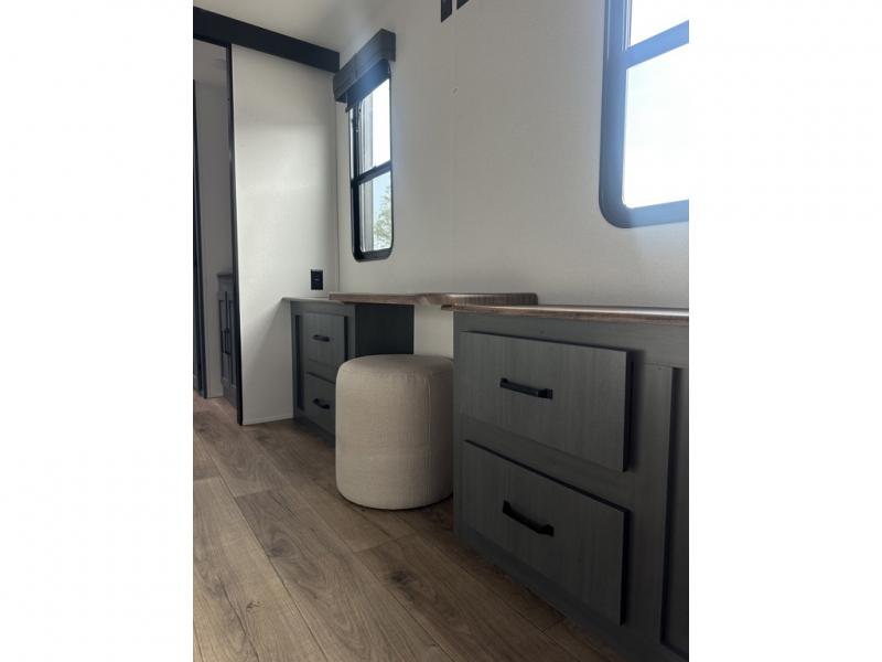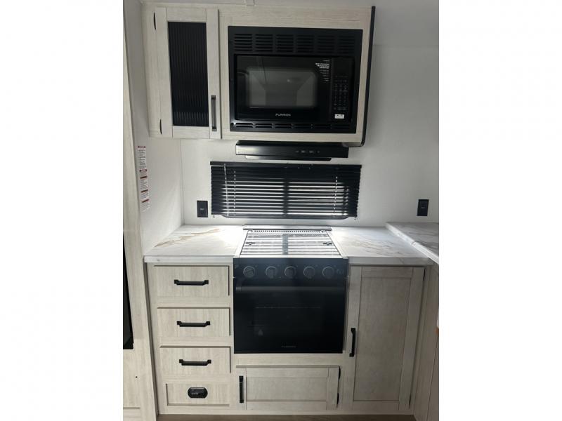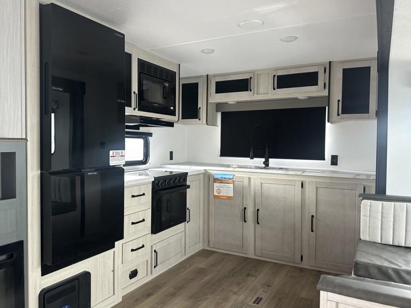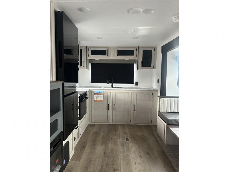You'll love camping in this double slide out travel trailer with a rear kitchen and a spacious front bath! There is a 40" shower here, along with a linen closet, shirt closet, plus a closet with washer/dryer prep. The master bedroom includes a king bed slide out, dual bedroom dressers, a desk and a TV hookup if you want the option to watch movies in bed. The combined kitchen and living area is made open by the large slide out, which houses the sofa and booth dinette. These pieces of furniture area conveniently across from the entertainment center and fireplace to make it feel more like home. The chef of your group will appreciate generous counter space in the rear kitchen, and if they like to cook outdoors, and optional mini kitchen with a griddle can be added!