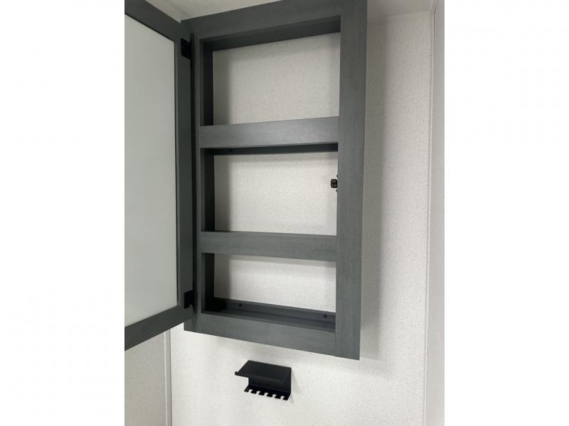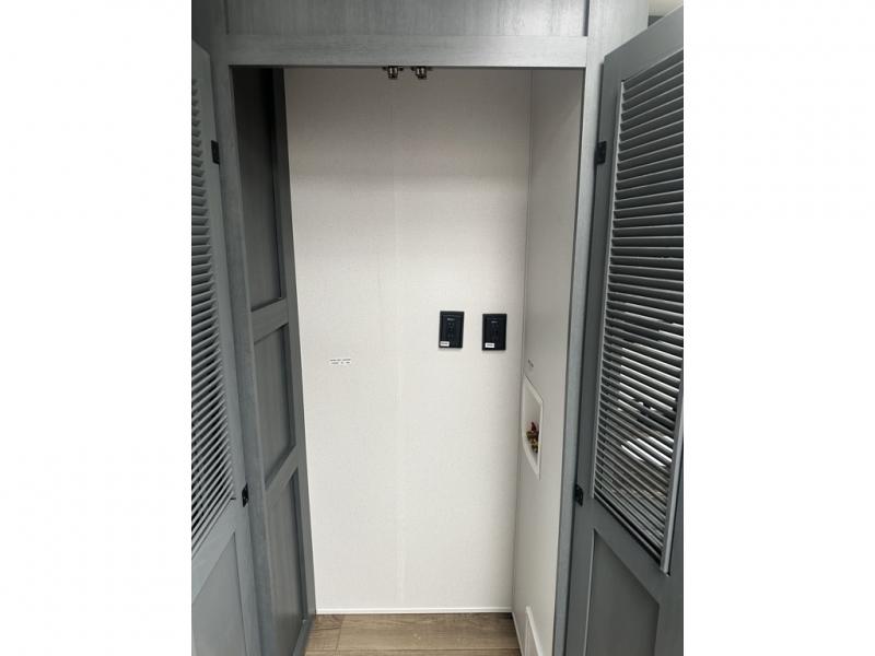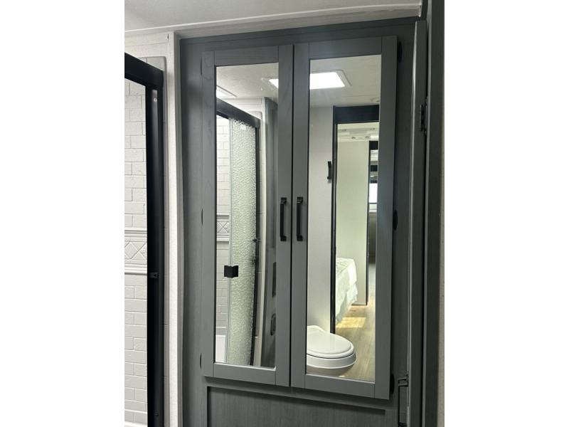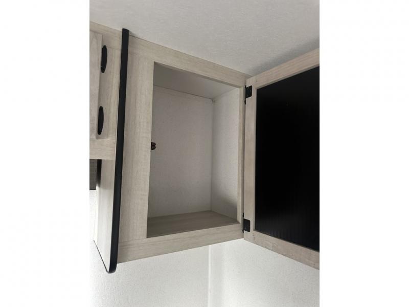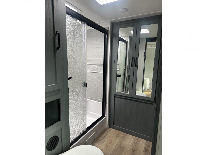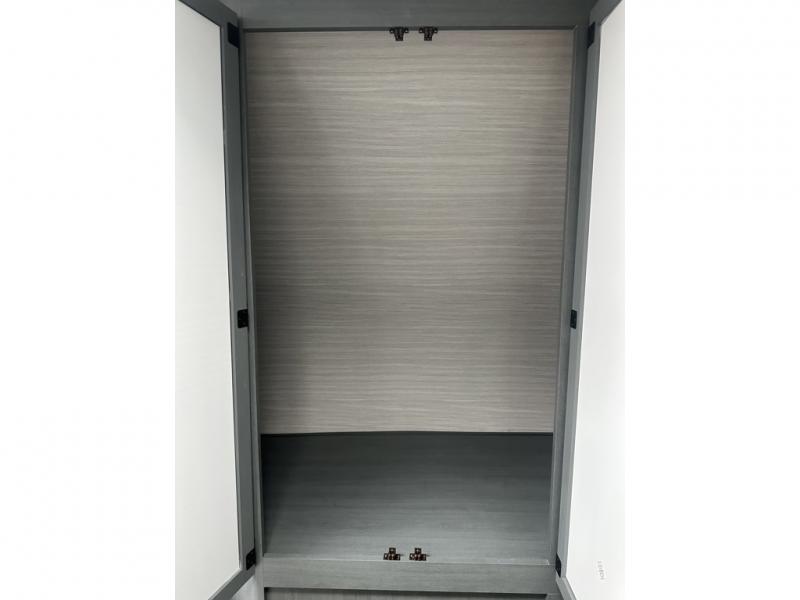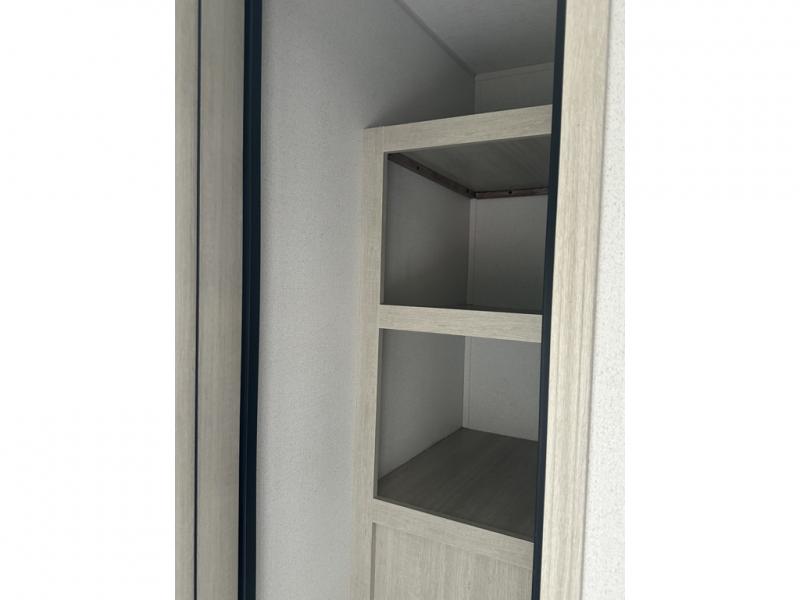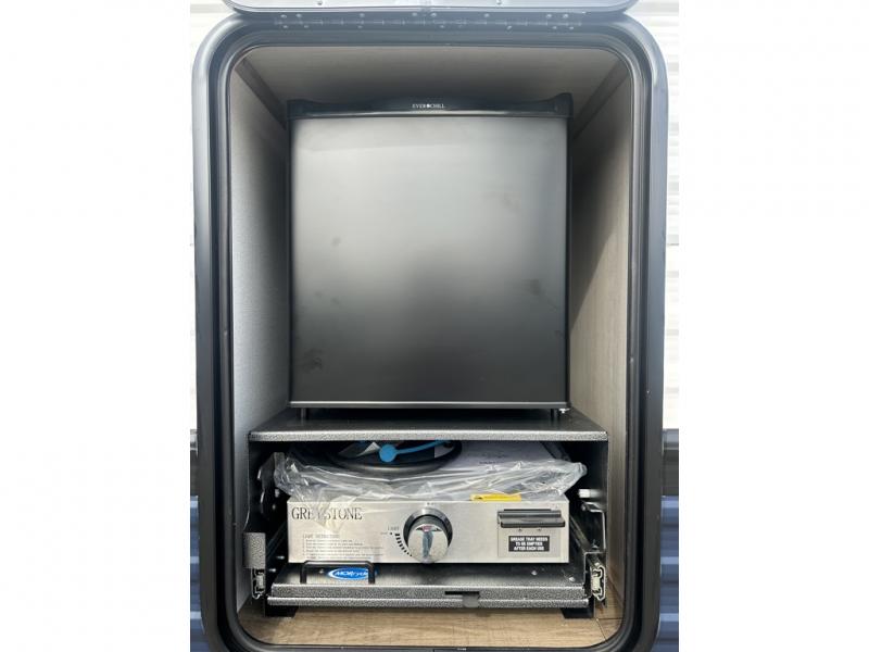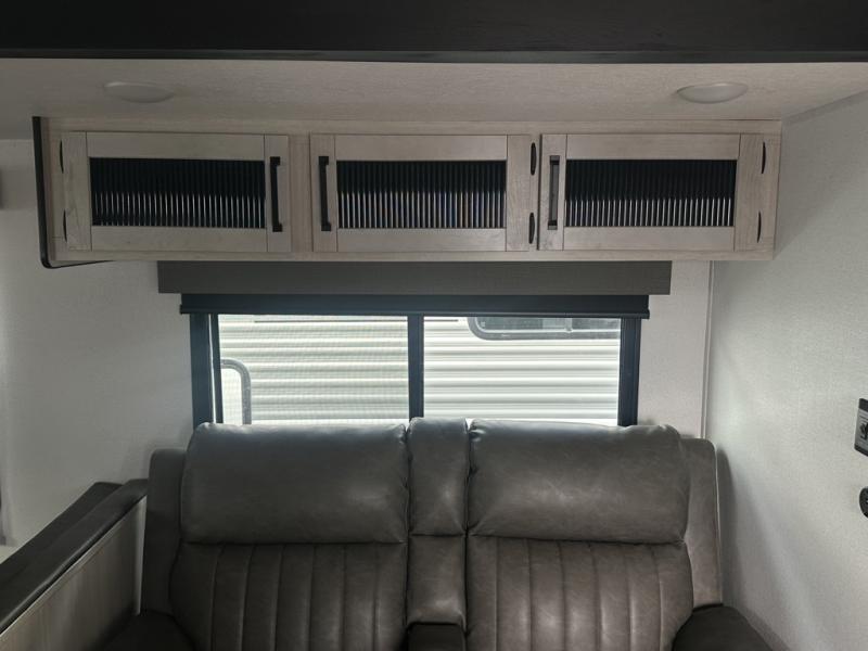 You'll love camping in this double slide out travel trailer with a rear kitchen and a spacious front bath! There is a 40" shower here, along with a linen closet, shirt closet, plus a closet with washer/dryer prep. The master bedroom includes a king bed slide out, dual bedroom dressers, a desk and a TV hookup if you want the option to watch movies in bed. The combined kitchen and living area is made open by the large slide out, which houses the sofa and booth dinette. These pieces of furniture area conveniently across from the entertainment center and fireplace to make it feel more like home. The chef of your group will appreciate generous counter space in the rear kitchen, and if they like to cook outdoors, and optional mini kitchen with a griddle can be added!