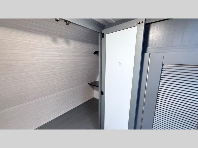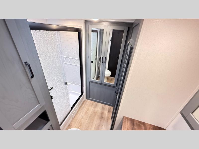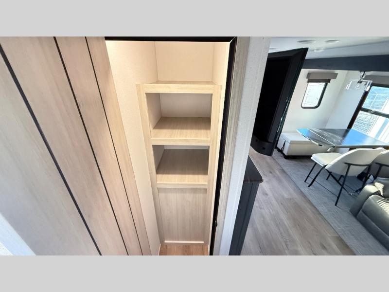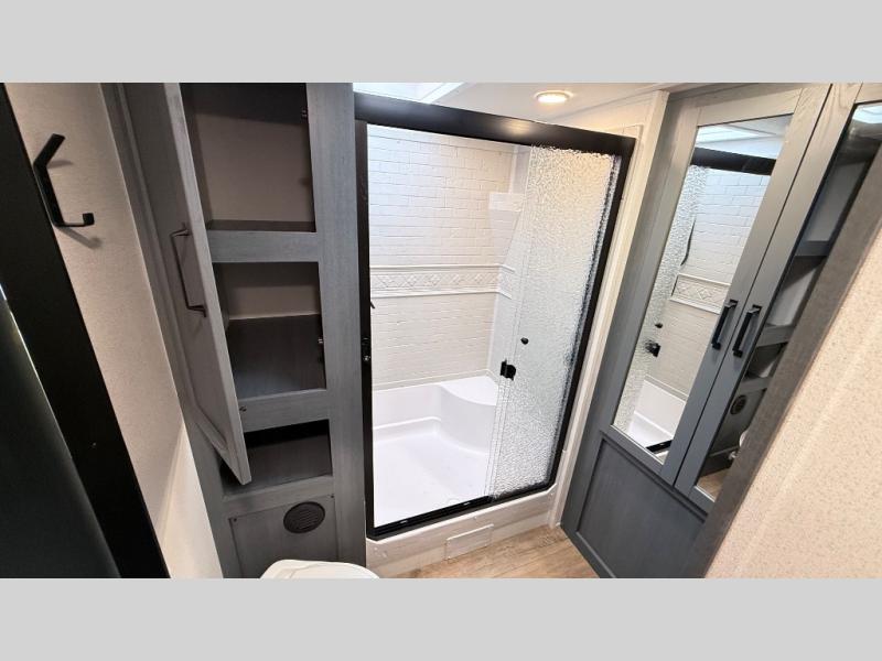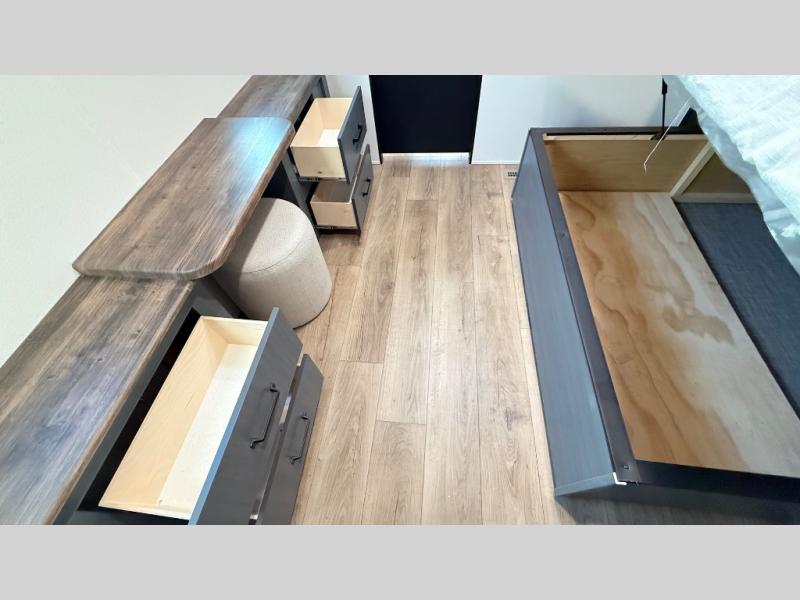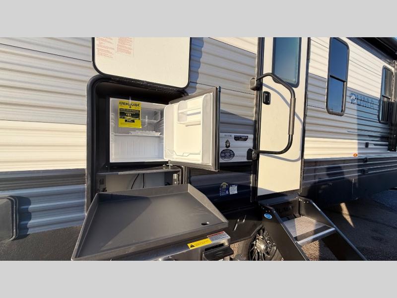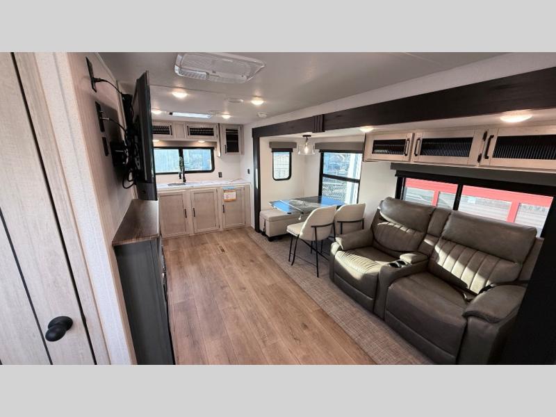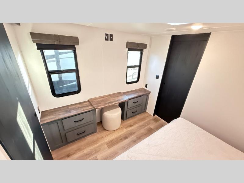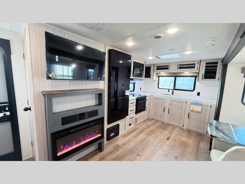 You'll love camping in this double slide out travel trailer with a rear kitchen and a spacious front bath! There is a 40" shower here, along with a linen closet, shirt closet, plus a closet with washer/dryer prep. The master bedroom includes a king bed slide out, dual bedroom dressers, a desk and a TV hookup if you want the option to watch movies in bed. The combined kitchen and living area is made open by the large slide out, which houses the sofa and booth dinette. These pieces of furniture area conveniently across from the entertainment center and fireplace to make it feel more like home. The chef of your group will appreciate generous counter space in the rear kitchen, and if they like to cook outdoors, and optional mini kitchen with a griddle can be added!
