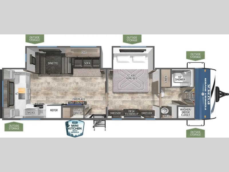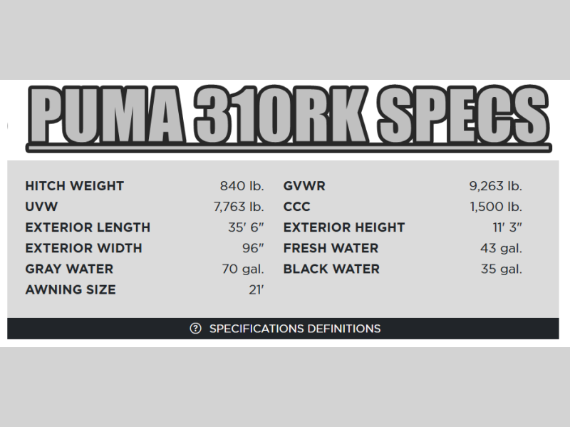 If you're looking for family-fun adventures, then you need one of these Forest River Puma travel trailers! They are built rugged, easy to tow, and jam packed with features. The Darco wrapped underbelly will help protect your unit, and the roof and side mount solar prep gives you the option to add off-grid power. Inside, the Congoleum linoleum will be easy to keep clean, and the night roller shades will provide privacy when it's time to turn in. You'll also enjoy an electric awning with an LED light strip plus an AM/FM/Bluetooth stereo and two outside speakers to keep the party going!