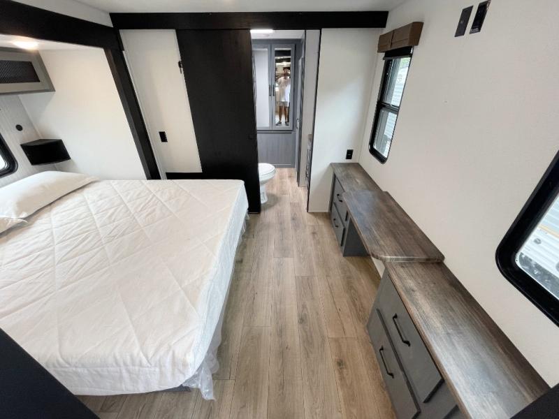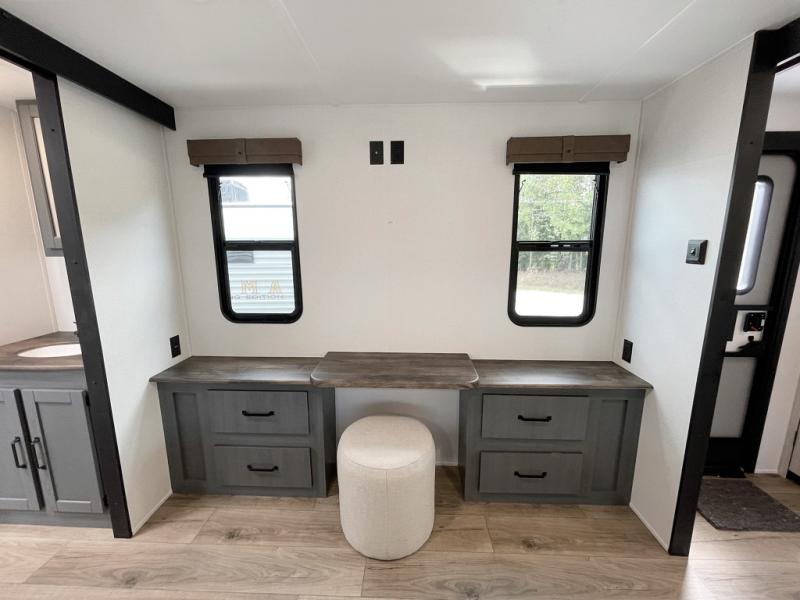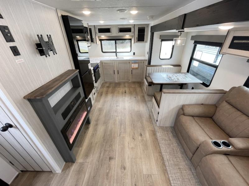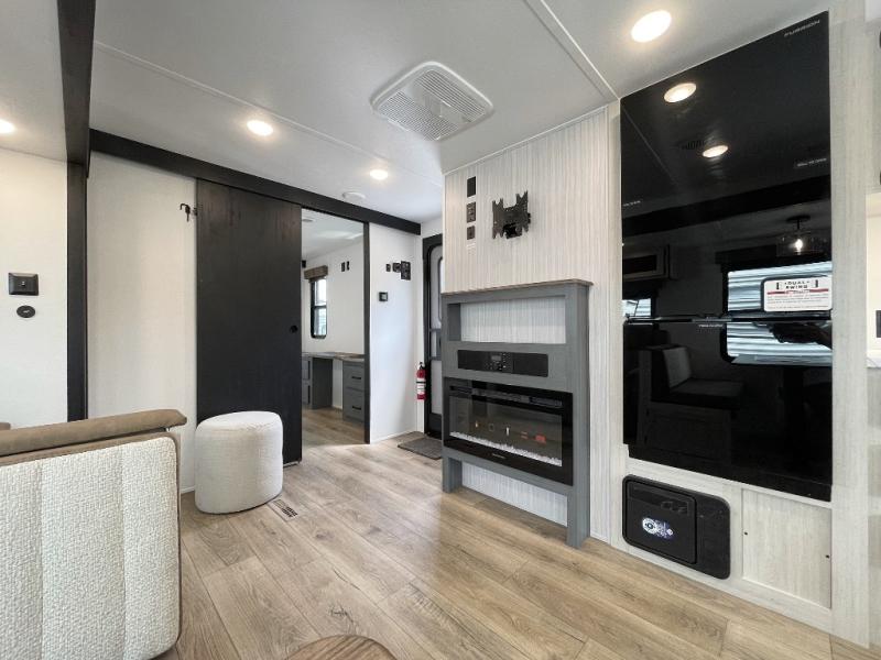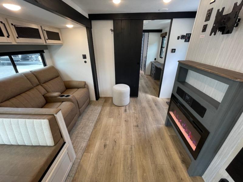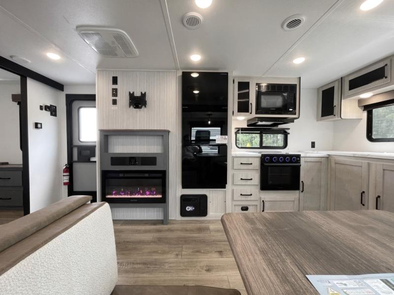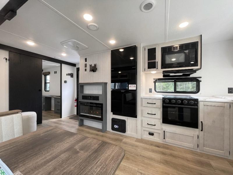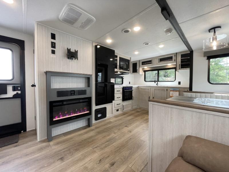 You'll love camping in this double slide out travel trailer with a rear kitchen and a spacious front bath! There is a 40" shower here, along with a linen closet, shirt closet, plus a closet with washer/dryer prep. The master bedroom includes a king bed slide out, dual bedroom dressers, a desk and a TV hookup if you want the option to watch movies in bed. The combined kitchen and living area is made open by the large slide out, which houses the sofa and booth dinette. These pieces of furniture area conveniently across from the entertainment center and fireplace to make it feel more like home. The chef of your group will appreciate generous counter space in the rear kitchen, and if they like to cook outdoors, and optional mini kitchen with a griddle can be added!