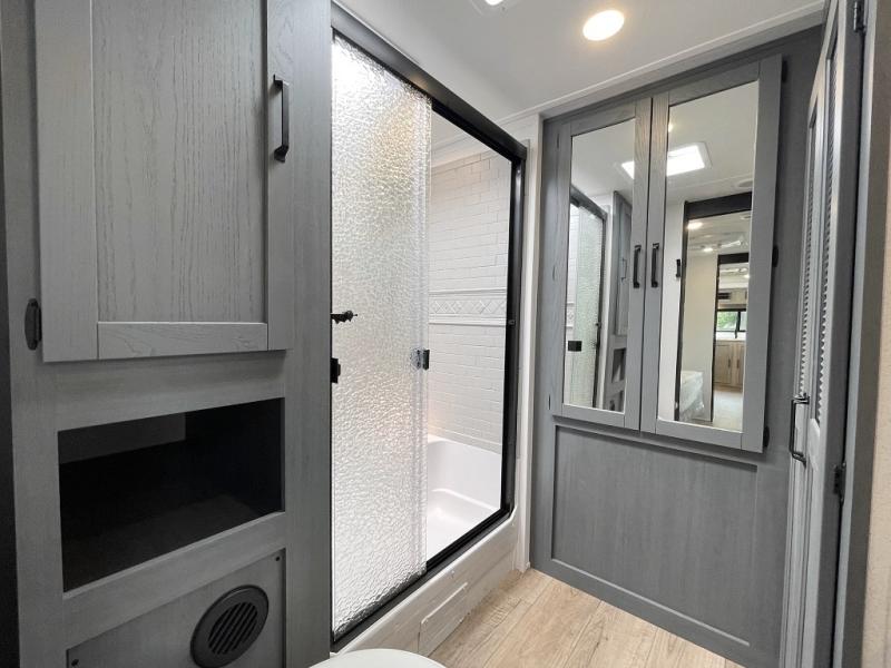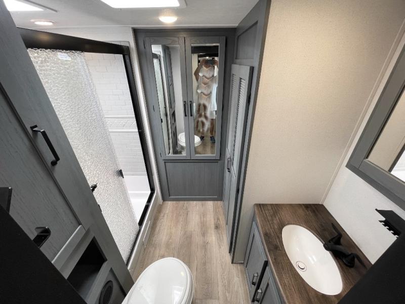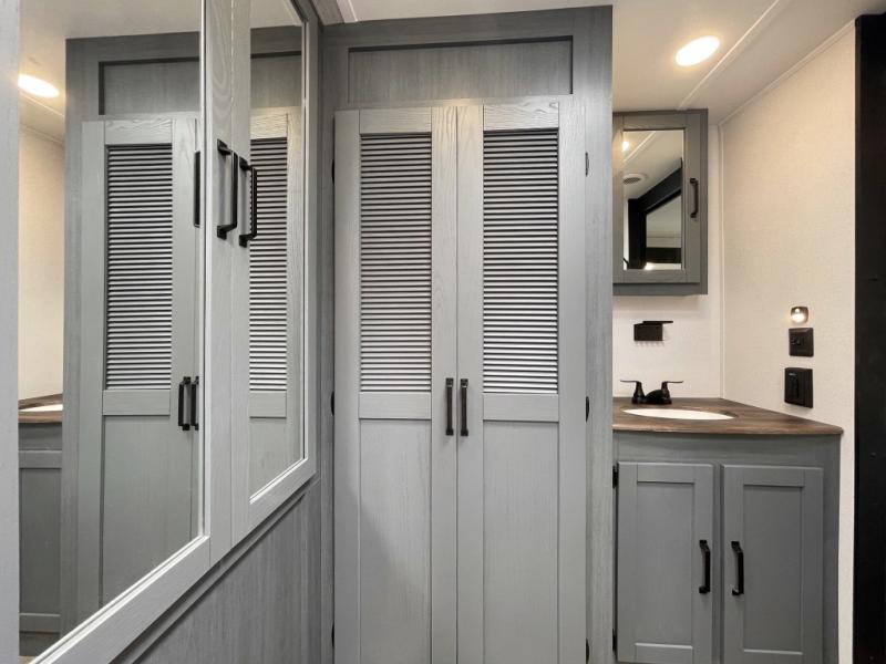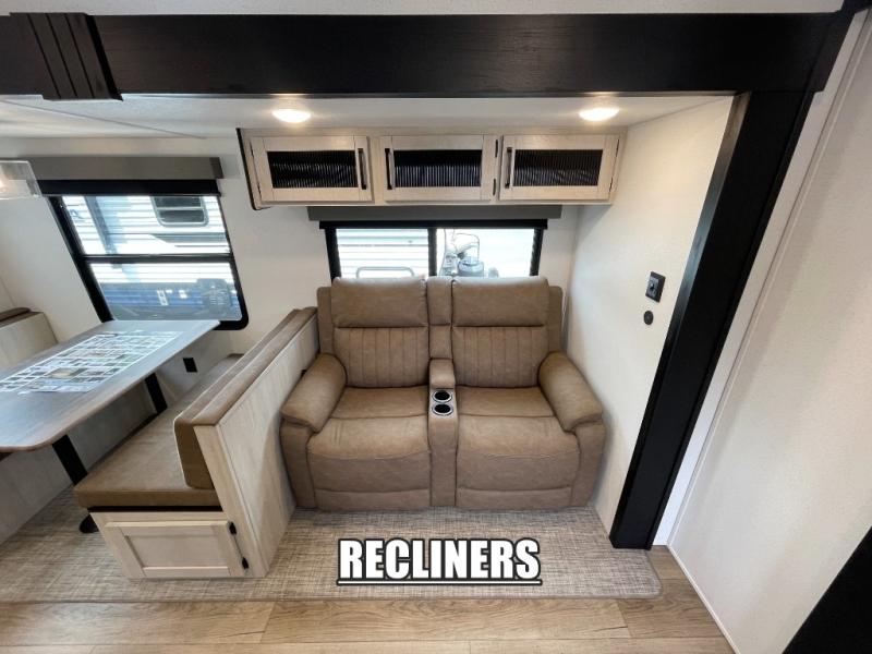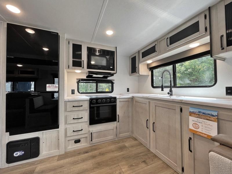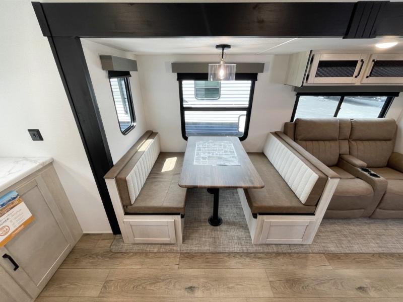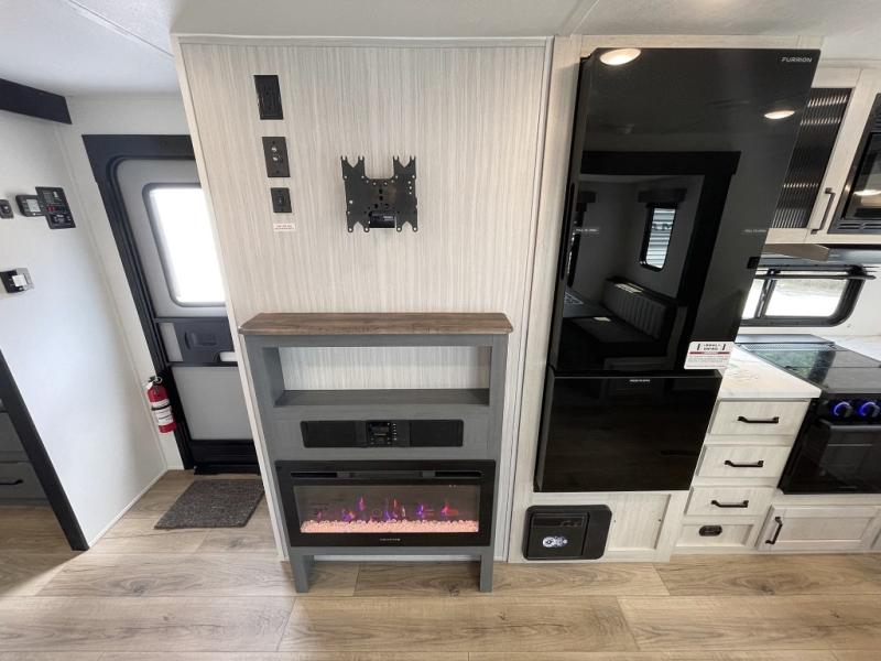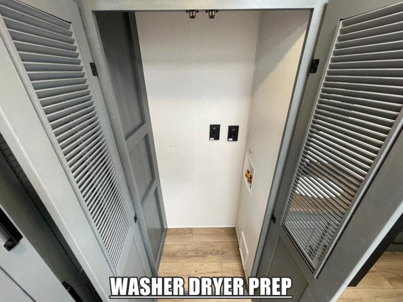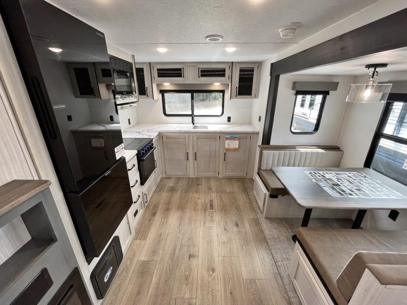 You'll love camping in this double slide out travel trailer with a rear kitchen and a spacious front bath! There is a 40" shower here, along with a linen closet, shirt closet, plus a closet with washer/dryer prep. The master bedroom includes a king bed slide out, dual bedroom dressers, a desk and a TV hookup if you want the option to watch movies in bed. The combined kitchen and living area is made open by the large slide out, which houses the sofa and booth dinette. These pieces of furniture area conveniently across from the entertainment center and fireplace to make it feel more like home. The chef of your group will appreciate generous counter space in the rear kitchen, and if they like to cook outdoors, and optional mini kitchen with a griddle can be added!