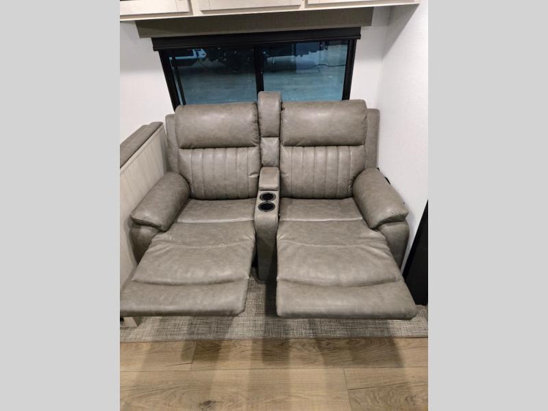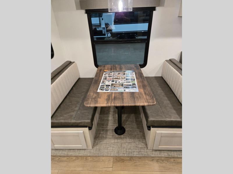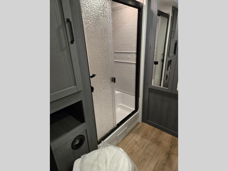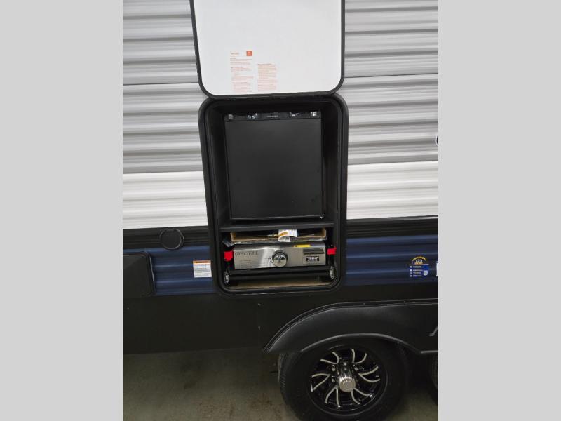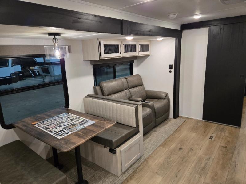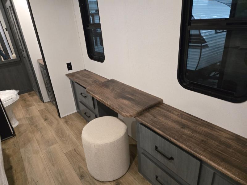 You'll love camping in this double slide out travel trailer with a rear kitchen and a spacious front bath! There is a 40" shower here, along with a linen closet, shirt closet, plus a closet with washer/dryer prep. The master bedroom includes a king bed slide out, dual bedroom dressers, a desk and a TV hookup if you want the option to watch movies in bed. The combined kitchen and living area is made open by the large slide out, which houses the sofa and booth dinette. These pieces of furniture area conveniently across from the entertainment center and fireplace to make it feel more like home. The chef of your group will appreciate generous counter space in the rear kitchen, and if they like to cook outdoors, and optional mini kitchen with a griddle can be added!