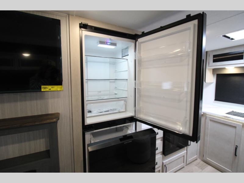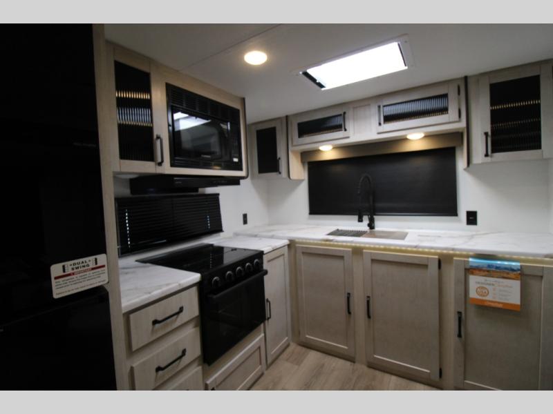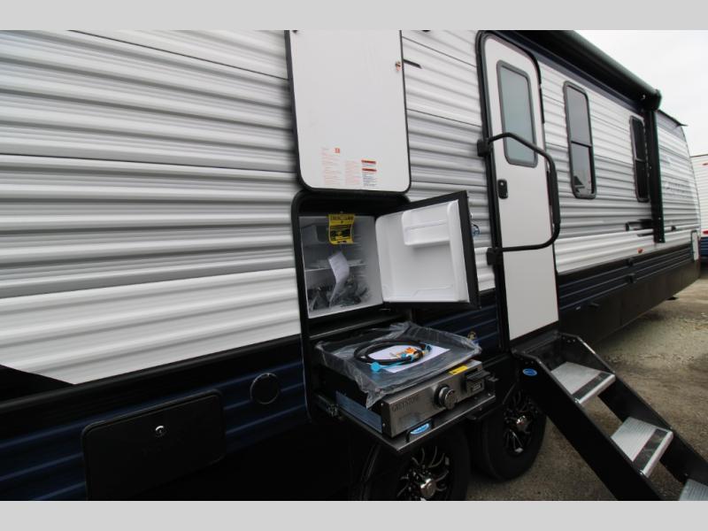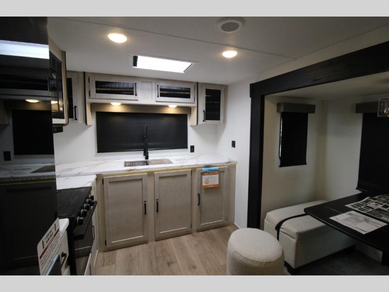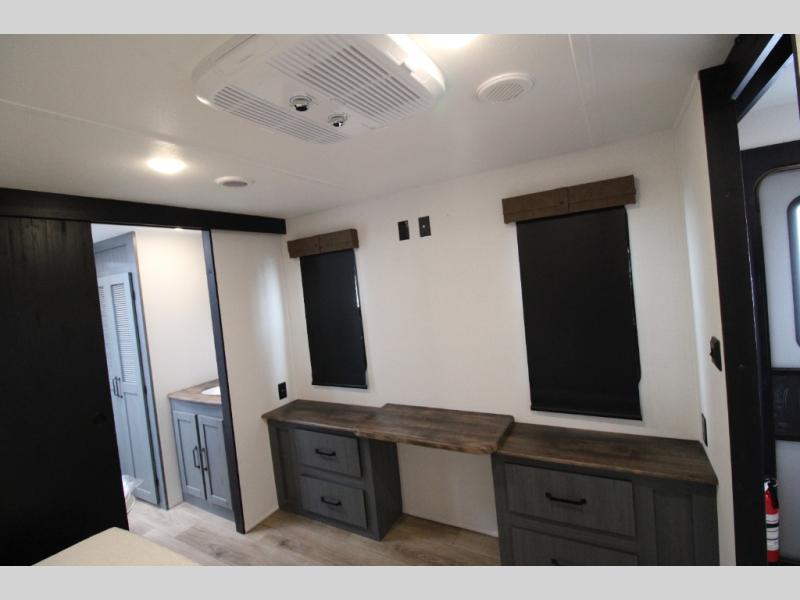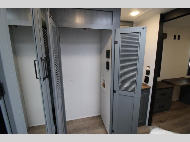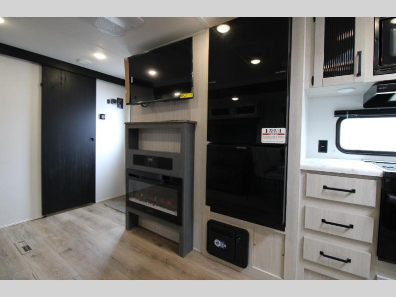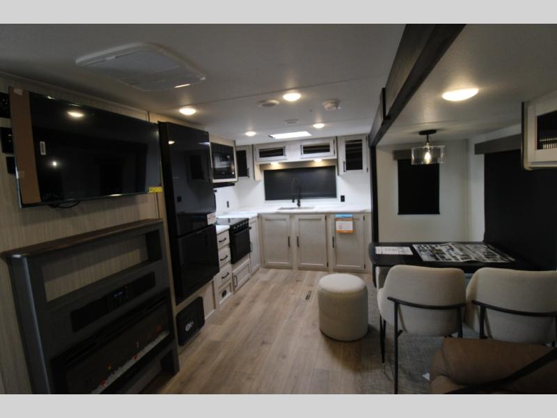 You'll love camping in this double slide out travel trailer with a rear kitchen and a spacious front bath! There is a 40" shower here, along with a linen closet, shirt closet, plus a closet with washer/dryer prep. The master bedroom includes a king bed slide out, dual bedroom dressers, a desk and a TV hookup if you want the option to watch movies in bed. The combined kitchen and living area is made open by the large slide out, which houses the sofa and booth dinette. These pieces of furniture area conveniently across from the entertainment center and fireplace to make it feel more like home. The chef of your group will appreciate generous counter space in the rear kitchen, and if they like to cook outdoors, and optional mini kitchen with a griddle can be added!